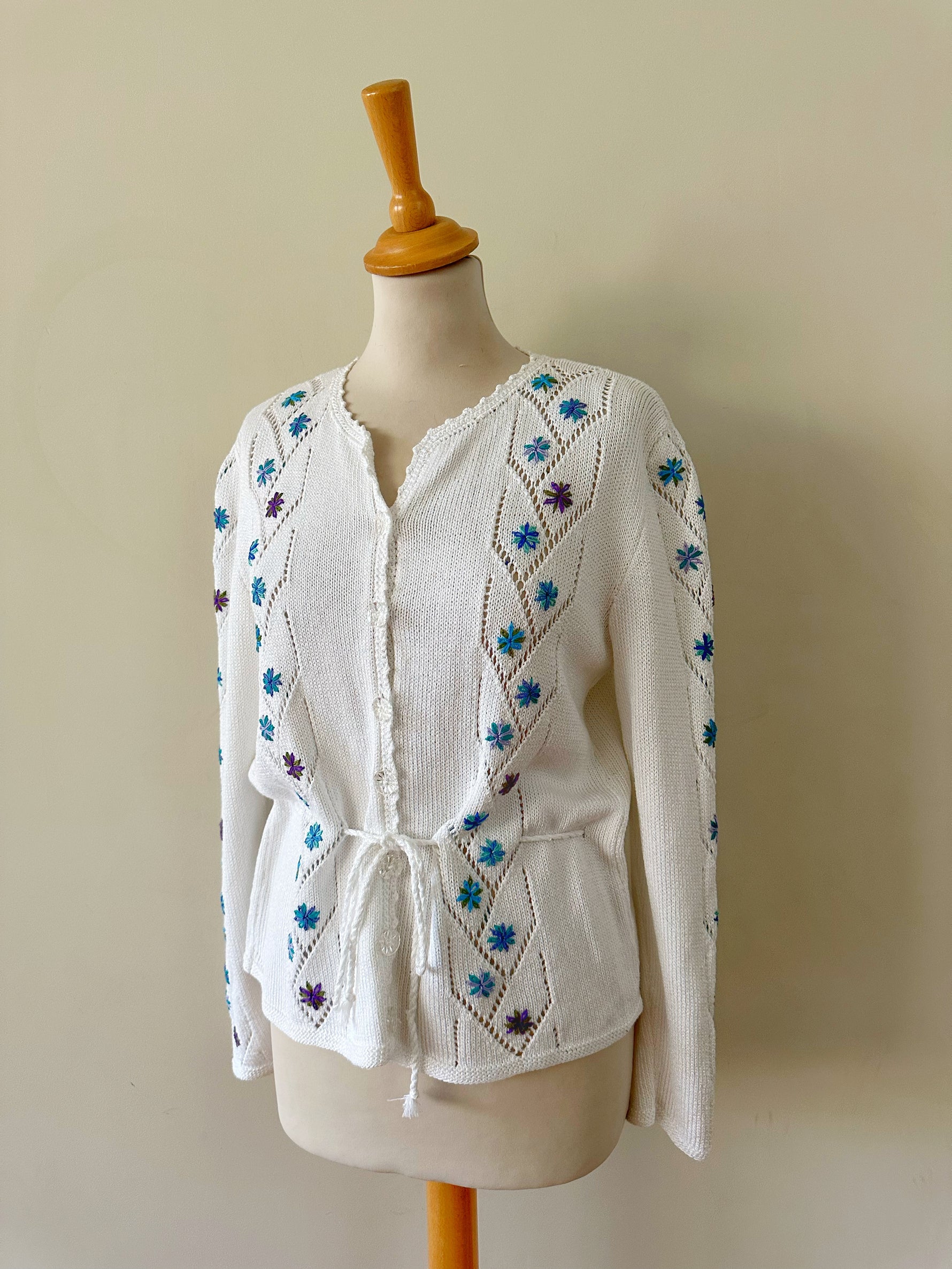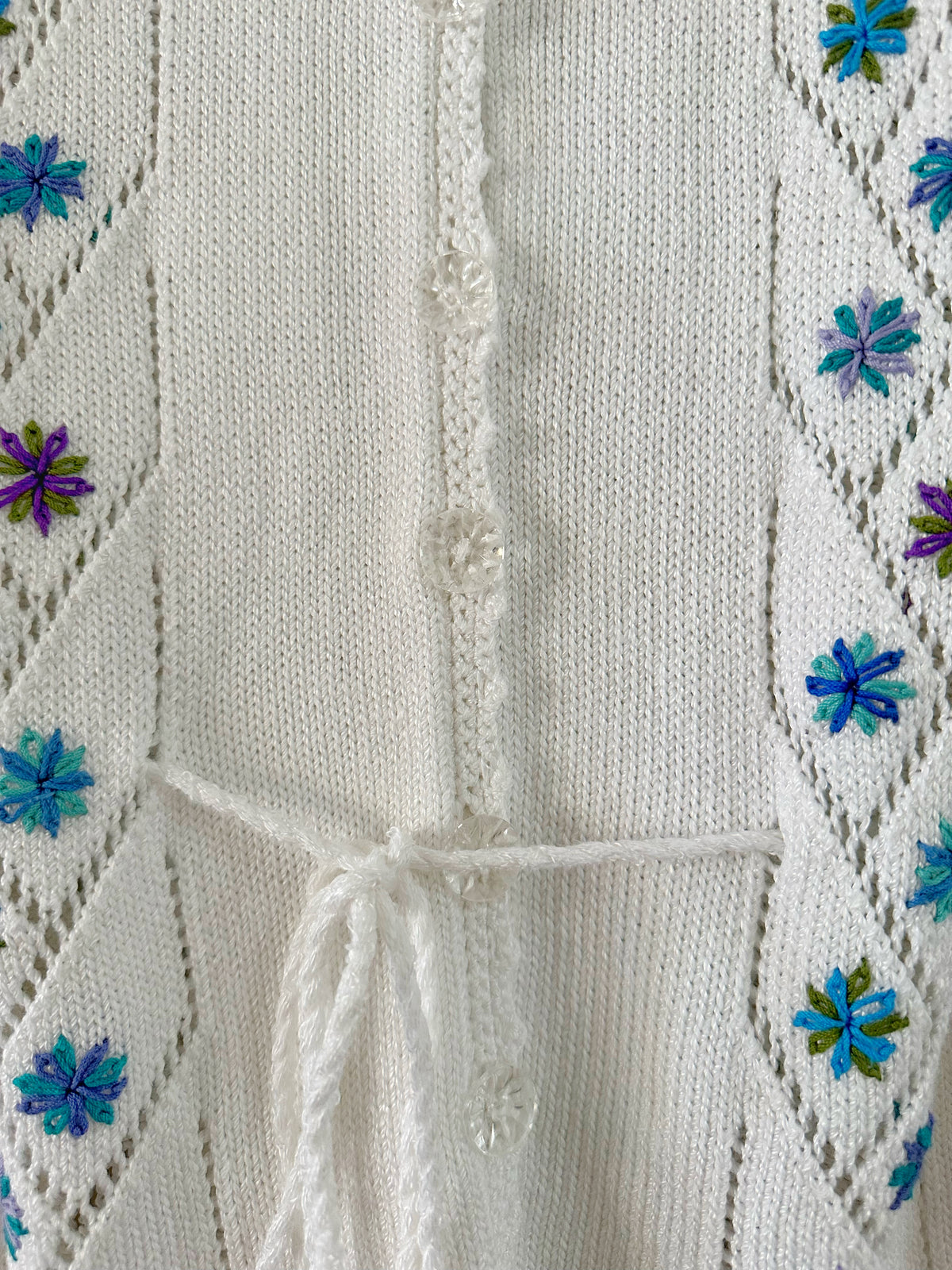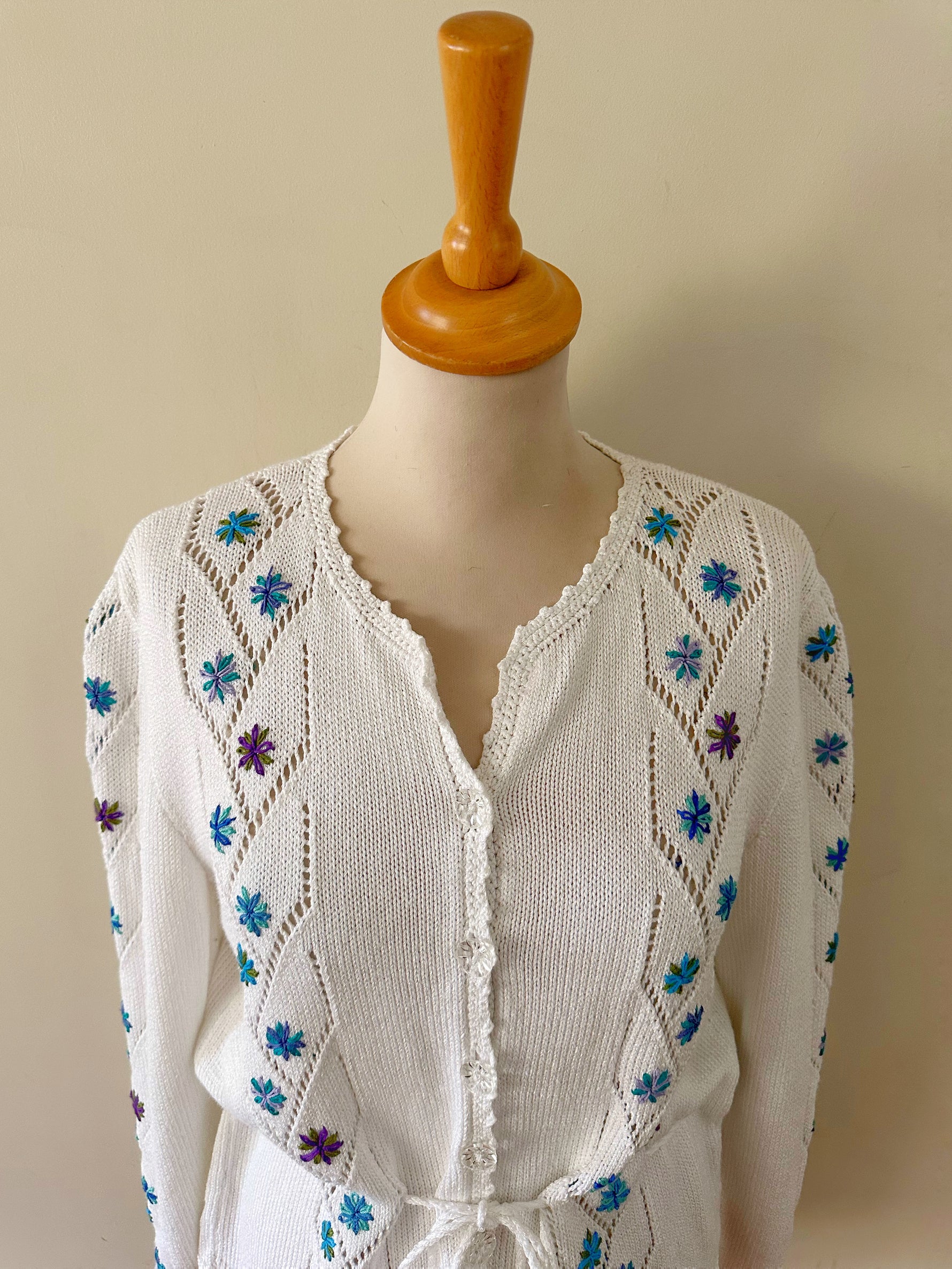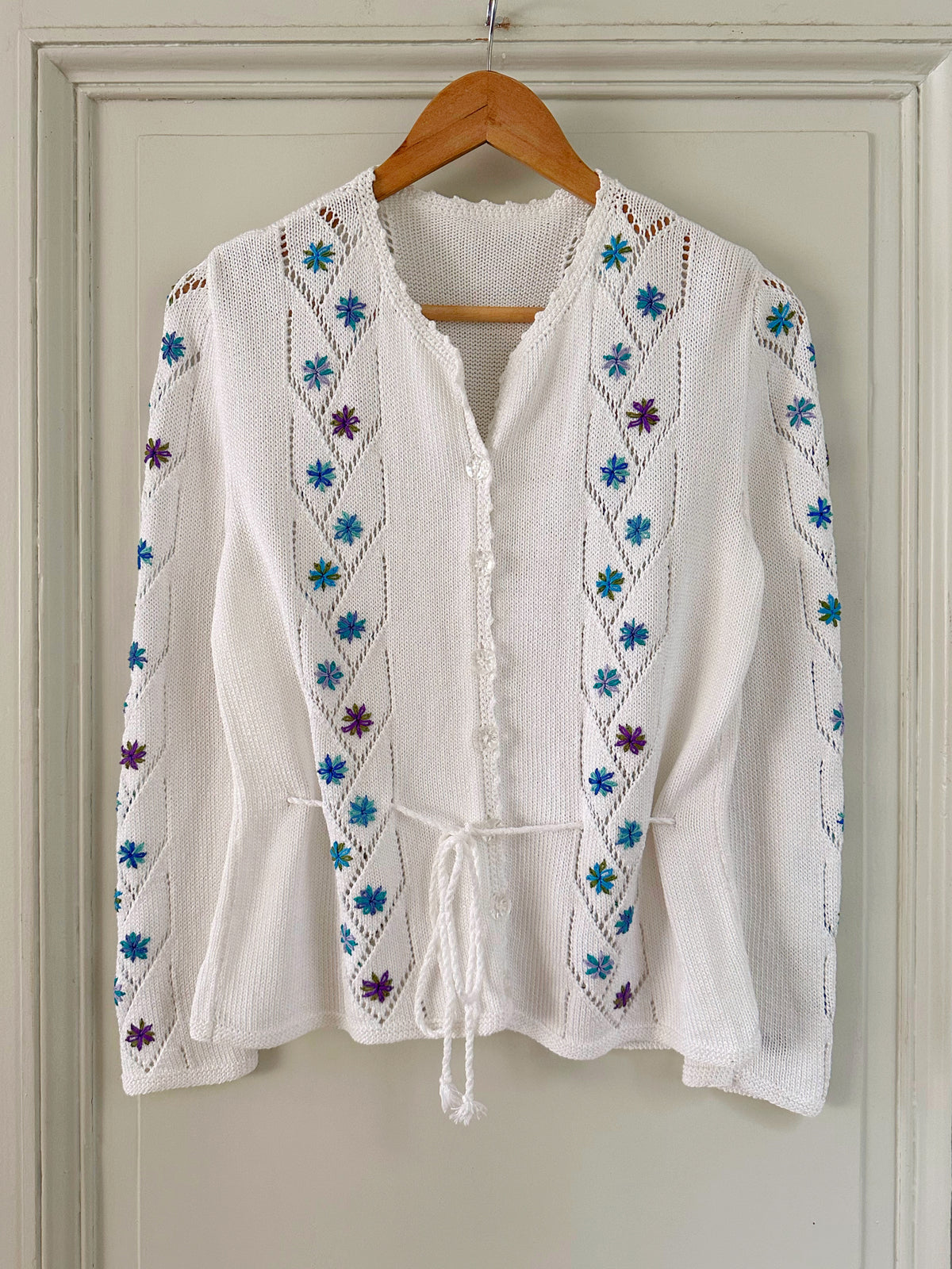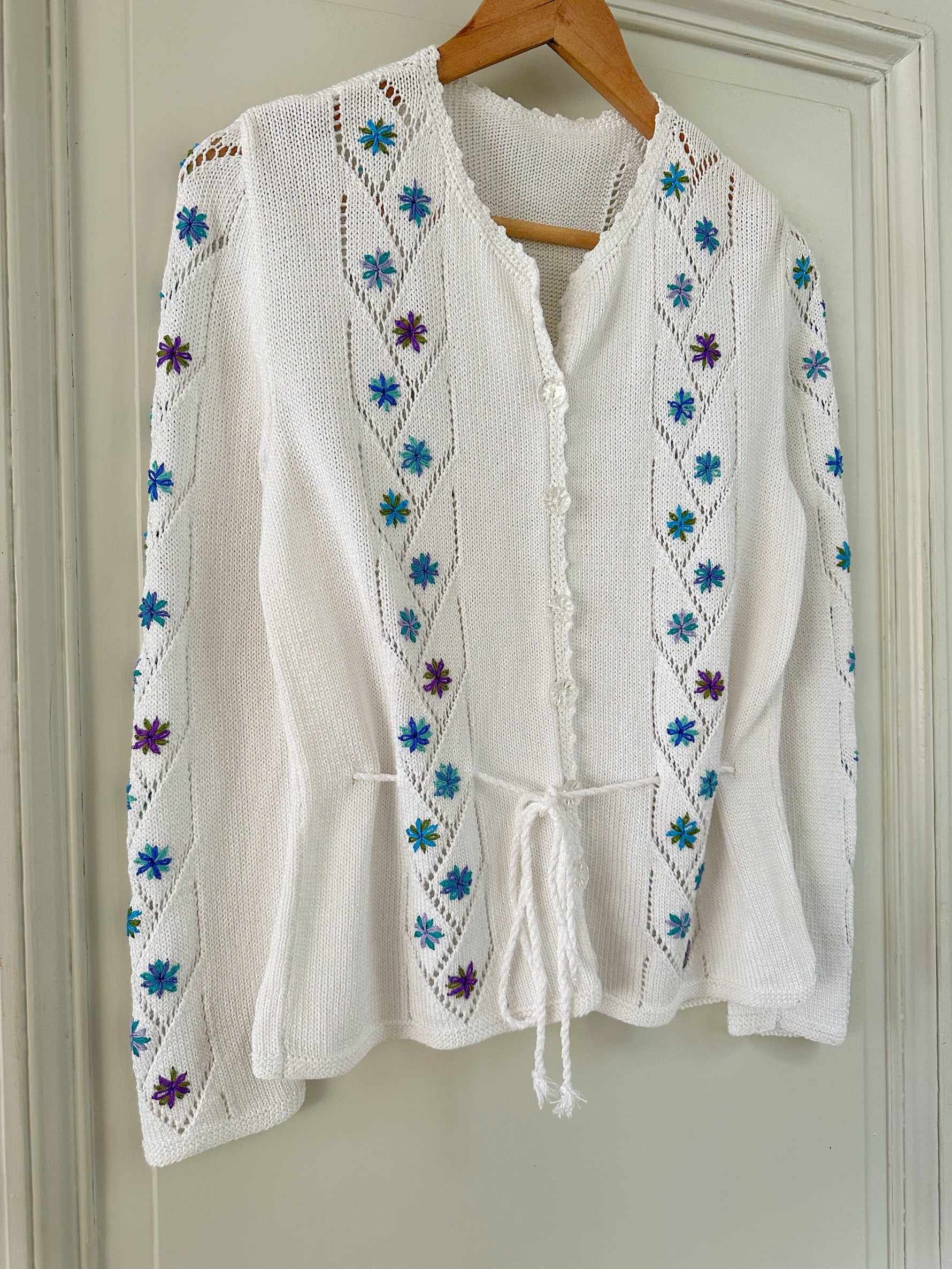 Prix unitaire parCardigan à fleurs en tricot 100% coton, maille ajourée esprit crochet, brodé de fleurs multicolores bleus violets, lilas, vertes. Cordon taille à nouer, bouton bijoux transparents fleuris, tricoté mains. Convient aux tailles 36 et 38 porté ici sur un mannequin T36. Aisselles 45cm Longueur 55cm.