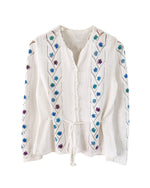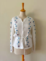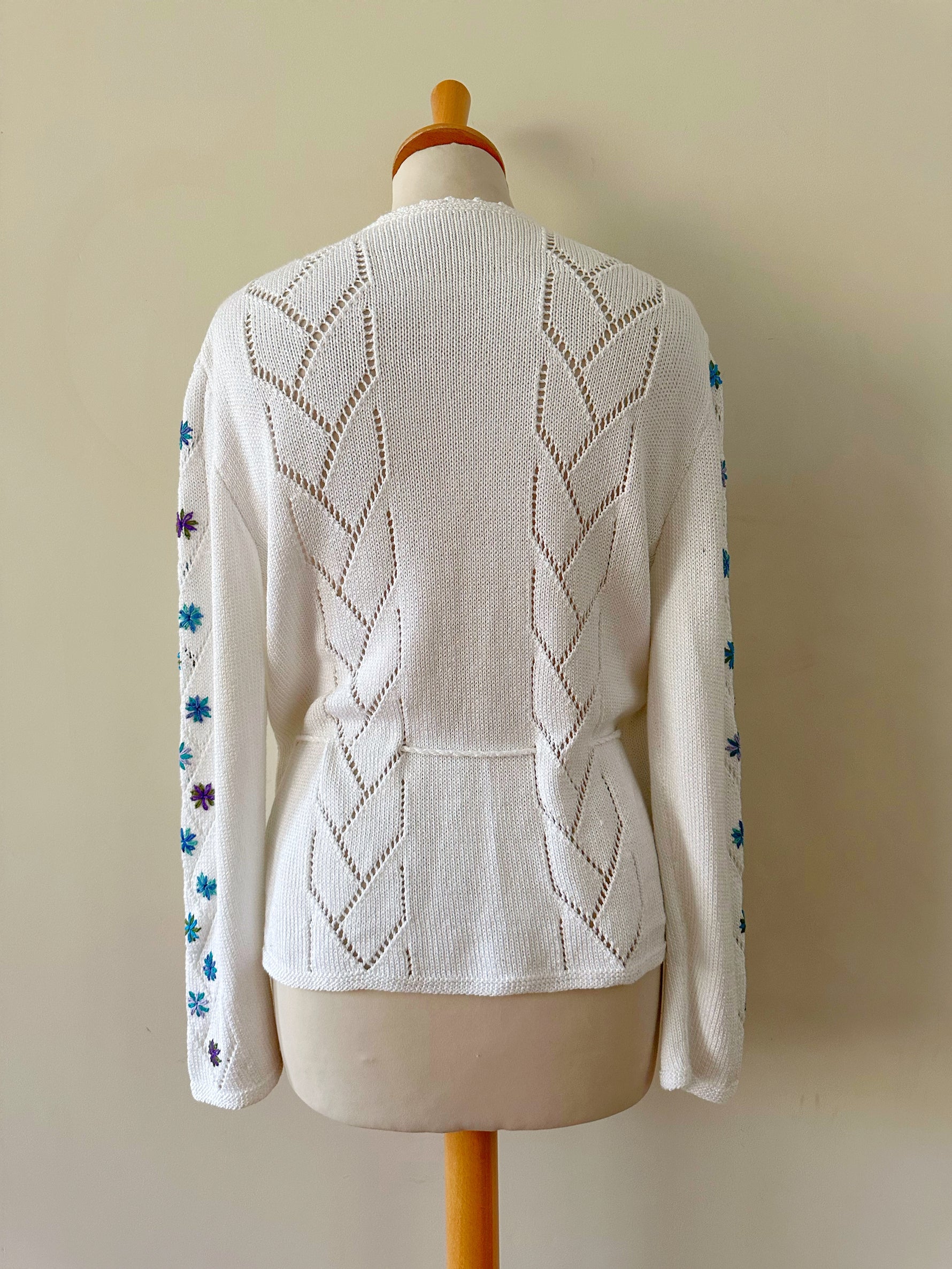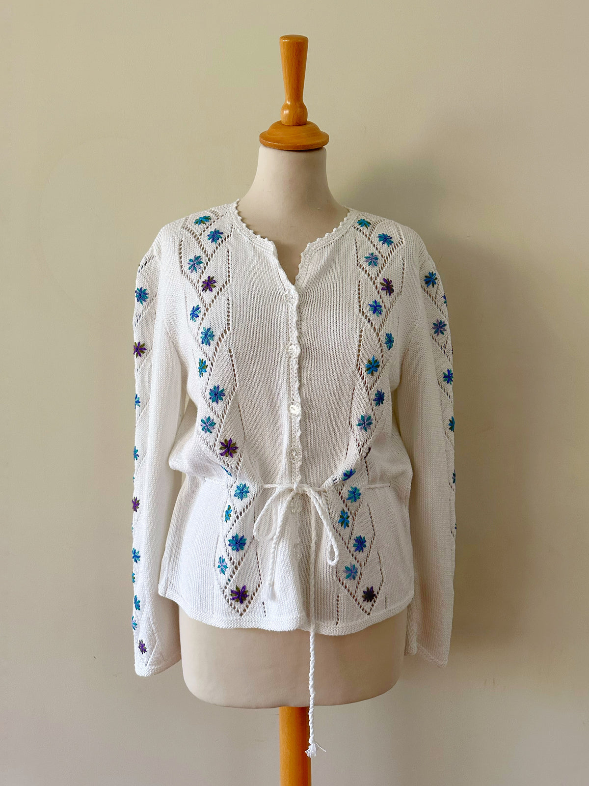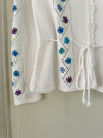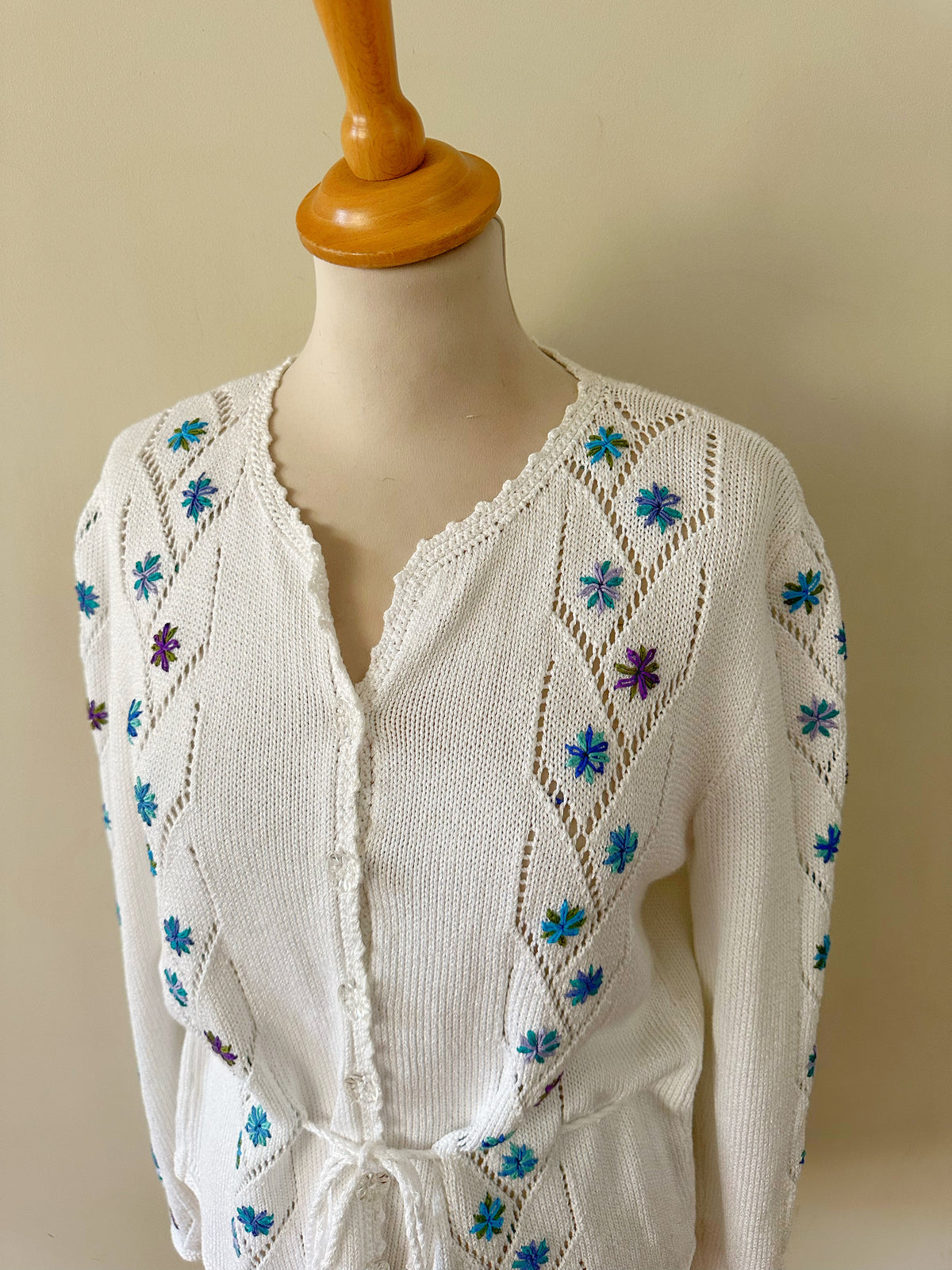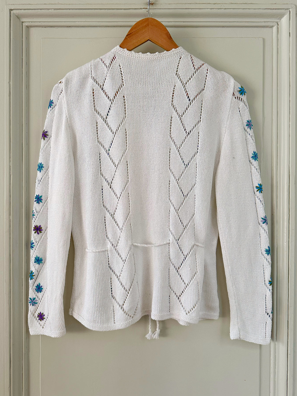 Prix unitaire parCardigan à fleurs en tricot 100% coton, maille ajourée esprit crochet, brodé de fleurs multicolores bleus violets, lilas, vertes. Cordon taille à nouer, bouton bijoux transparents fleuris, tricoté mains. Convient aux tailles 36 et 38 porté ici sur un mannequin T36. Aisselles 45cm Longueur 55cm.