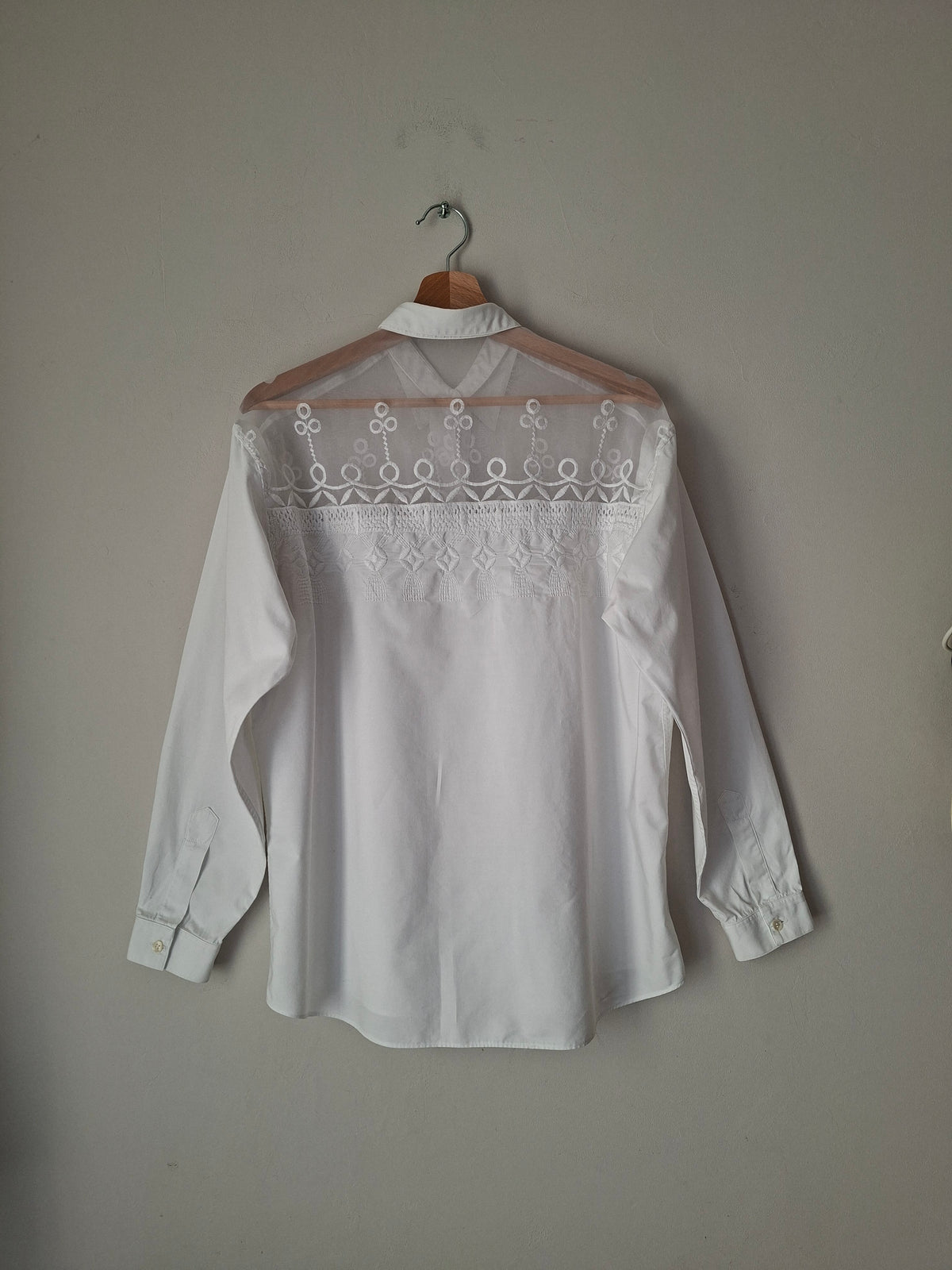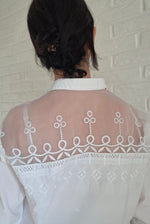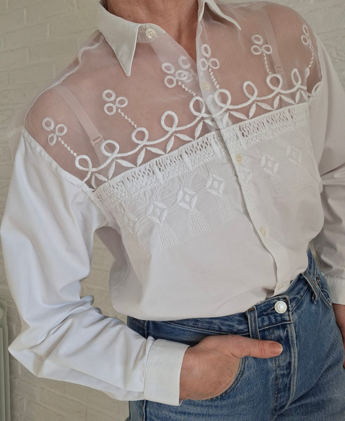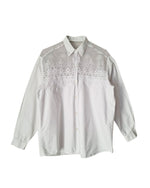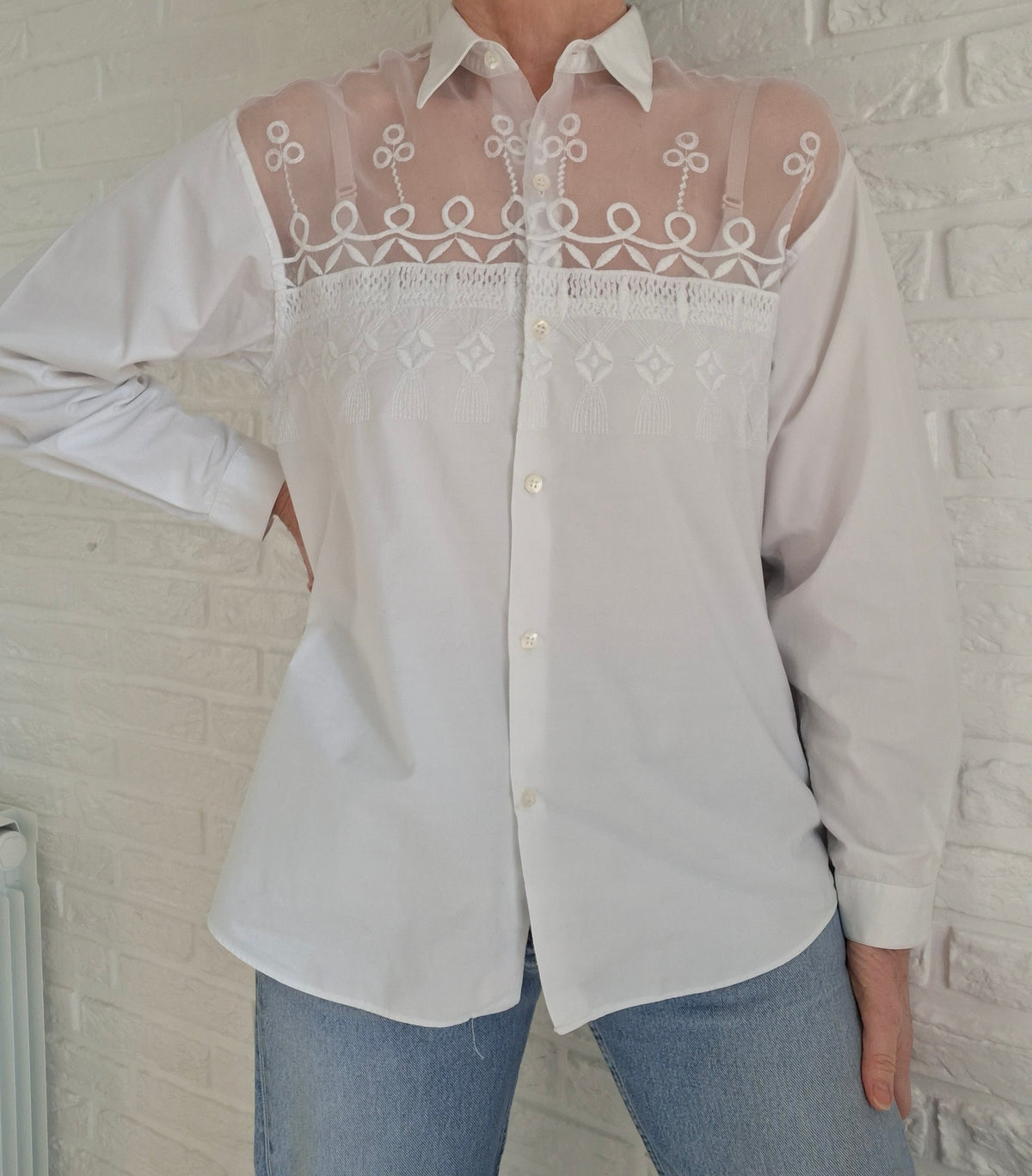 Chemise en dentelle 90's. En gaze organza brodé sur le haut devant et dos. Épaules 45cm Poitrine 53cm Longueur 65cm.Taille 40.
