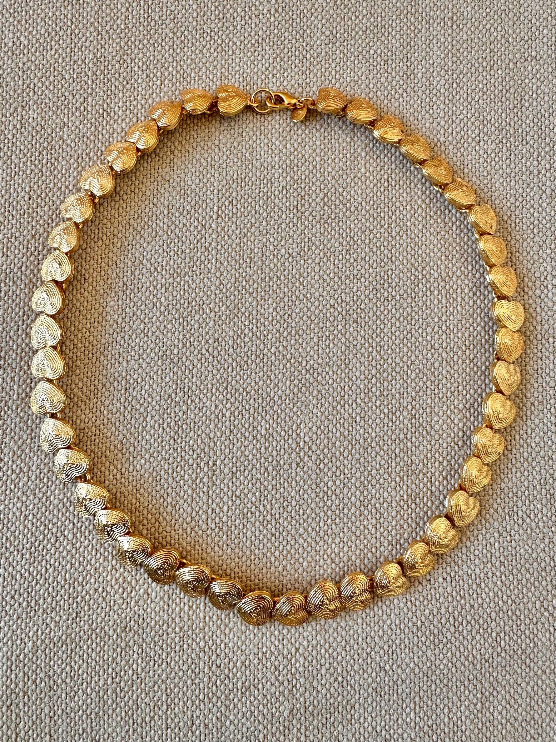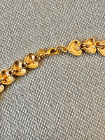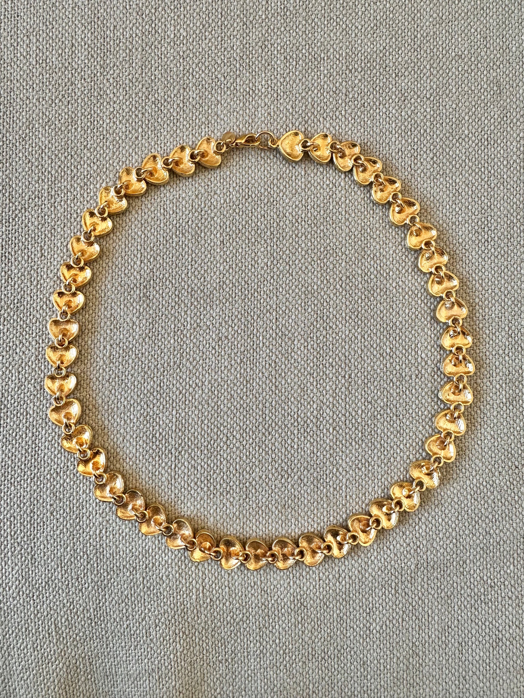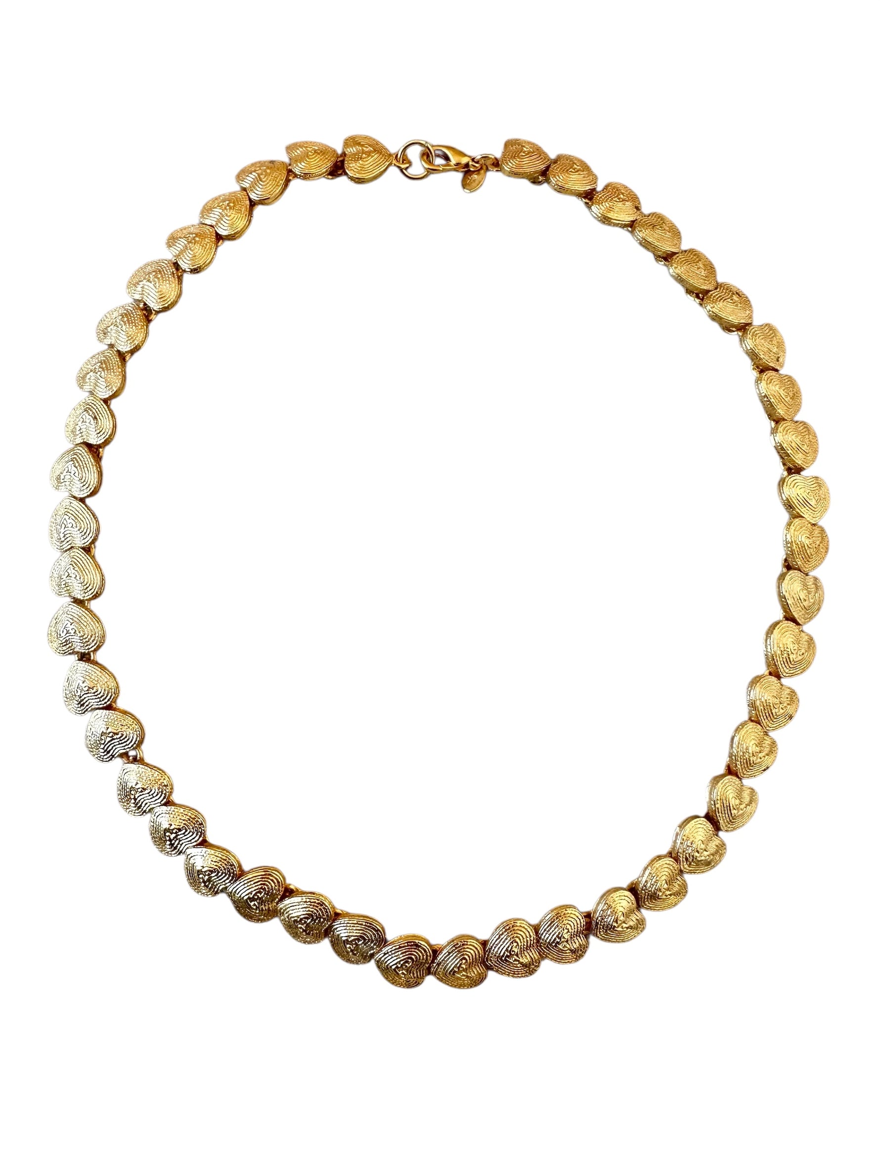 Prix unitaire parCollier coeurs, en metal plaqué or, chainette petits coeurs gravés, fermoir à mousqueton, fabriqué en France, longueur 46cm, largeur 1,3cm.