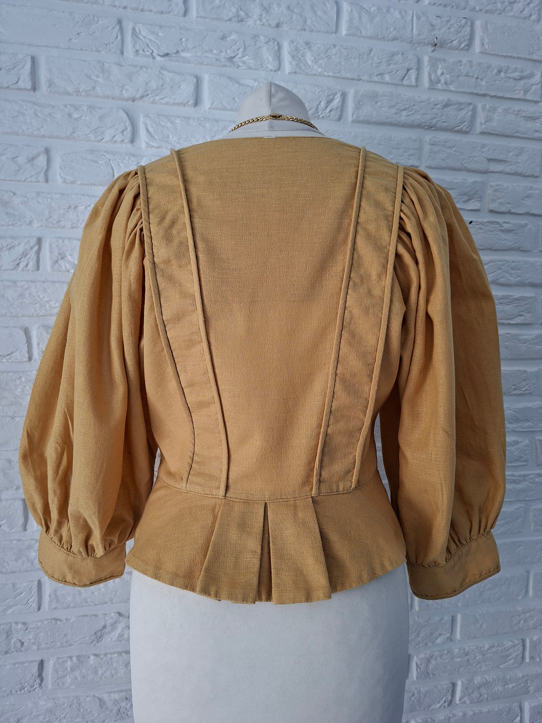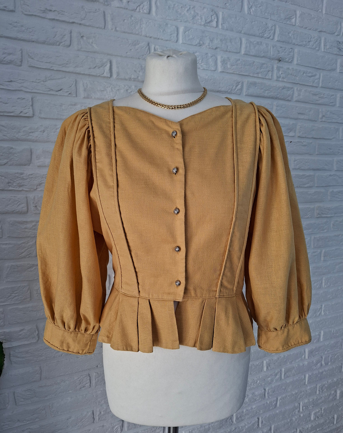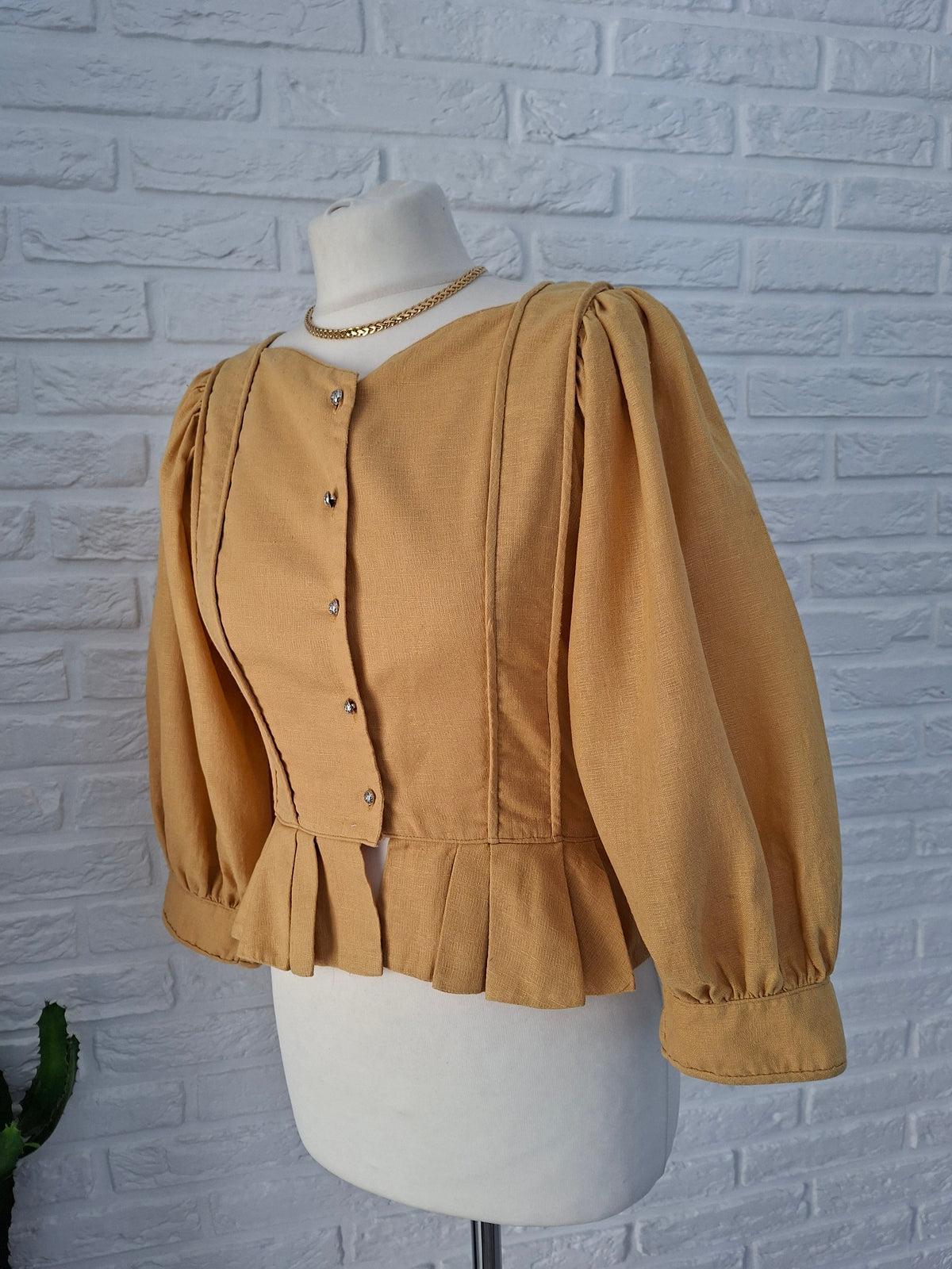 Prix unitaire parCrop top autrichien en coton jaune moutarde Forme cintrée et courte avec plis sur la taille A manches mi longues ballons Jolis boutons en métal embossé et argenté Porté ajusté par Patricia et le mannequin qui font une taille 40 Les mesures à plat Epaules 38 cm Taille 40 cm Longueur 51 cm (pat 11)