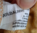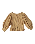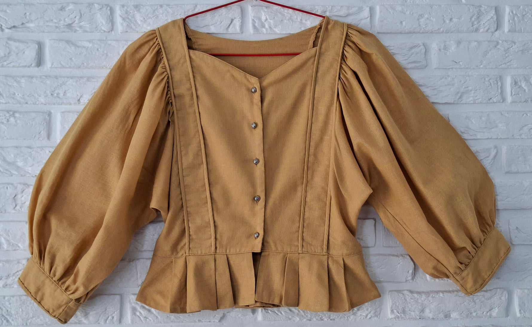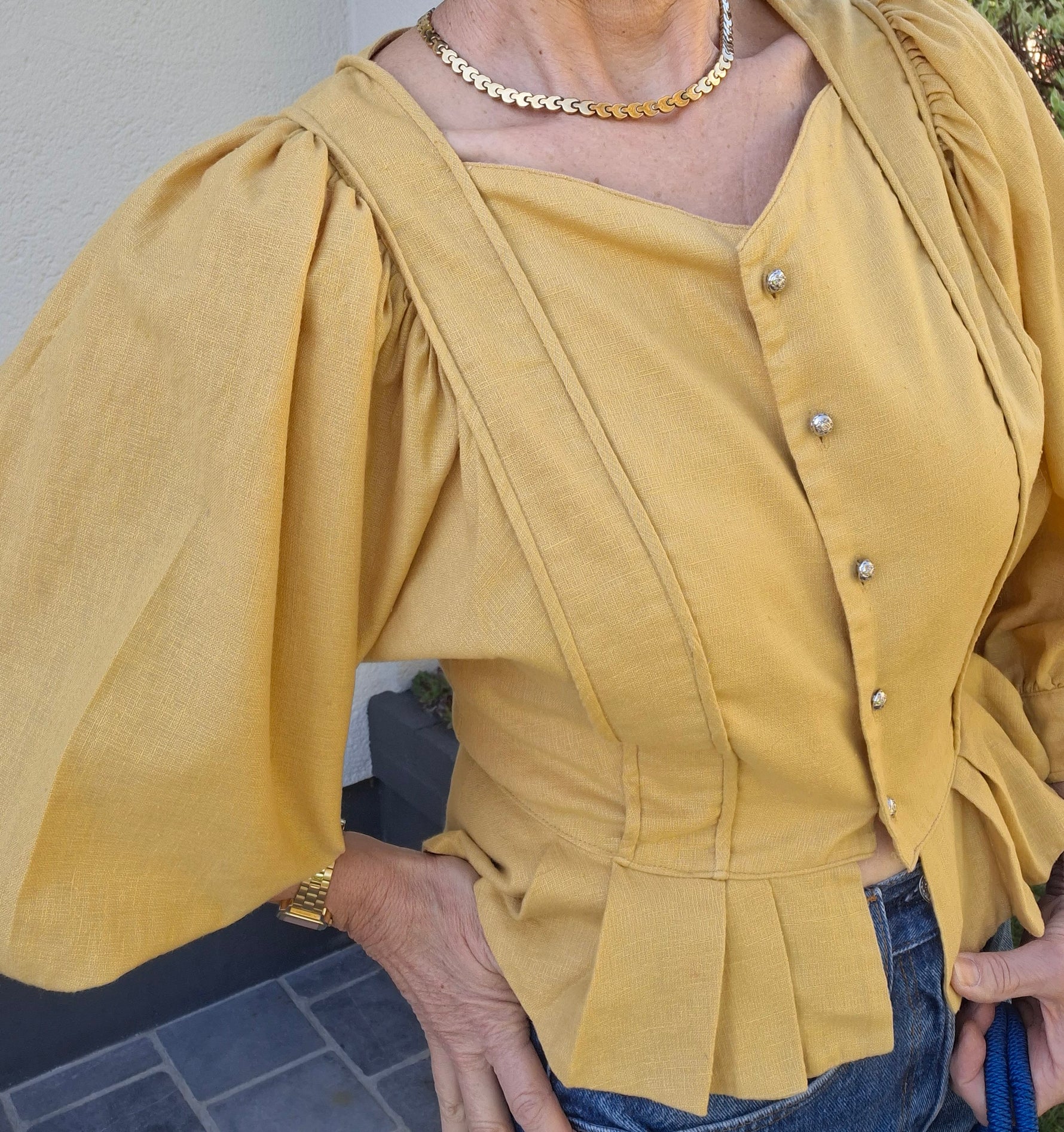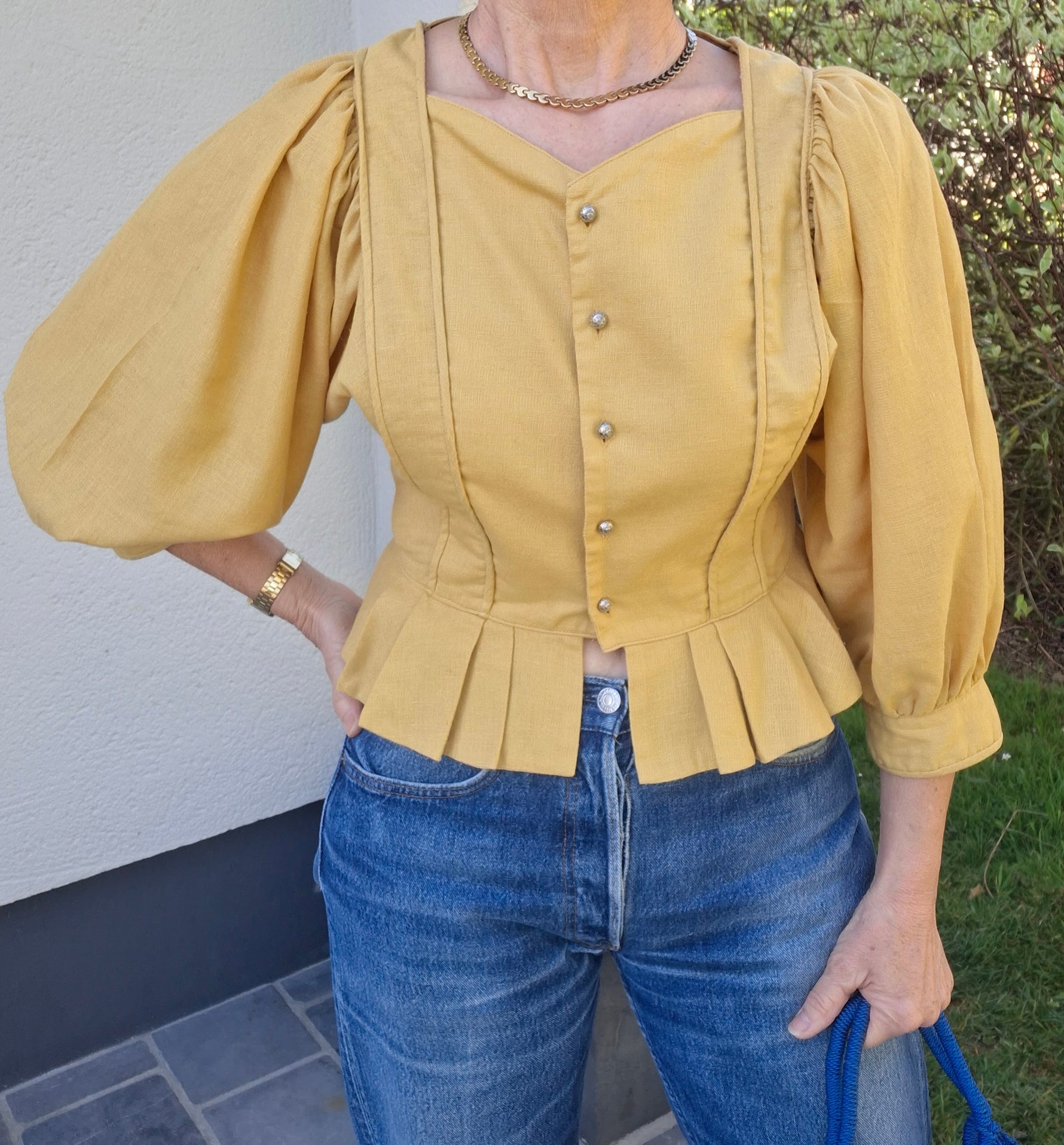 Prix unitaire parCrop top autrichien en coton jaune moutarde Forme cintrée et courte avec plis sur la taille A manches mi longues ballons Jolis boutons en métal embossé et argenté Porté ajusté par Patricia et le mannequin qui font une taille 40 Les mesures à plat Epaules 38 cm Taille 40 cm Longueur 51 cm (pat 11)