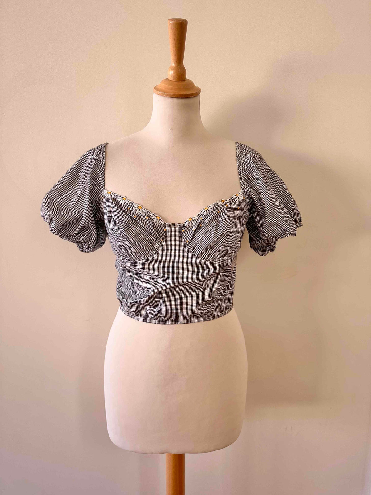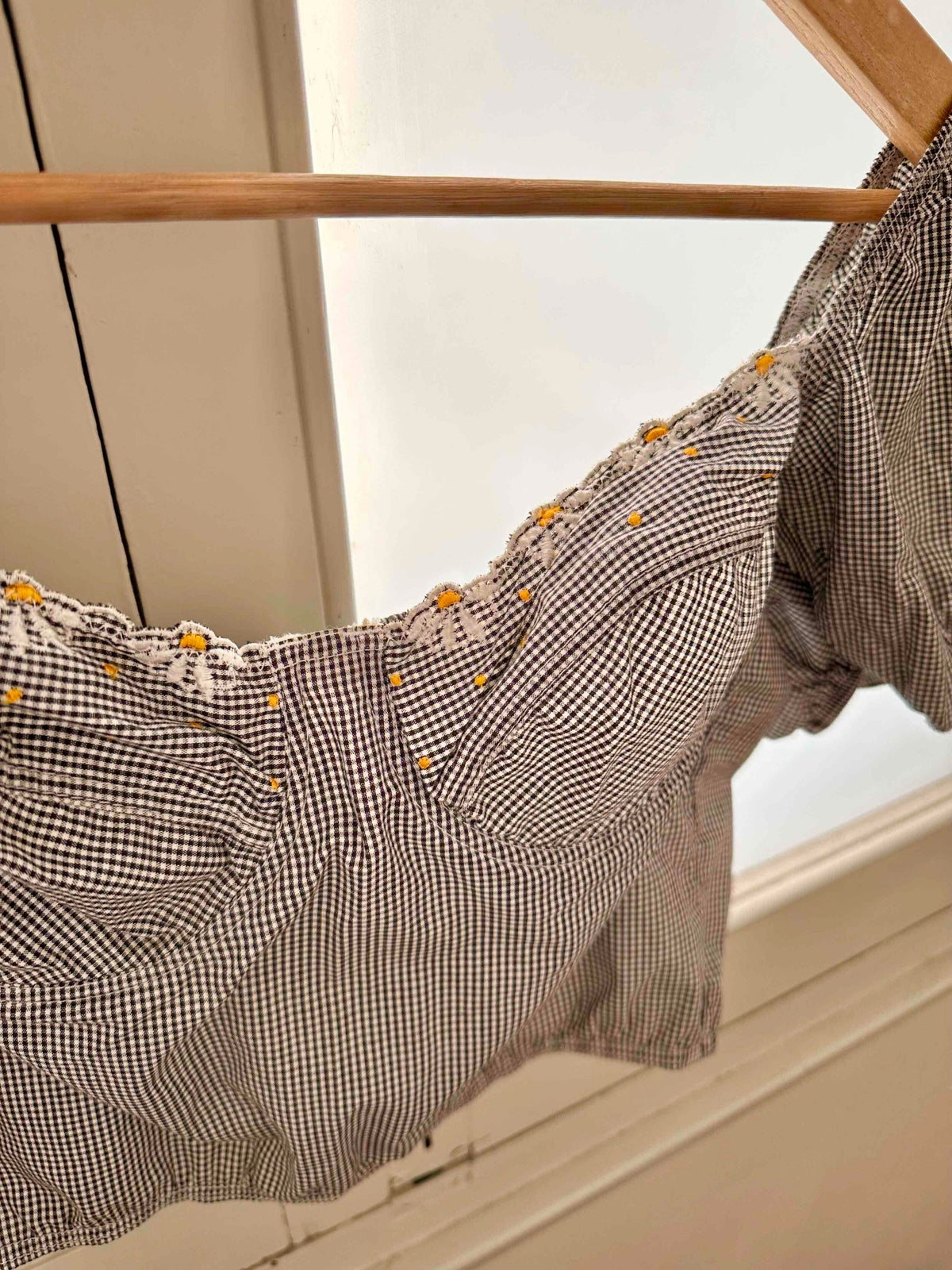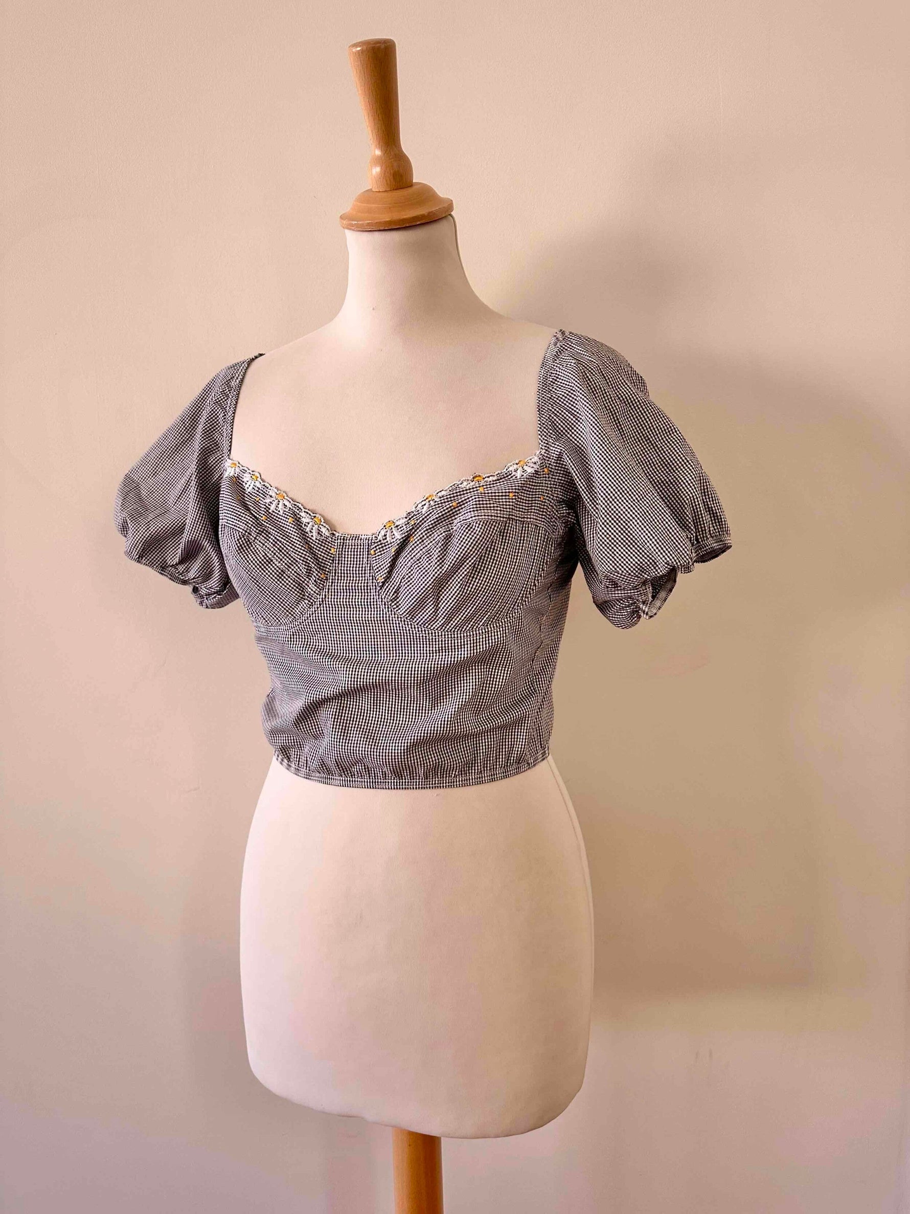 Crop top vichy et fleurs, en 100% coton vichy noir et blanc, encrolure brodée de marguerites blanches et jaunes, poitrine corset à armatures, manches ballons élastiques pouvant se porter open-shoulders, bas élastique, dos smock élastique à deux rangées de crochets agrafes, années 90's, taille 36 bonnet B et C porté ici sur un mannequin T36.