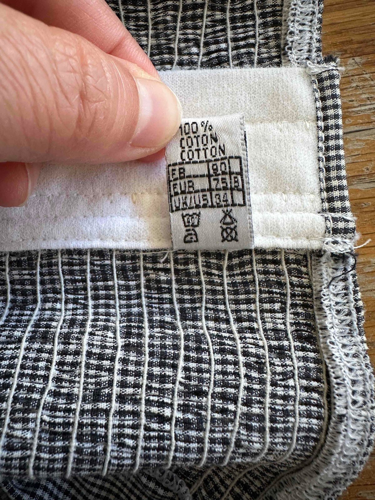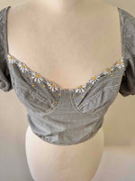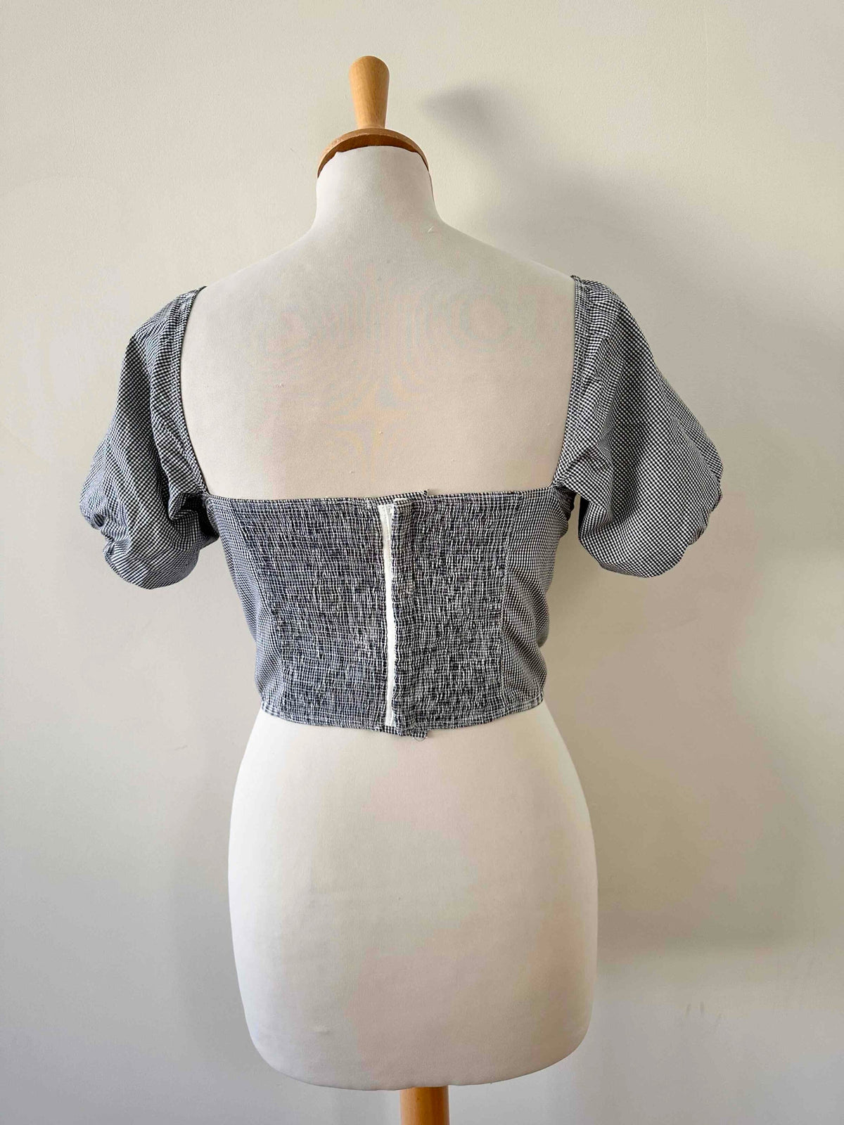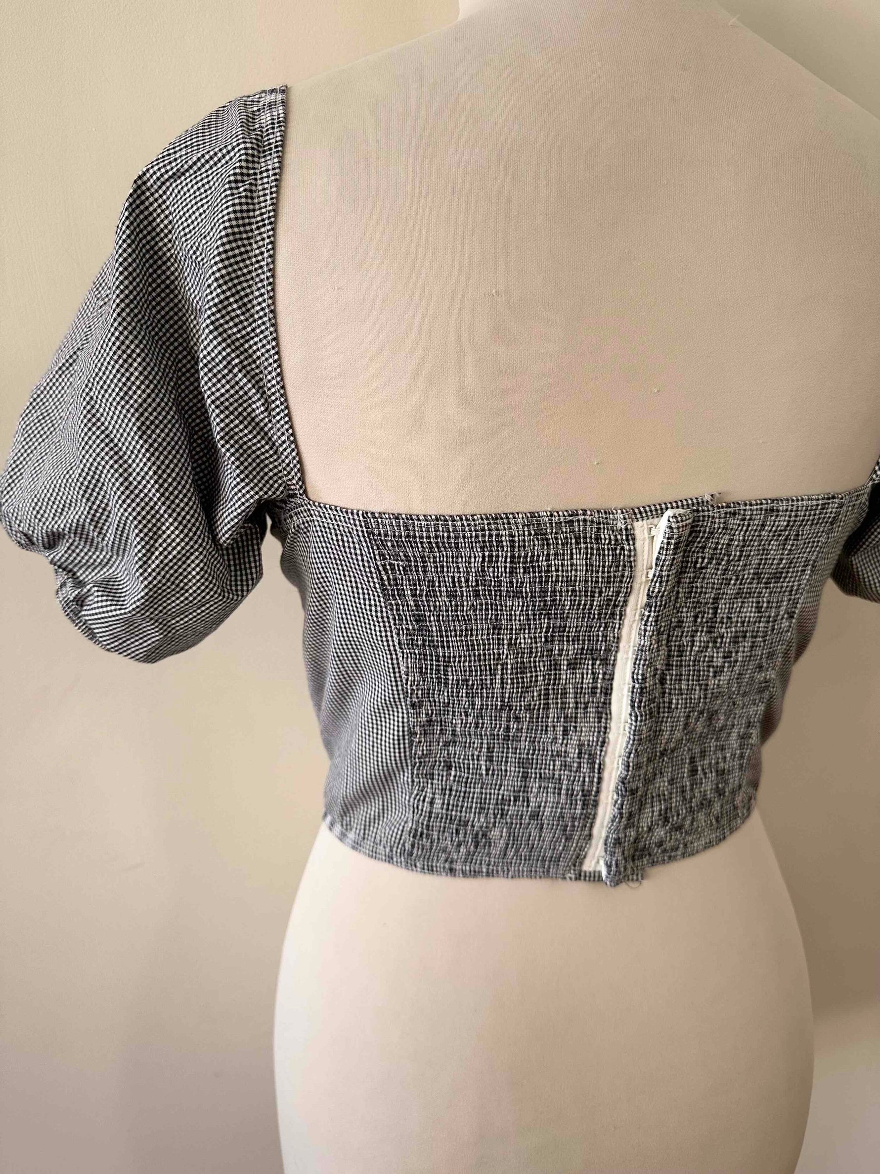 Crop top vichy et fleurs, en 100% coton vichy noir et blanc, encrolure brodée de marguerites blanches et jaunes, poitrine corset à armatures, manches ballons élastiques pouvant se porter open-shoulders, bas élastique, dos smock élastique à deux rangées de crochets agrafes, années 90's, taille 36 bonnet B et C porté ici sur un mannequin T36.