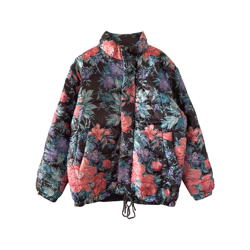 Doudoune à fleurs, noire imprimée fleurs multicolores pastels roses, lilas, bleu vert, fermeture éclaire et boutons pressions, bas à resserrer, forme mi-longue, fabriquée en France, taille 38 et 40 portée ici sur une personne T40.
