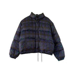Prix unitaire parDoudoune écossaise 90's, rembourrée en duvet véritable, imprimée carreaux écossais bleu foncé, vert sapin et jaune, fermeture éclaire et boutons pressions, capuche intégrée dans le col à boutons pressions, bas à resserrer par deux liens, notée XL, convient aux taille 38/40/42, portée ici sur une personne T40.