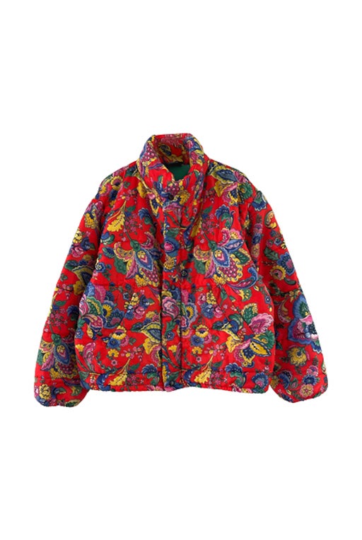 Prix unitaire parDoudoune motifs paisley, en nylon rouges imprimé paisley multicolore, matelassée rembourrée, années 90s, convient aux tailles 36/38/40 porté ici sur un mannequin T36 et sur une personne T40.