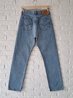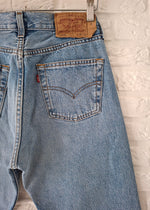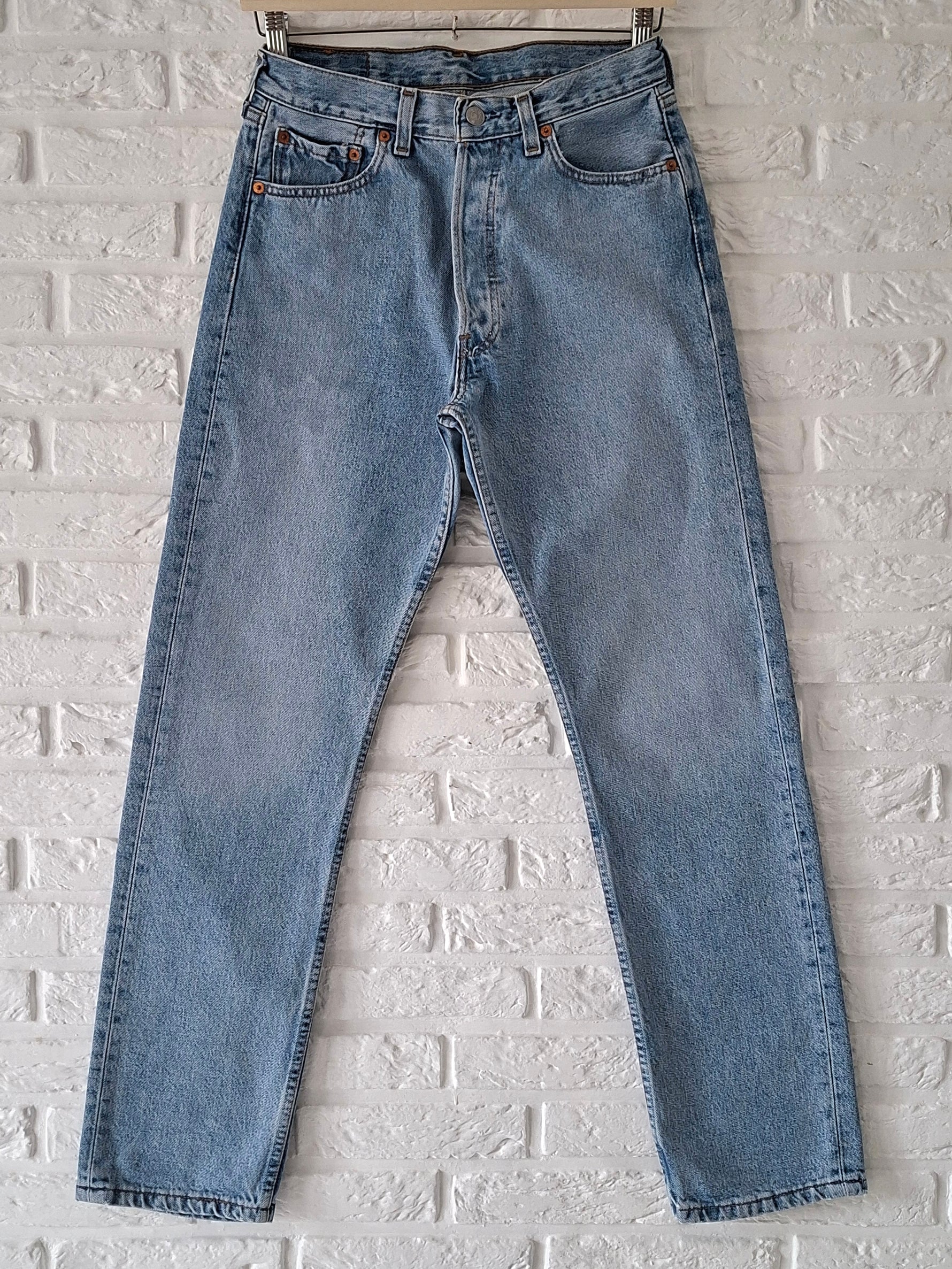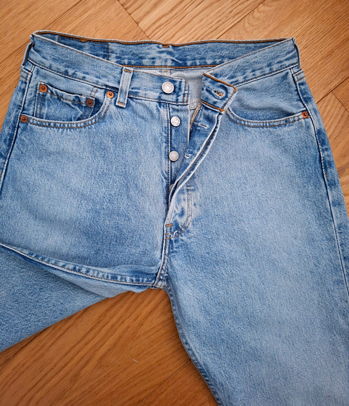 Jean Levi's 501 W29 L30 Made in Spain Denim bleu moyen Ourlets d’origine. Les mesures à plat Taille 34cm Hanches 50cm Entrejambe 76cm Longueur 101cm.(PAT7)