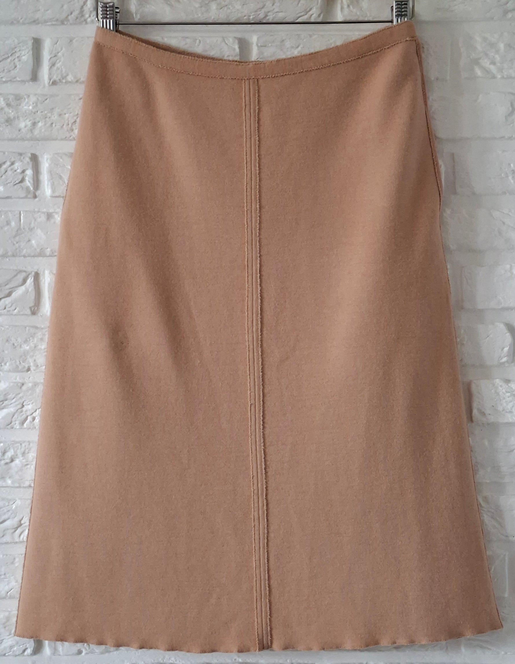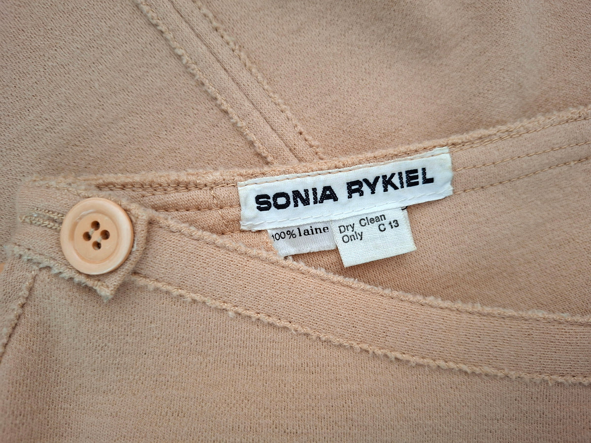 Prix unitaire parJupe Sonia Rykiel en laine rose poudré. A taille haute zippée sur le côté. 2 poches à l’italienne. Coutures brutes.Les mesures à plat Taille 34cm Longueur 62 cm.Micro réparation sur l’envers non visible porté. (PAT10)