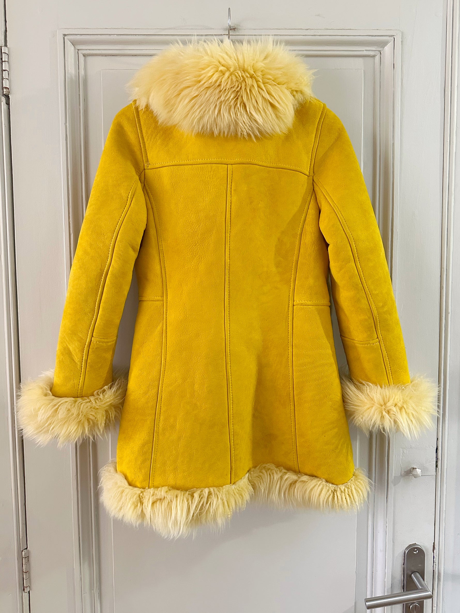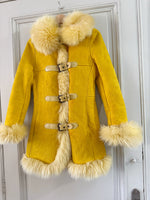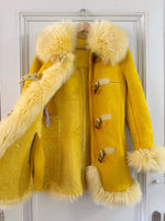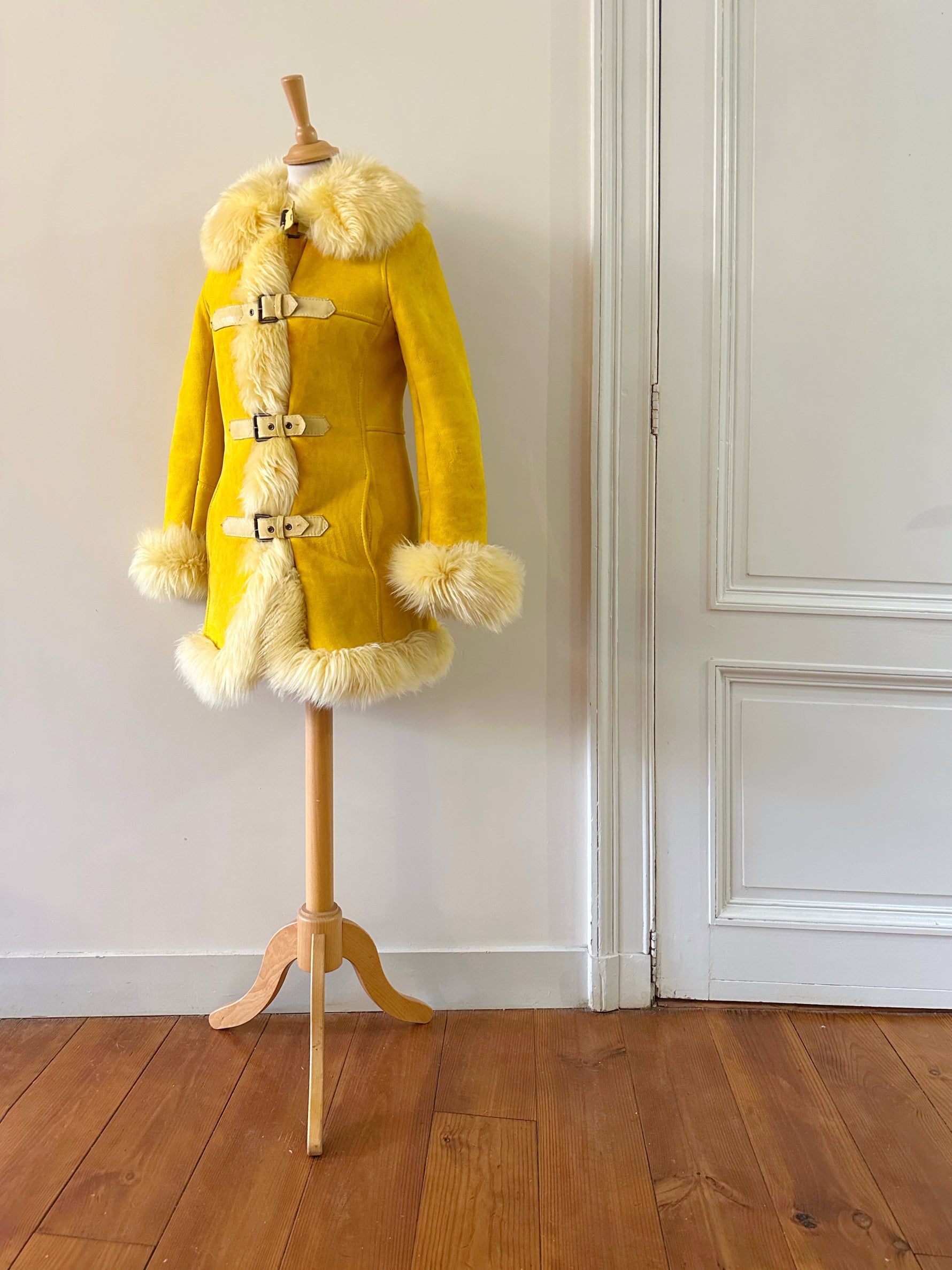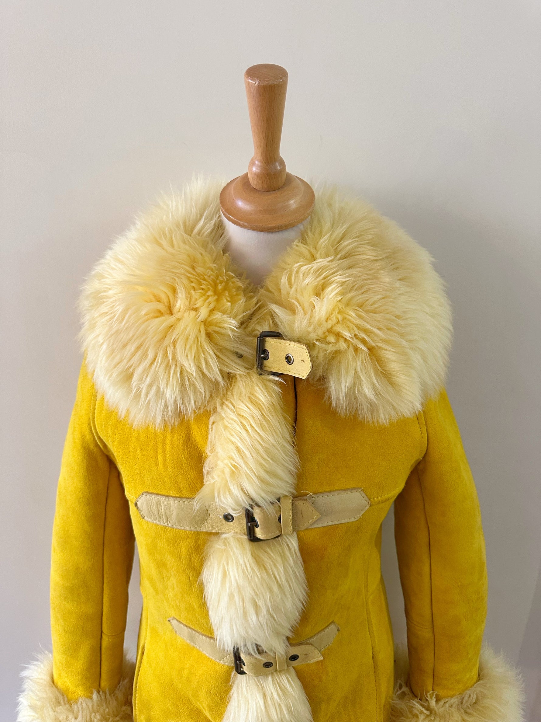 Manteau afghan, peau lainée mouton retourné jaune, exterieur en daim interieur en laine de mouton jaune, fermeture par sangle à boucles, forme Pennylane, modèle rare des années 70's. Fabriquée en France, convient aux tailles 34 et 36 portée ici sur un mannequin T36 et ouvert sur une personne T40. Longueur 75cm.