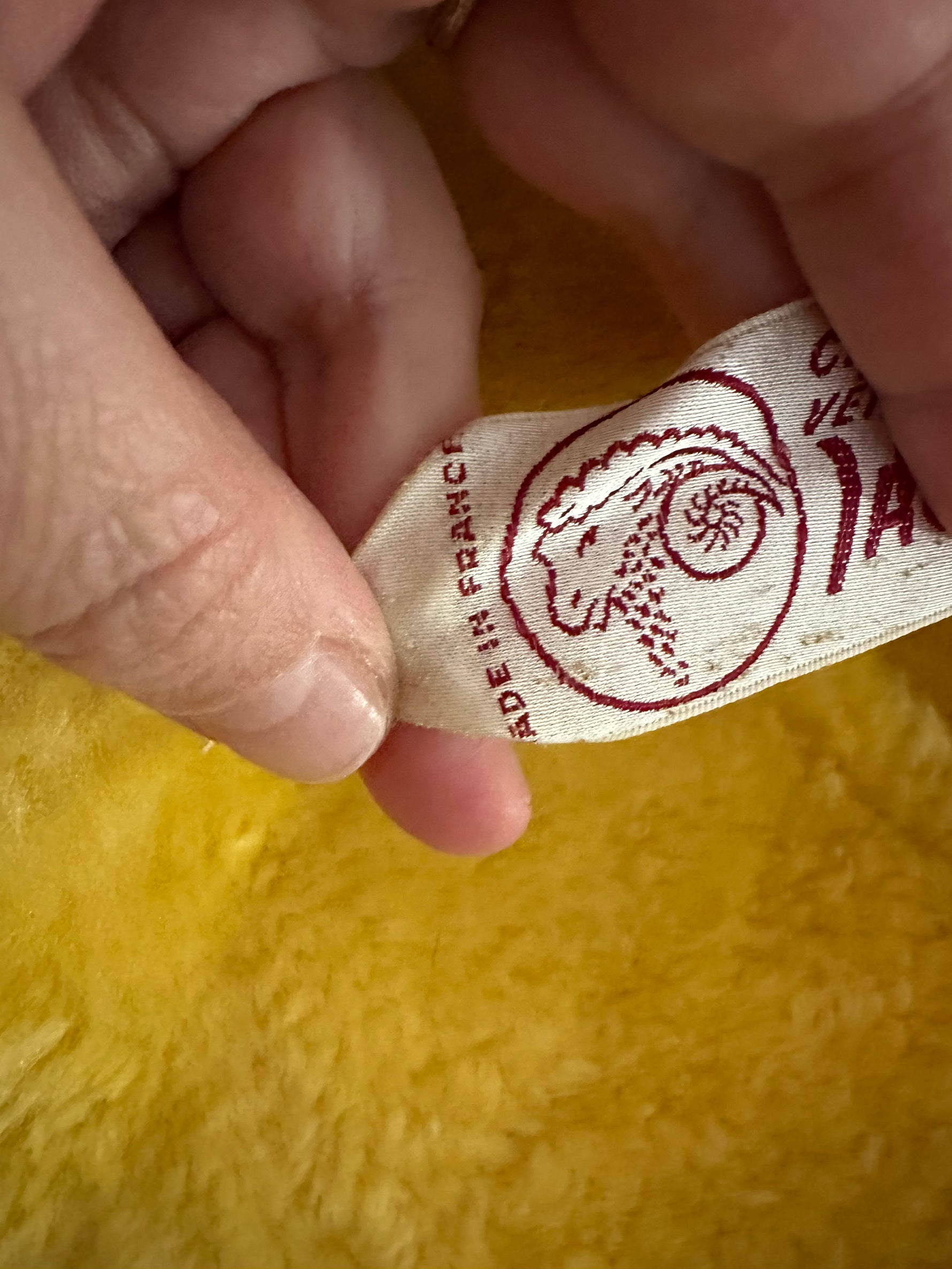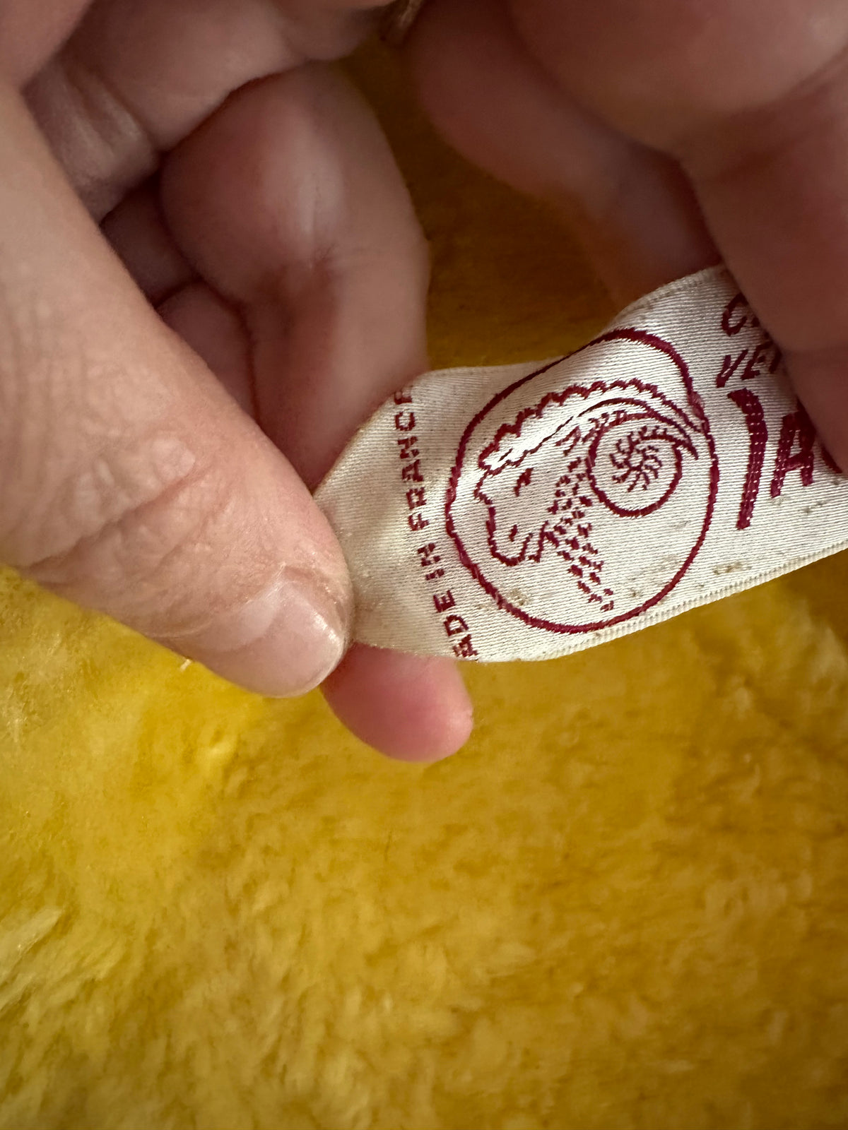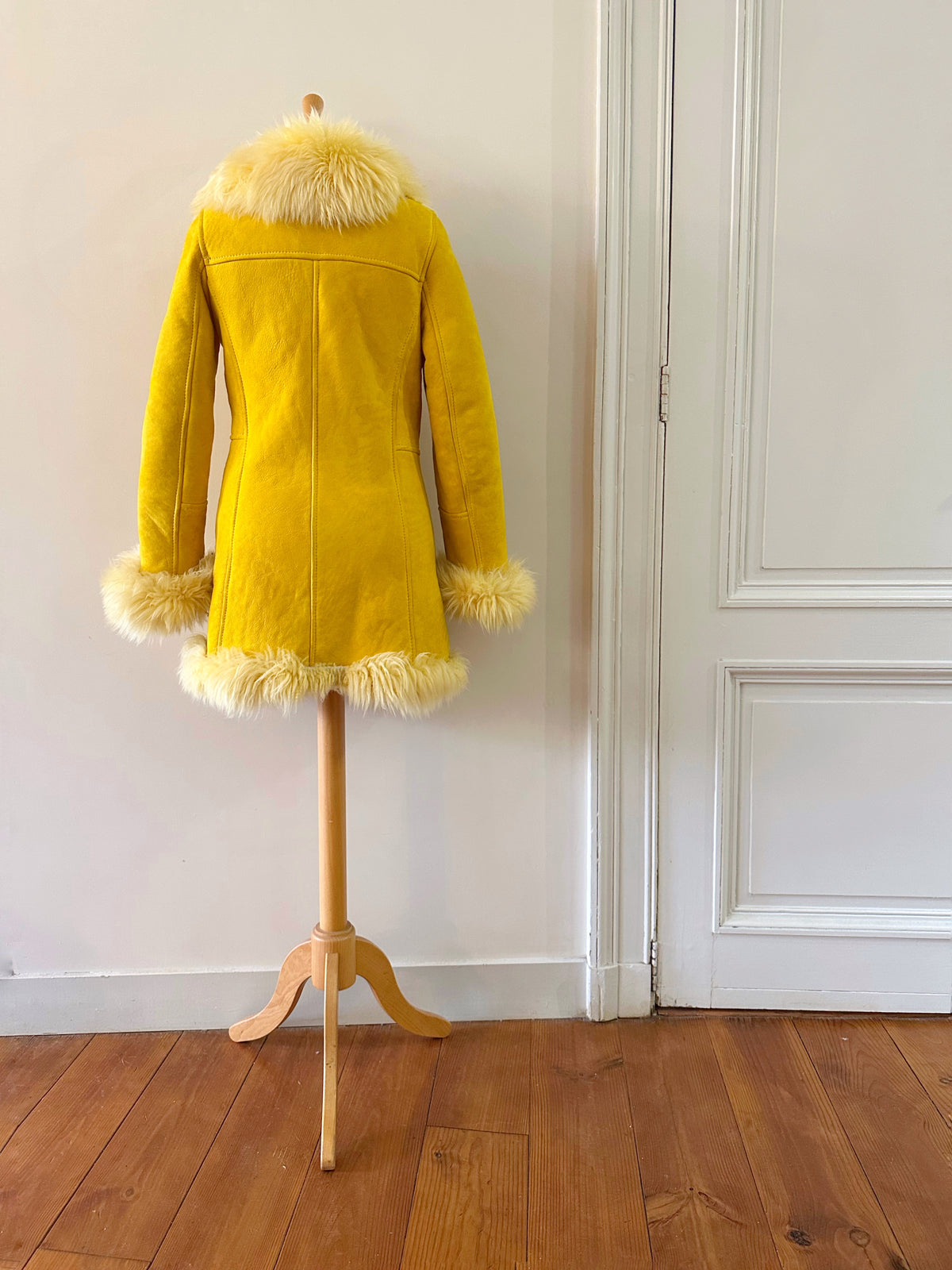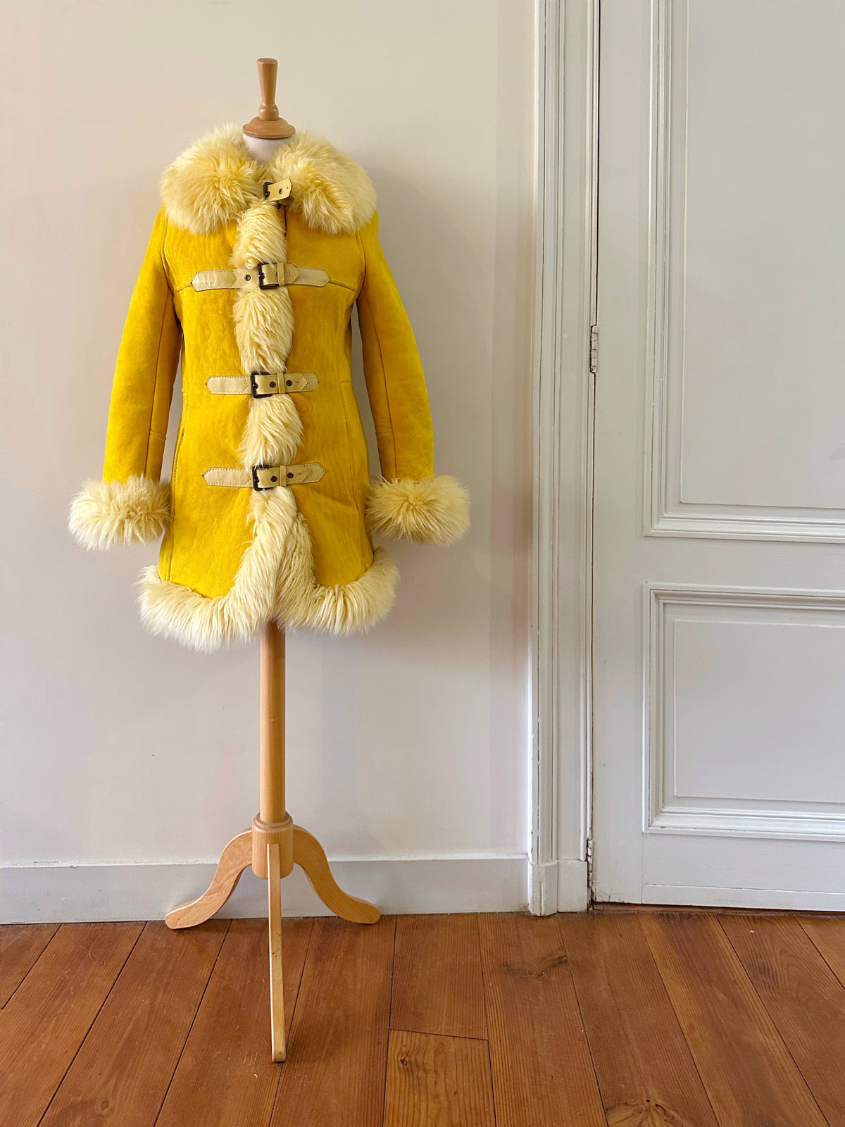 Manteau afghan, peau lainée mouton retourné jaune, exterieur en daim interieur en laine de mouton jaune, fermeture par sangle à boucles, forme Pennylane, modèle rare des années 70's. Fabriquée en France, convient aux tailles 34 et 36 portée ici sur un mannequin T36 et ouvert sur une personne T40. Longueur 75cm.