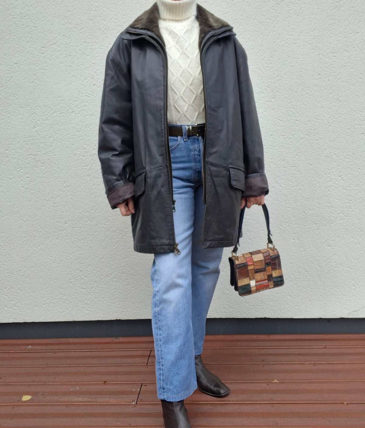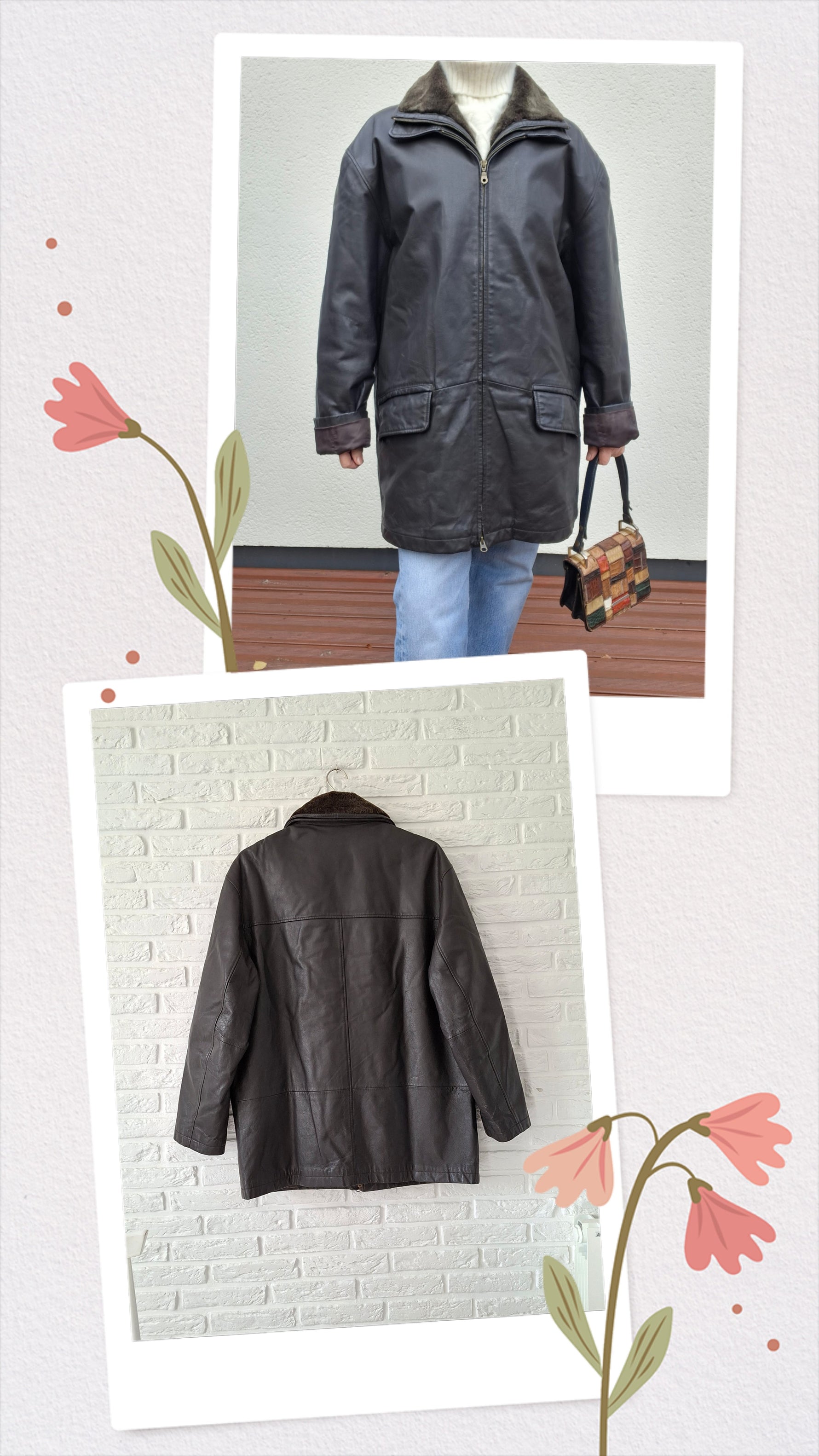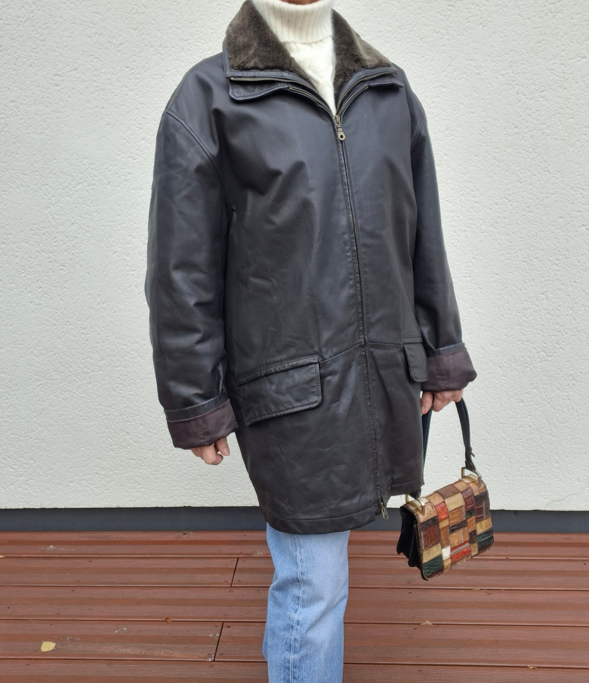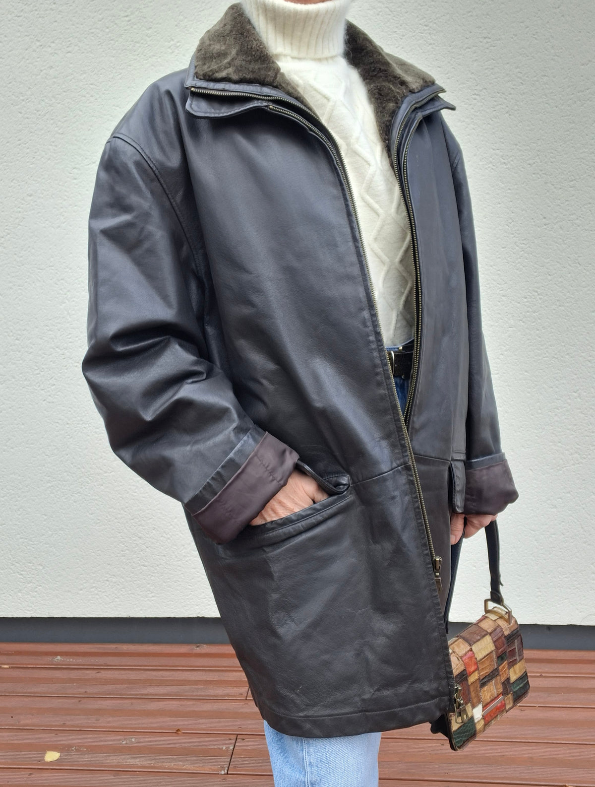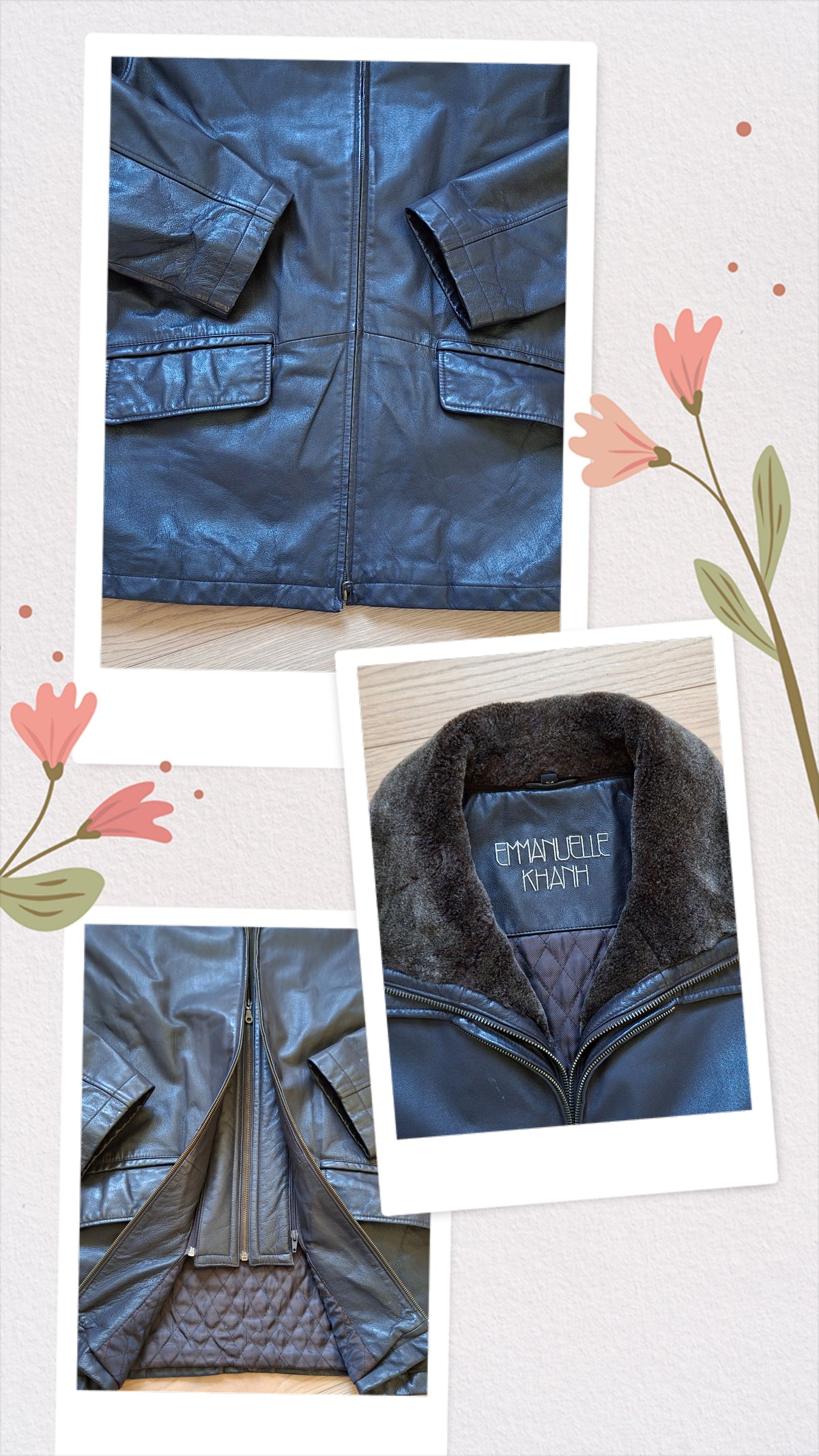 Manteau en cuir Emmanuelle Khanh. Col en fourrure amovible par zip. 2 poches à rabat. 2 poches zippées à l’intérieur. Doublure matelassée. Porté oversize et manches retroussées par Patricia qui fait une taille 40.Conviendra jusqu'à la taille 44/46.Epaules 56cm Poitrine 65cm.Longueur 82cm