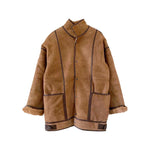 Peau lainée en mouton retourné, extérieur daim camel café au laot, gansé de bandes de cuir chocolat, intérieur mouton camel, boutons pressions, forme mi-hanches, manches à revers moutons, taille 38 porté ici sur une personne T40.