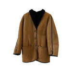 Peau lainée en mouton retourné extérieur cuir caramel gansé de cuir lisse noir, intérieur mouton noir, petit col châle mouton noir, boutonné, fabriqué en Italie, taille 38 porté ici un bouton ouvert sur une personne T40.