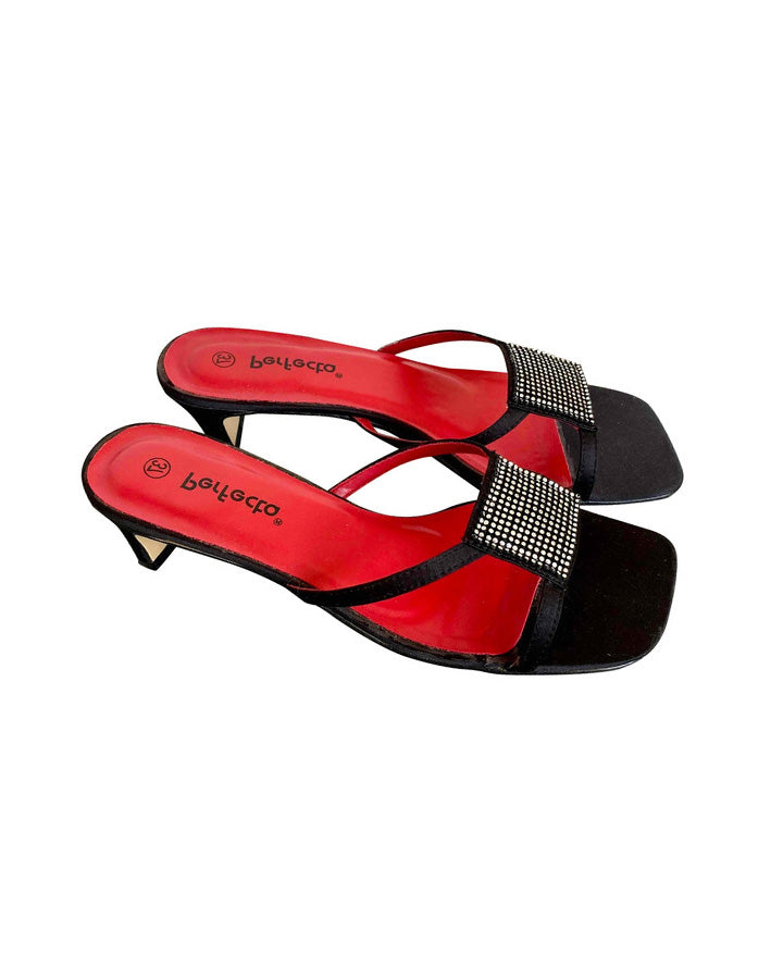 Mules talons en satin et strass, satin noir et doublure rouge, fines brides et dessus avec empiecement carré à strass argentés, bout carrés, talons bobines de 4,5cm, fabriquées en France, pointure 37 portées ici sur une personne chaussant 37, longueur semelle intérieure 23,5cm.