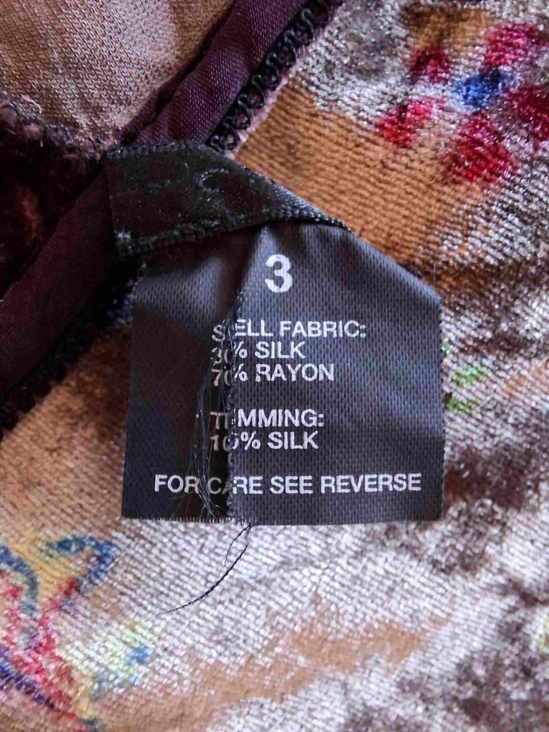Prix unitaire parPantalon flare en soie vintage 70’s. En velours de soie et rayonne à petites fleurs. Taille mi haute zippée devant avec liens à nouer pour ajuster celle-ci. Velours marron mordoré avec petites fleurs roses et bleues sur fond vert en dégradé. Le mannequin fait une taille 40.Taille 39cm. Longueur 103cm Entrejambe 77cm.Taille 38/40.