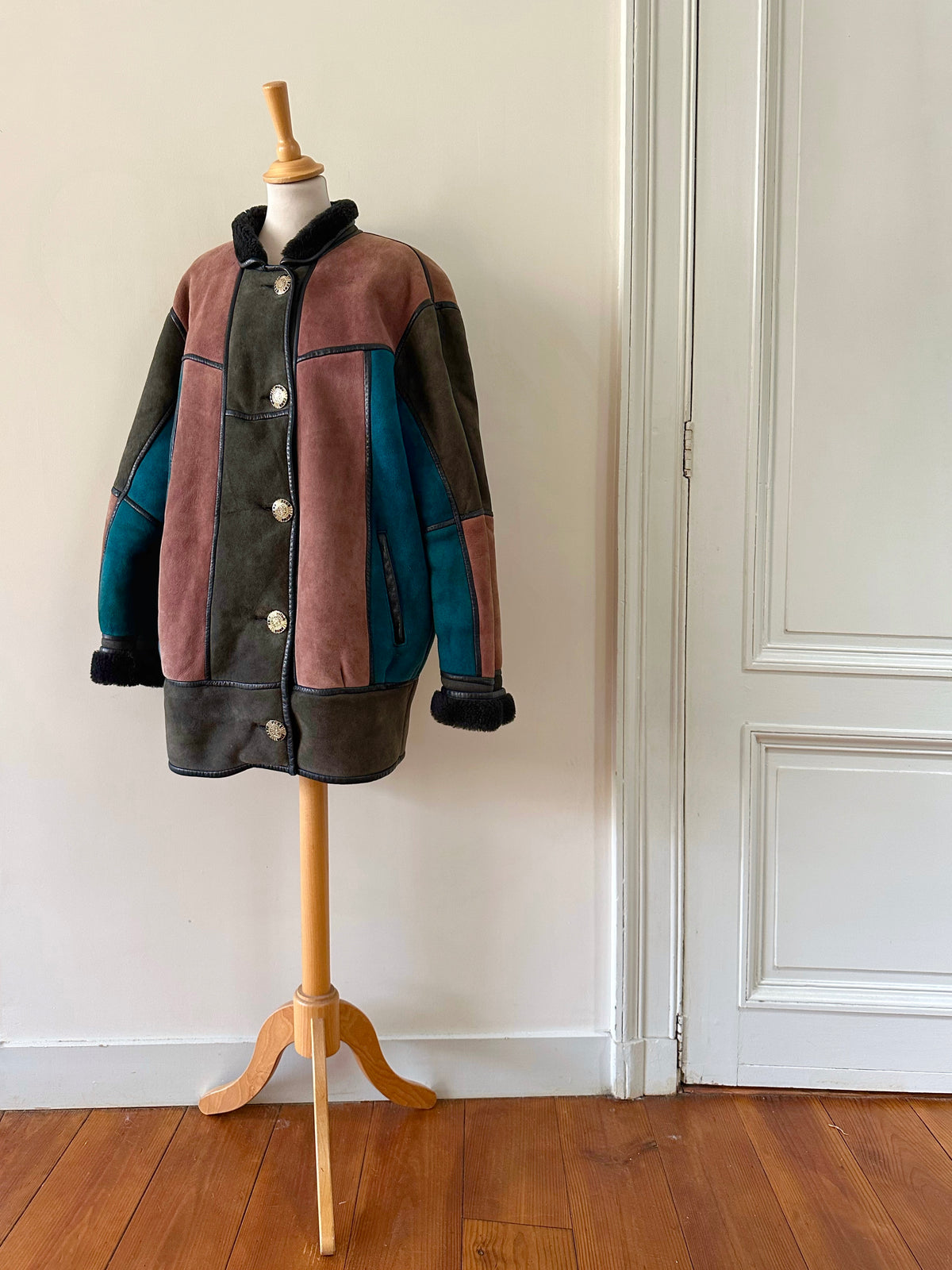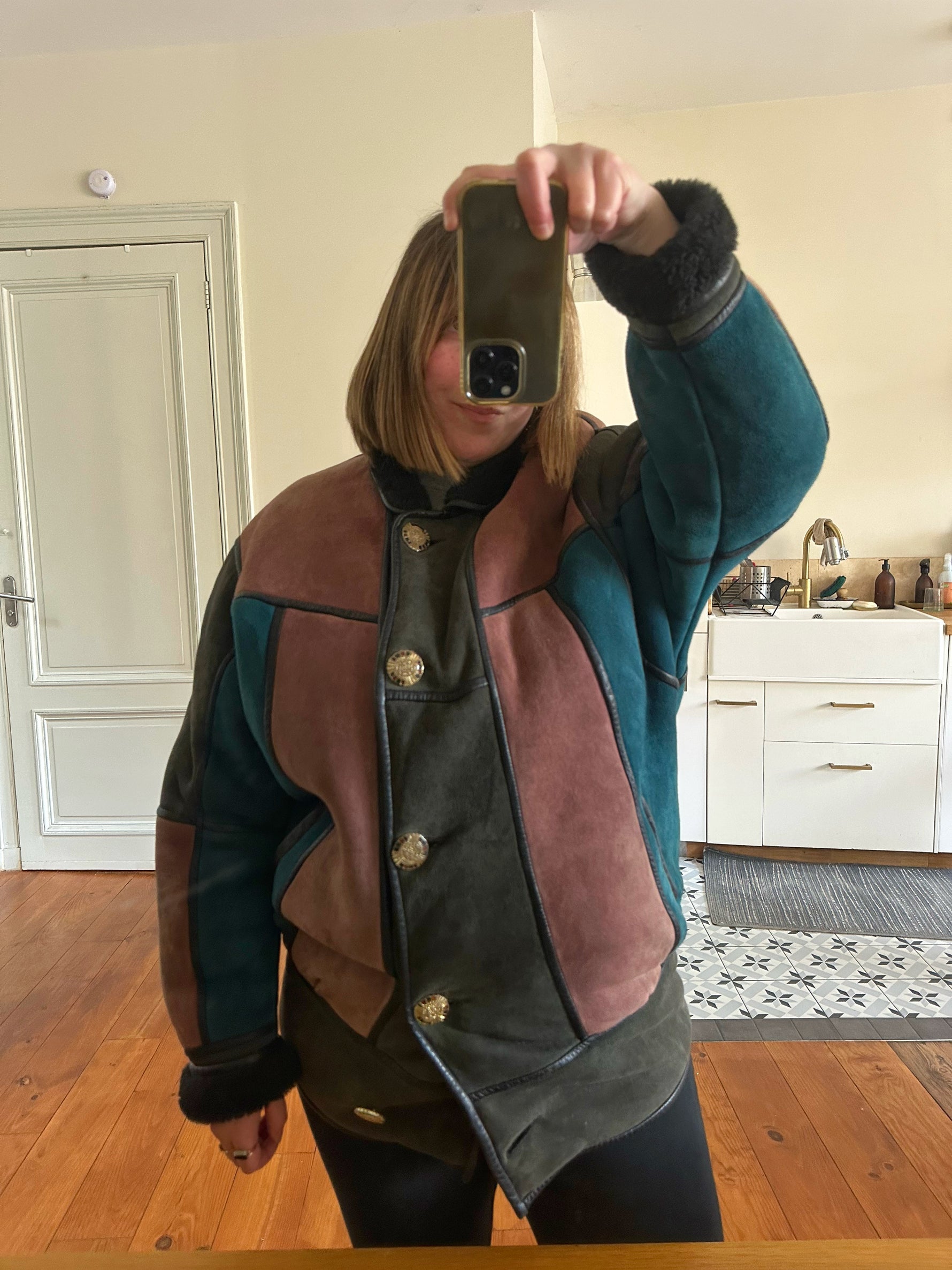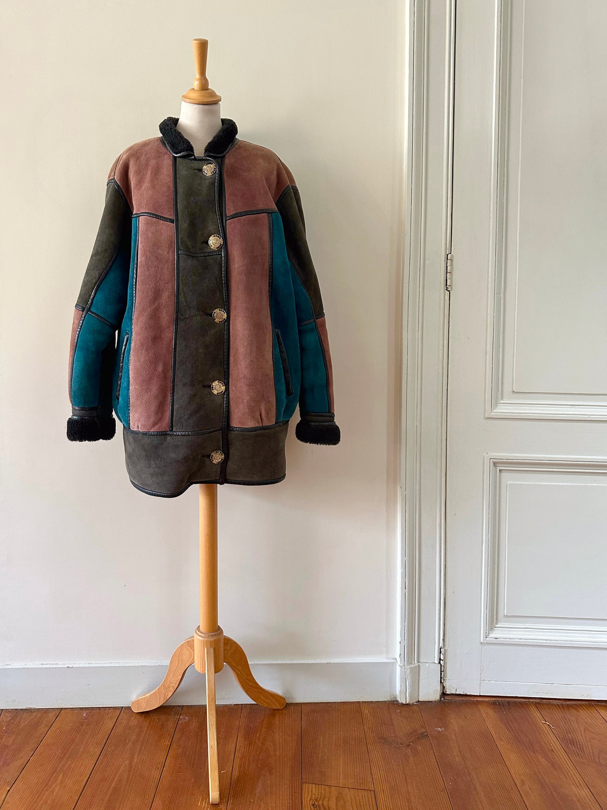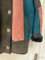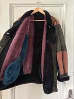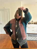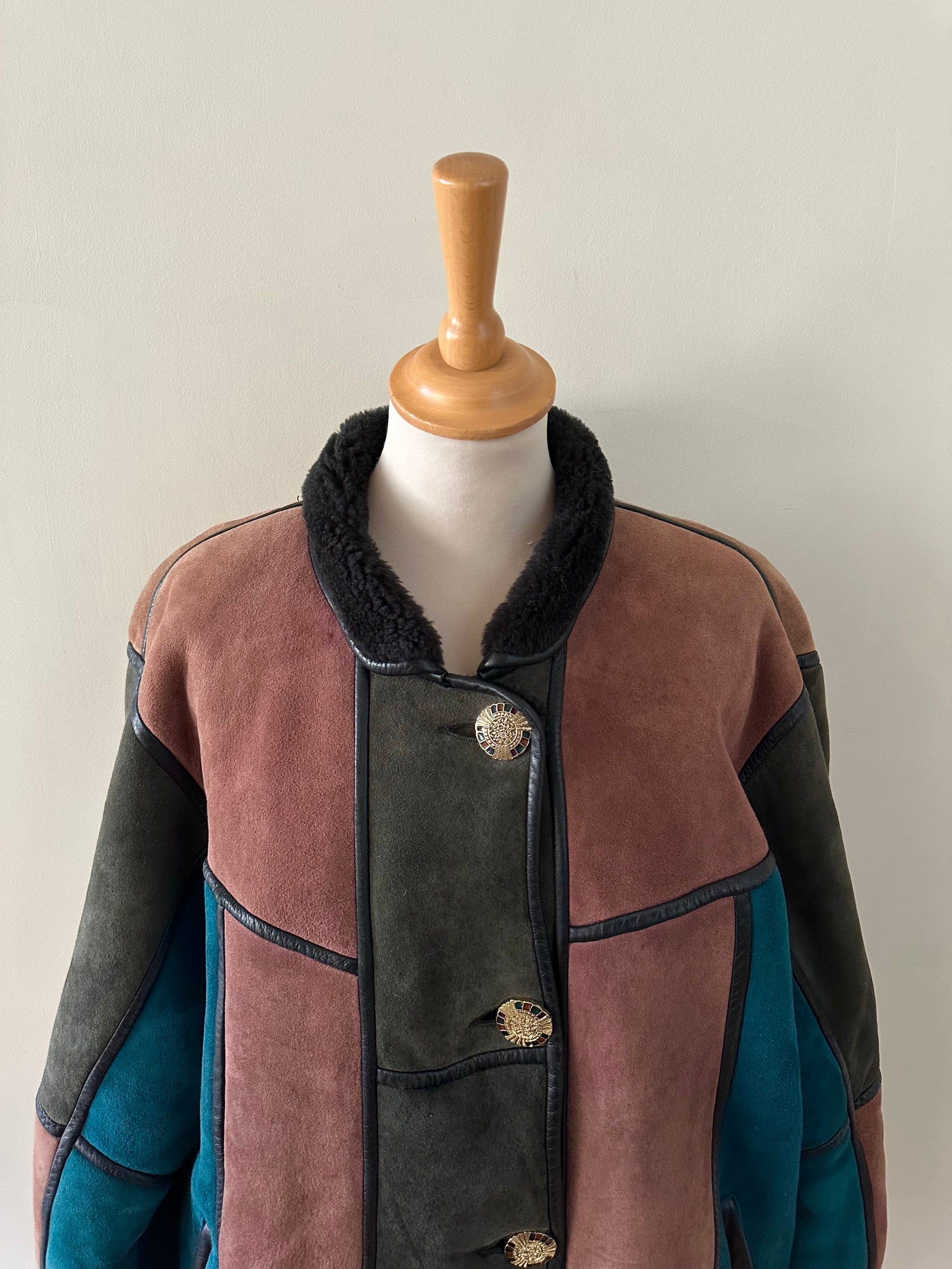 Prix unitaire parPeau lainée en mouton retourné, exterieur daim à empiècements patchwork multicolores bleu petrole, rose ancien, vert olive, interieur laine de mouton, ganses en cuir noirs. Boutons bijoux fleuris multicolores. Fabriqué en France. Taille 38 porté ici sur un mannequin T36 et sur une personne T40. Longueur 80cm.