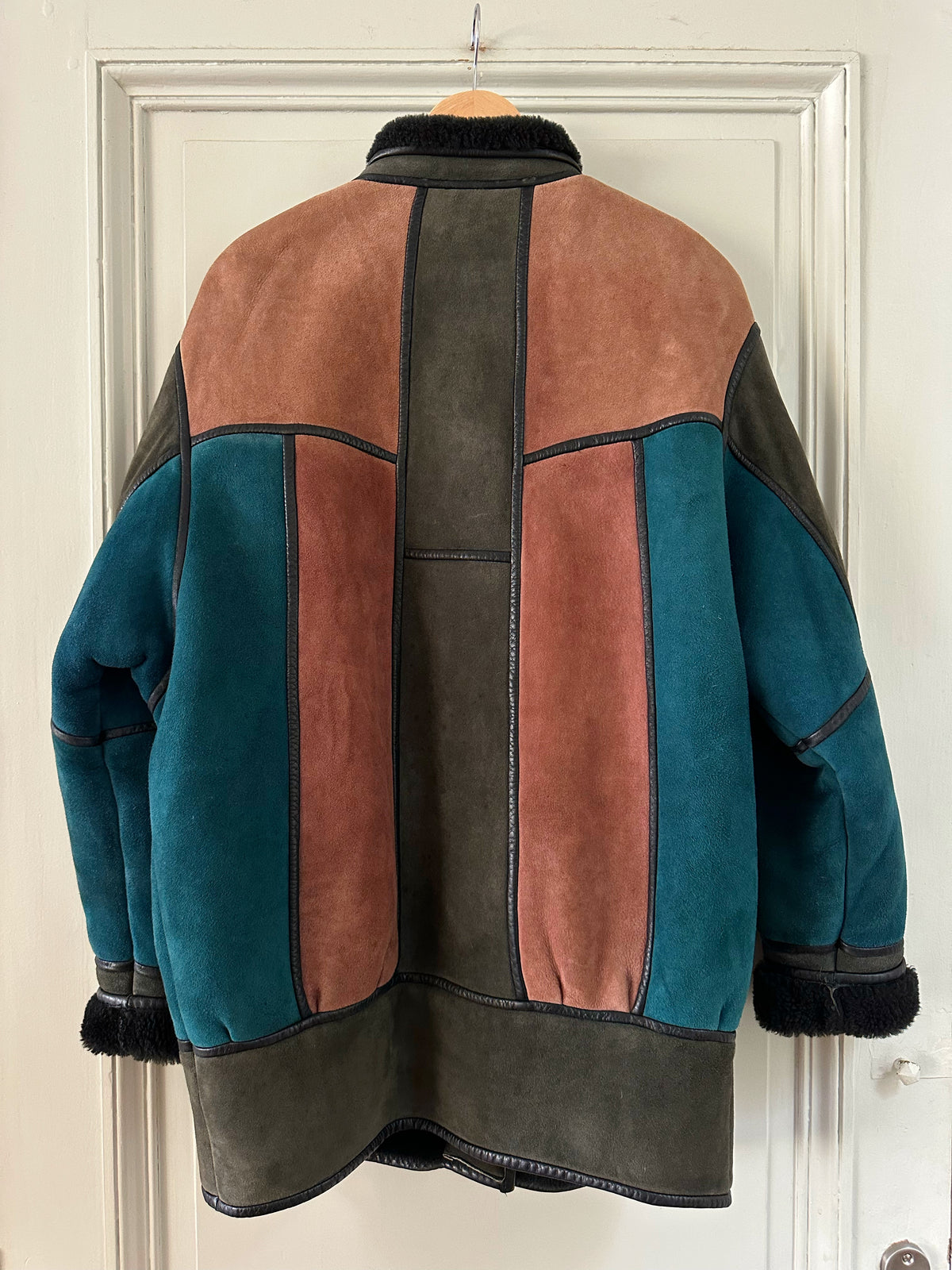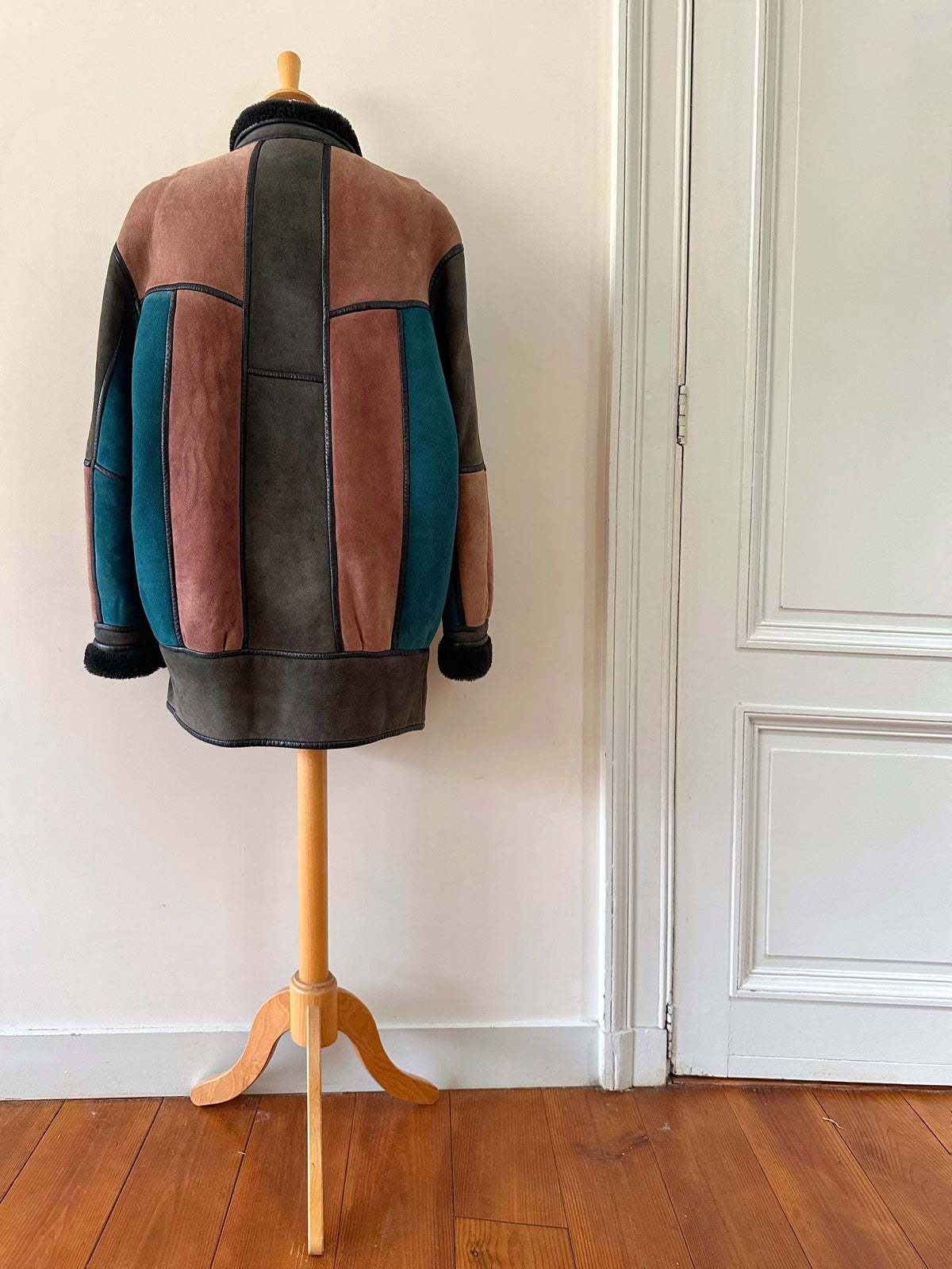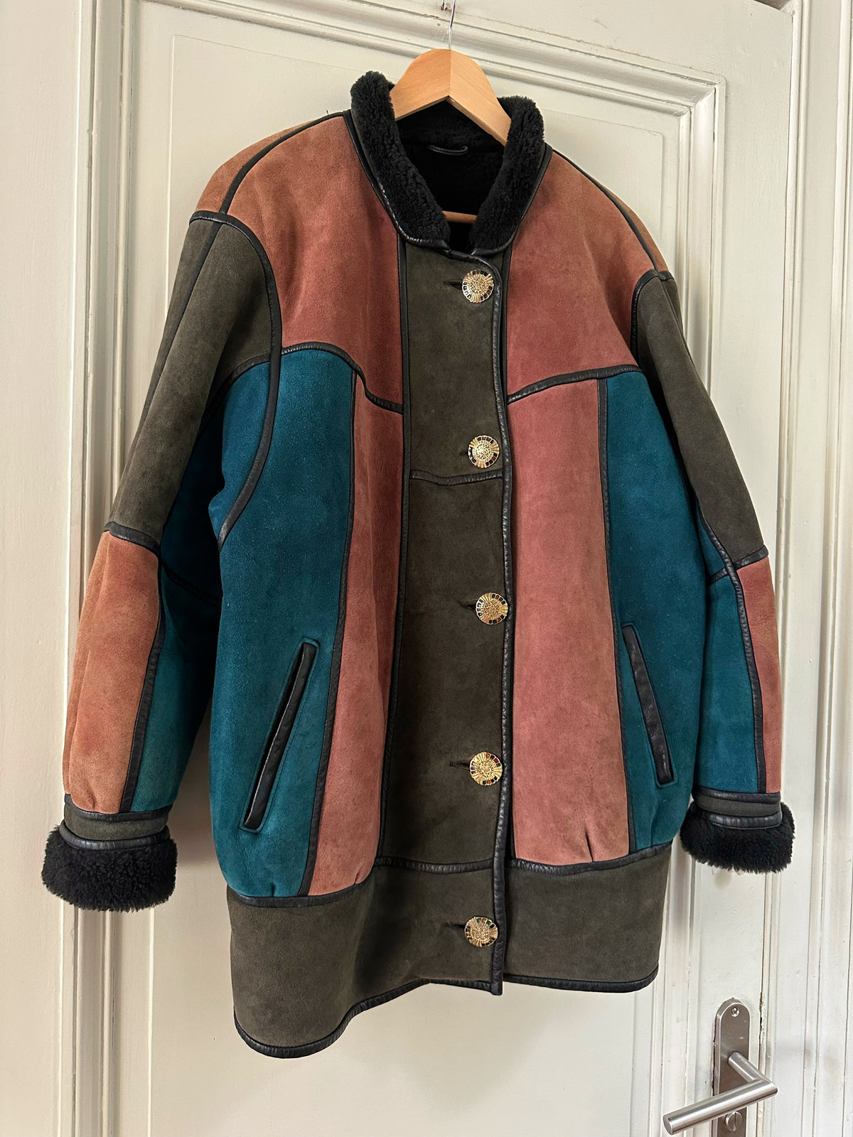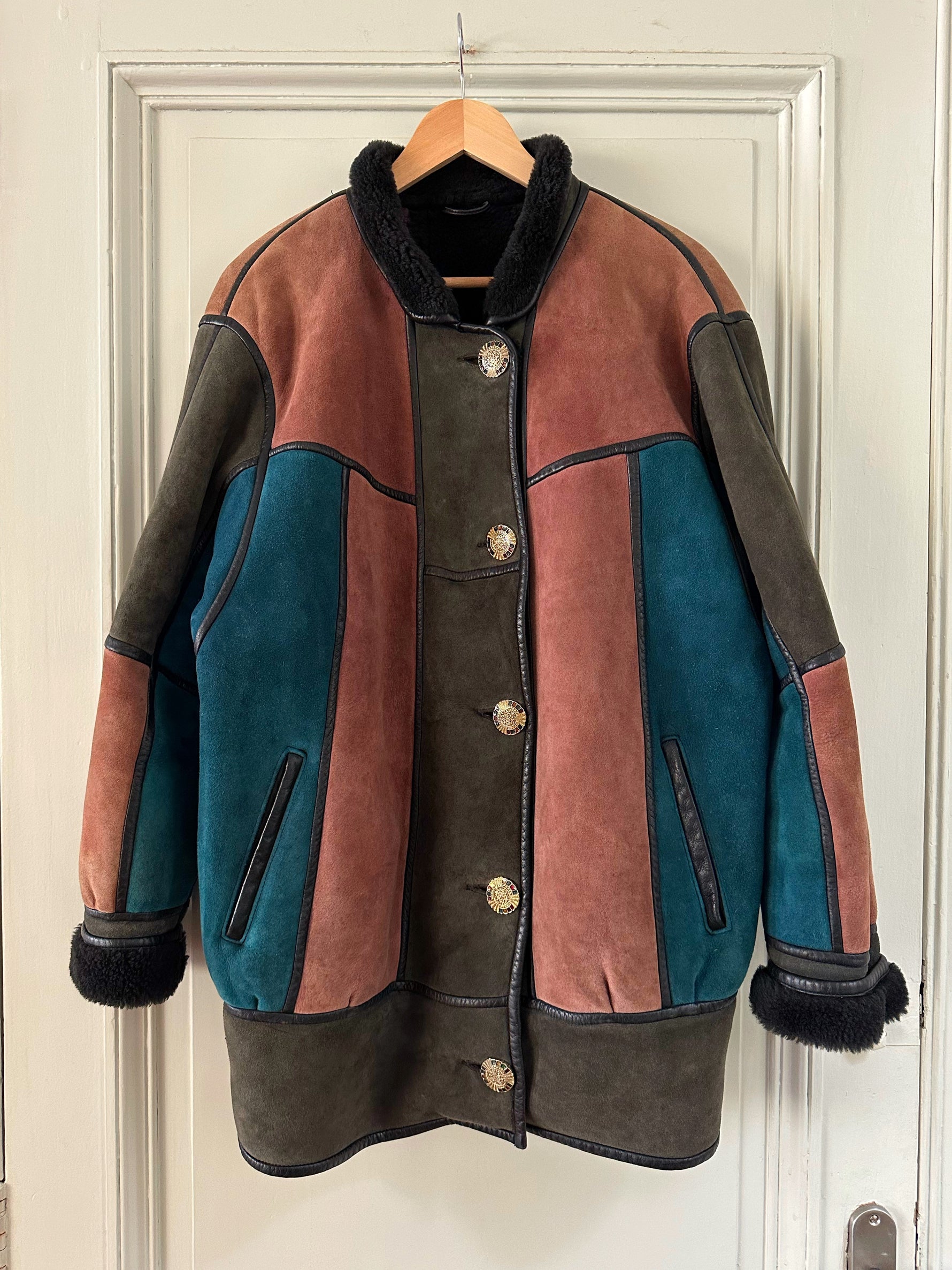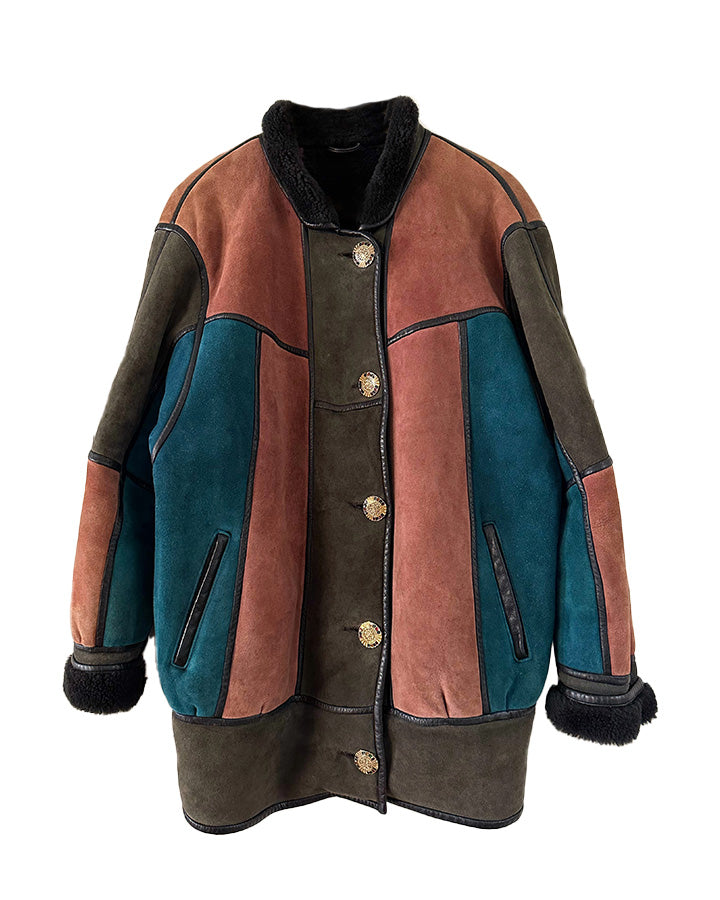 Prix unitaire parPeau lainée en mouton retourné, exterieur daim à empiècements patchwork multicolores bleu petrole, rose ancien, vert olive, interieur laine de mouton, ganses en cuir noirs. Boutons bijoux fleuris multicolores. Fabriqué en France. Taille 38 porté ici sur un mannequin T36 et sur une personne T40. Longueur 80cm.