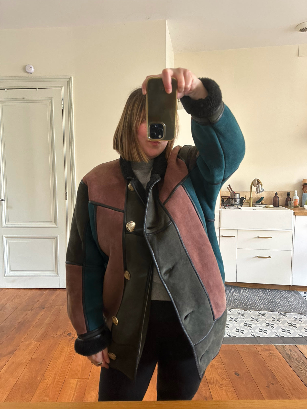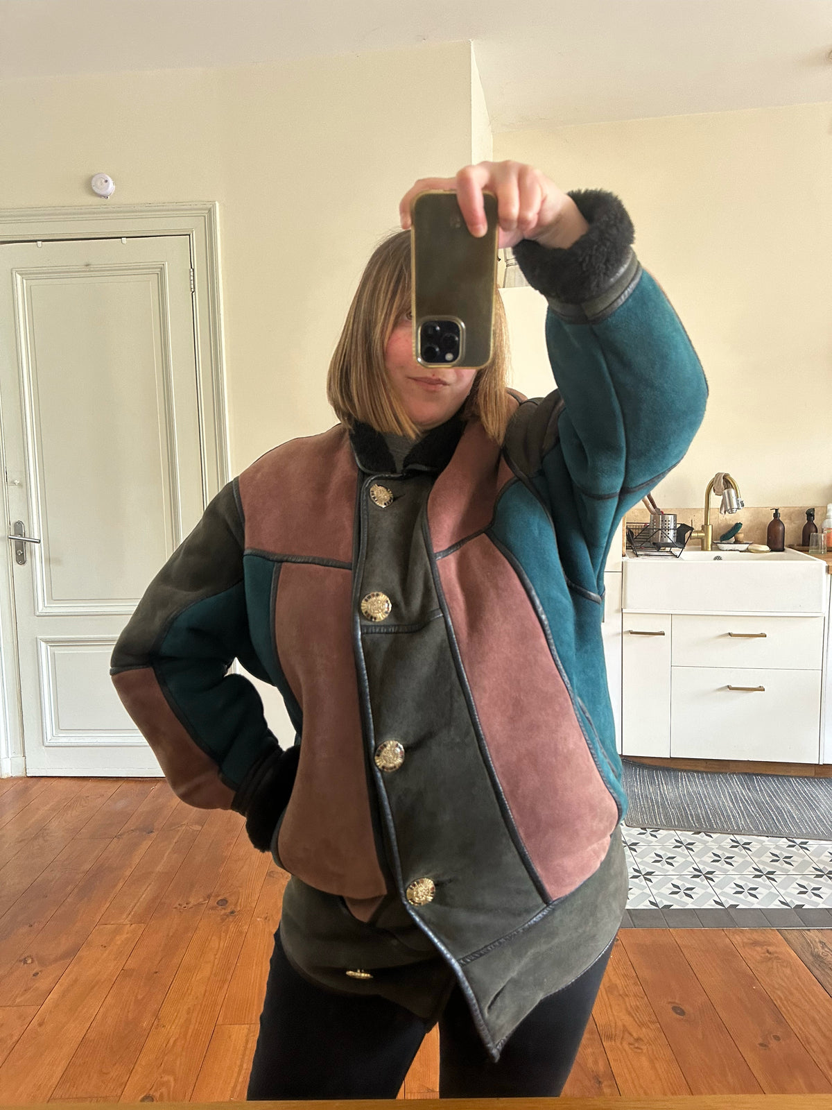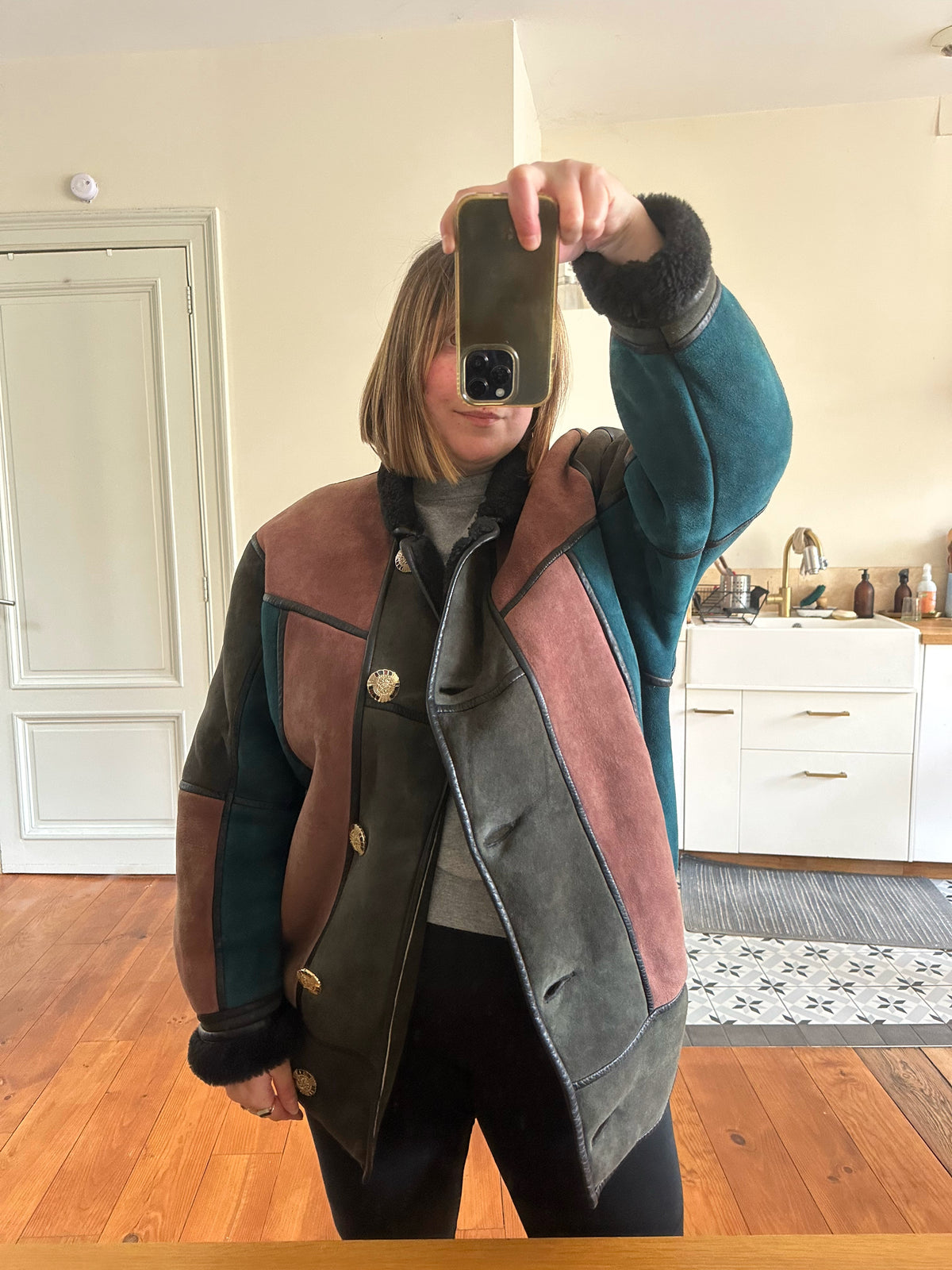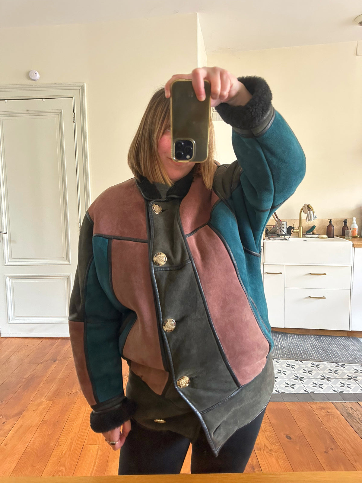 Prix unitaire parPeau lainée en mouton retourné, exterieur daim à empiècements patchwork multicolores bleu petrole, rose ancien, vert olive, interieur laine de mouton, ganses en cuir noirs. Boutons bijoux fleuris multicolores. Fabriqué en France. Taille 38 porté ici sur un mannequin T36 et sur une personne T40. Longueur 80cm.