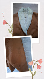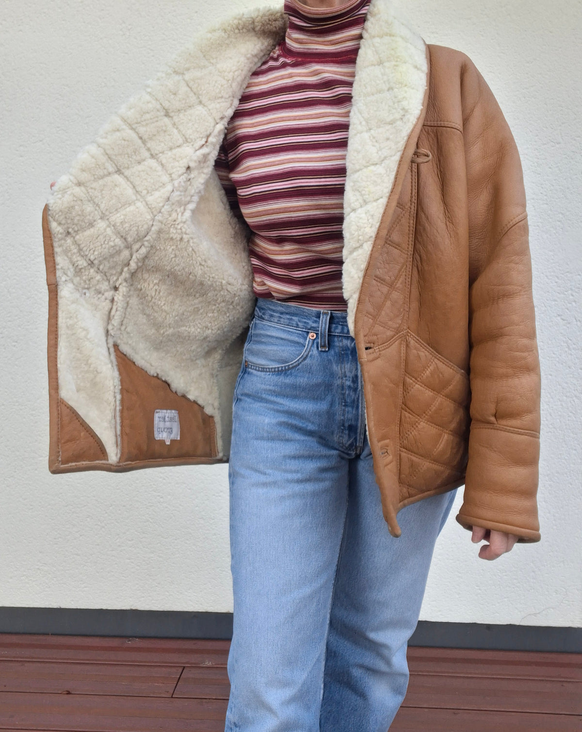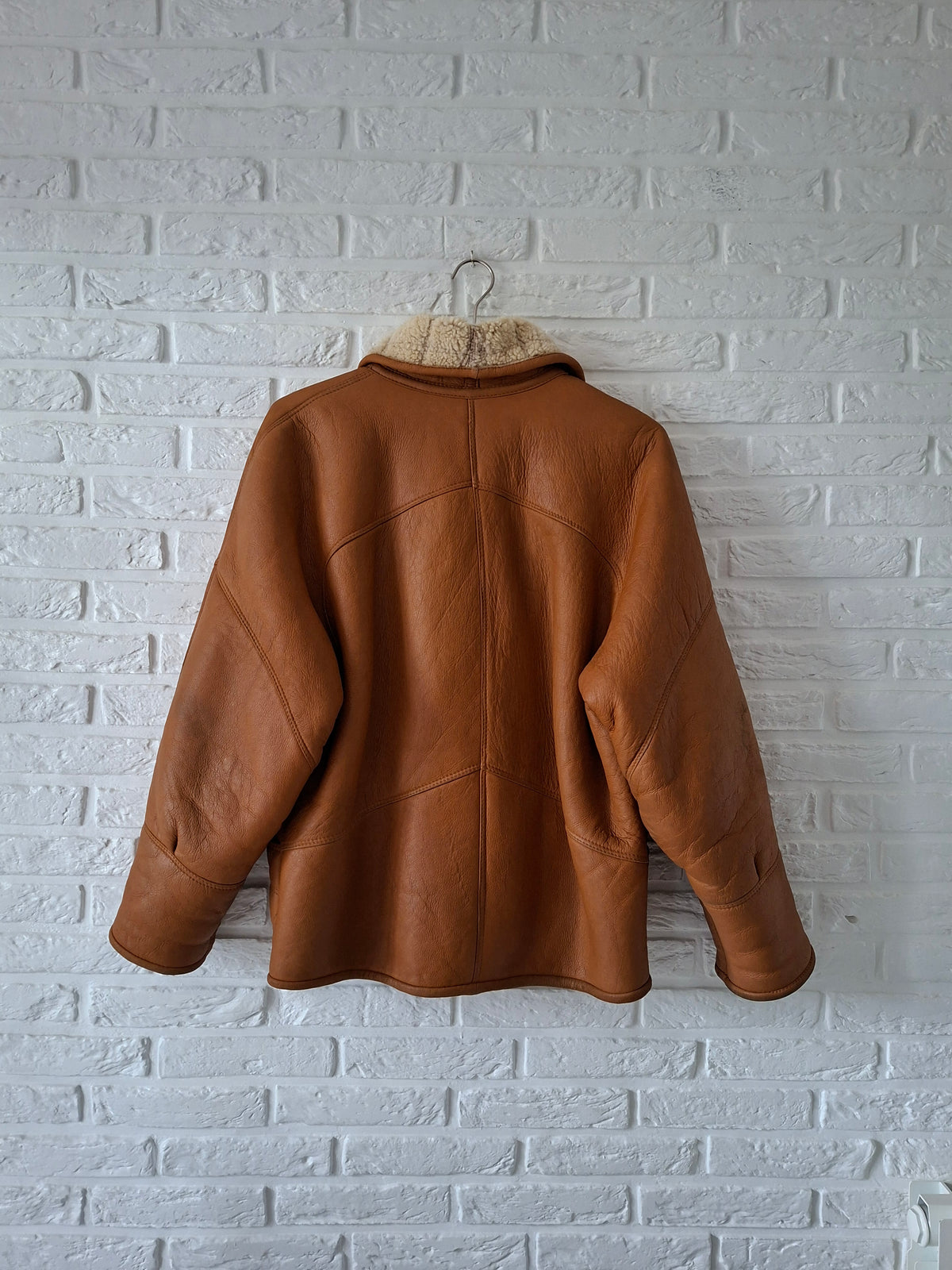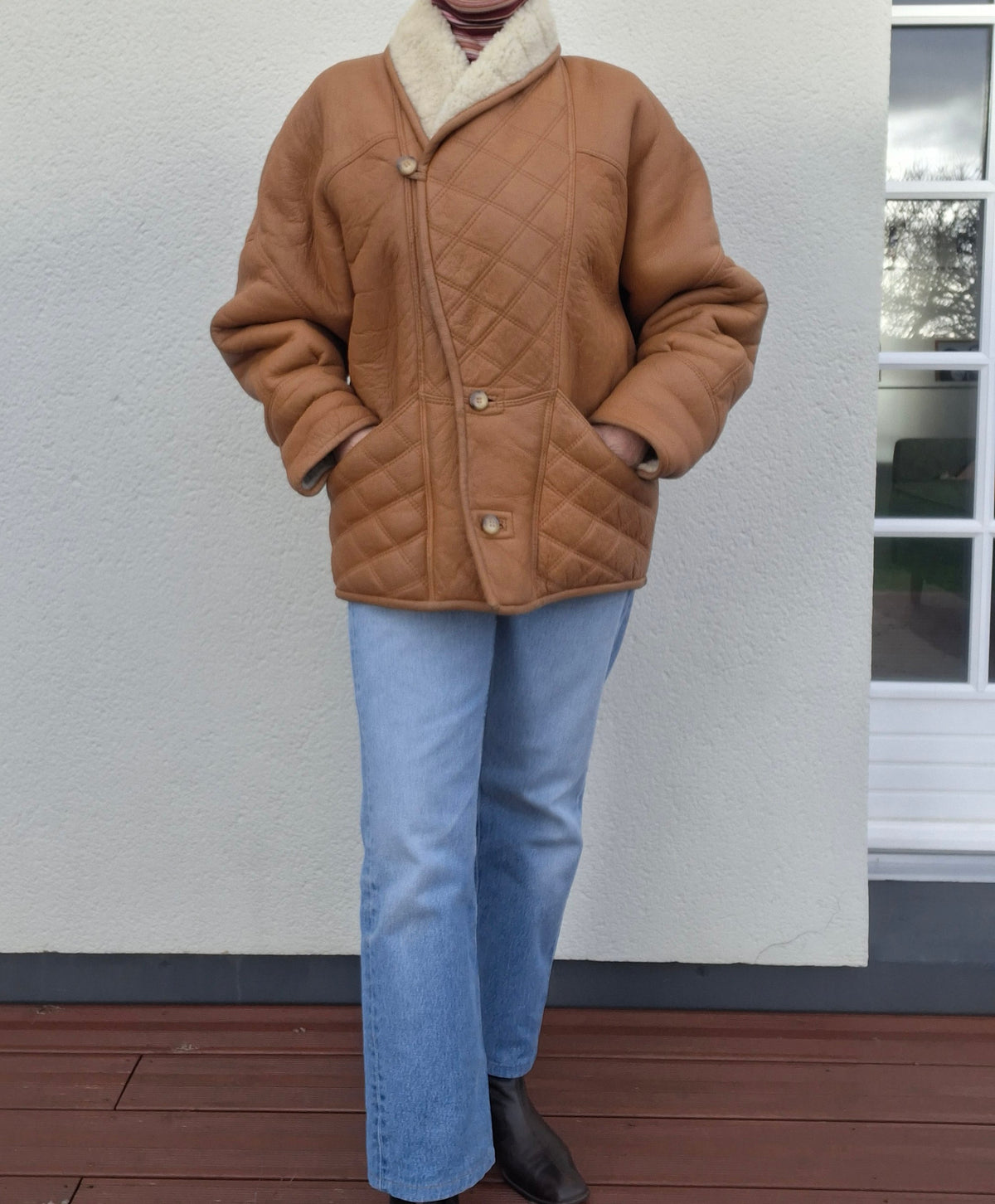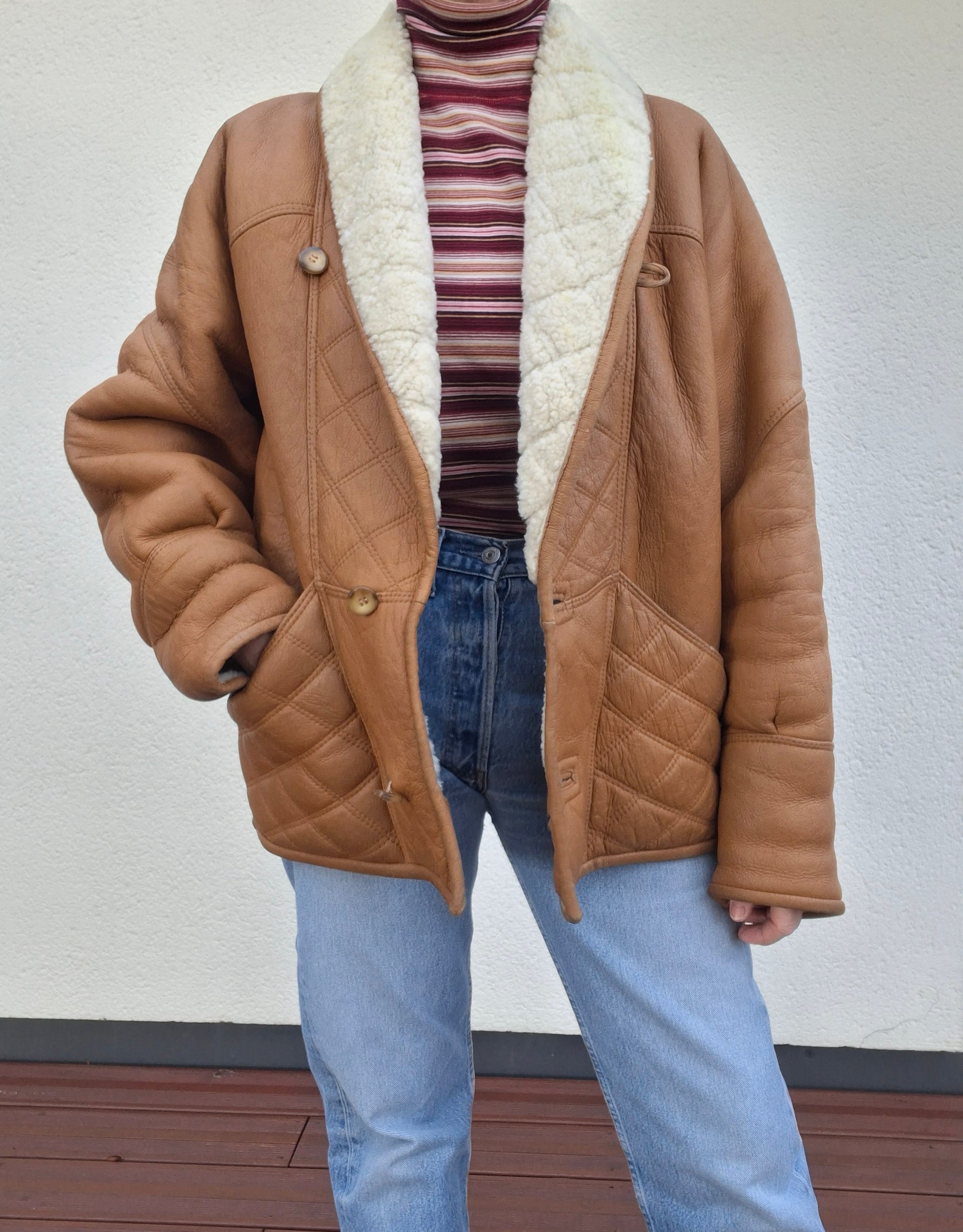 Peau lainée vintage 90's en cuir.Extérieur en cuir caramel surpiqué en croisillons devant et sur les 2 poches. Intérieur en mouton écru. Emmanchures raglan. Fermeture boutonnée. Poitrine 60cm.Longueur 68cm.Signe d’usure sans impact sur l’état général.