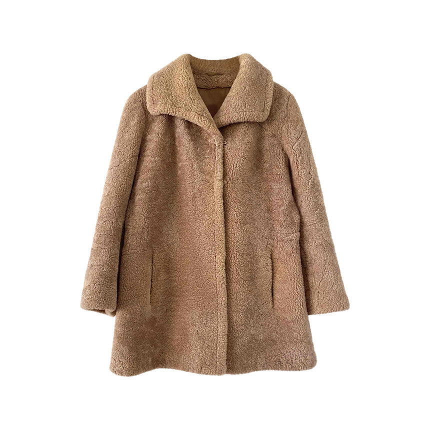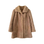 Peau lainée en mouton retourné extérieur fourrure de laine de mouton beige, mouton doré, col et fermeture par crochets, années 70’s, taille 36 et 38 portée ici sur un mannequin T36 et serrée sur une personne T40.