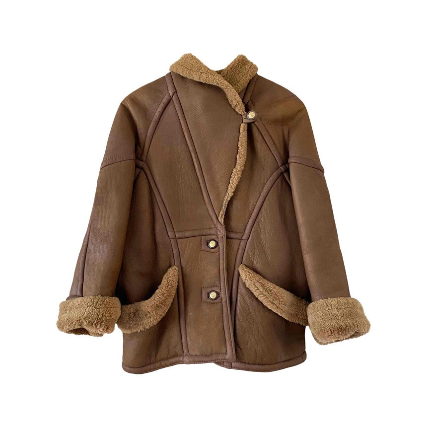 Peau lainée en mouton retourné extérieur cuir marron, intérieur mouton camel, grand col châle à boutonner, détails poches et revers de poignets moutons, fabriqué en Italie, taille 38 porté ici sur une personne T40.