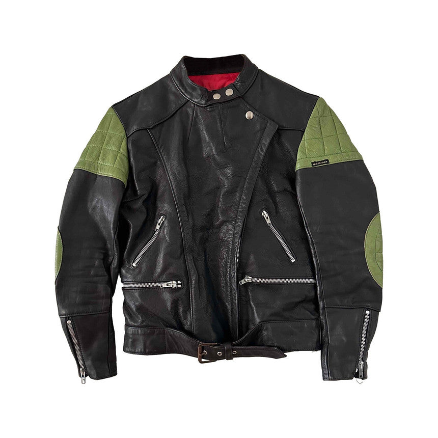 Perfecto en cuir, noir, coudières et renforts epaules matelassés en cuir vert, intérieur matelassé rouge, détails perfectos fermeture éclair, boutons pressions, sangle a boucle, fabriqué en France, taille 34 et 36 porté ici sur un mannequin T36.