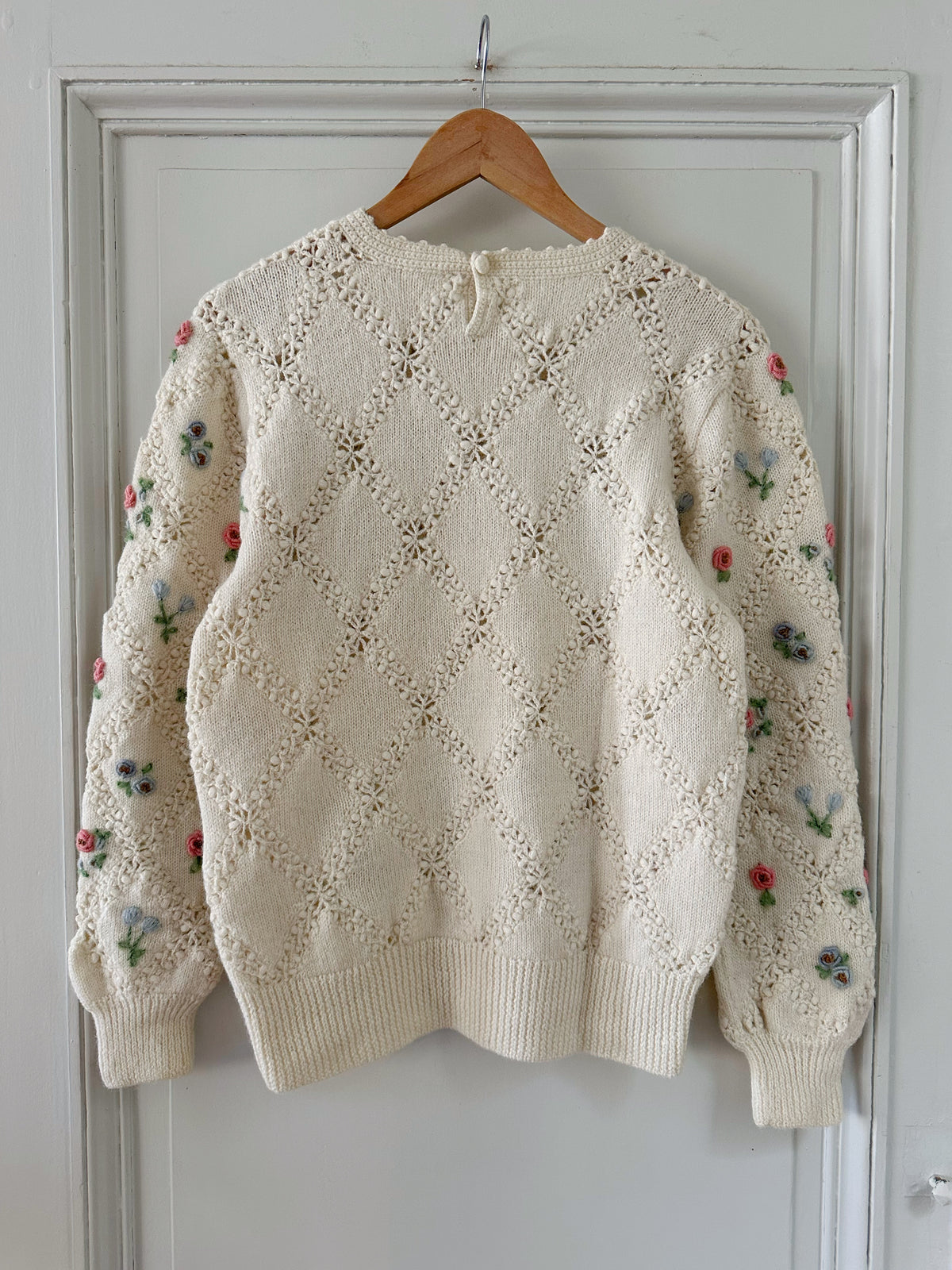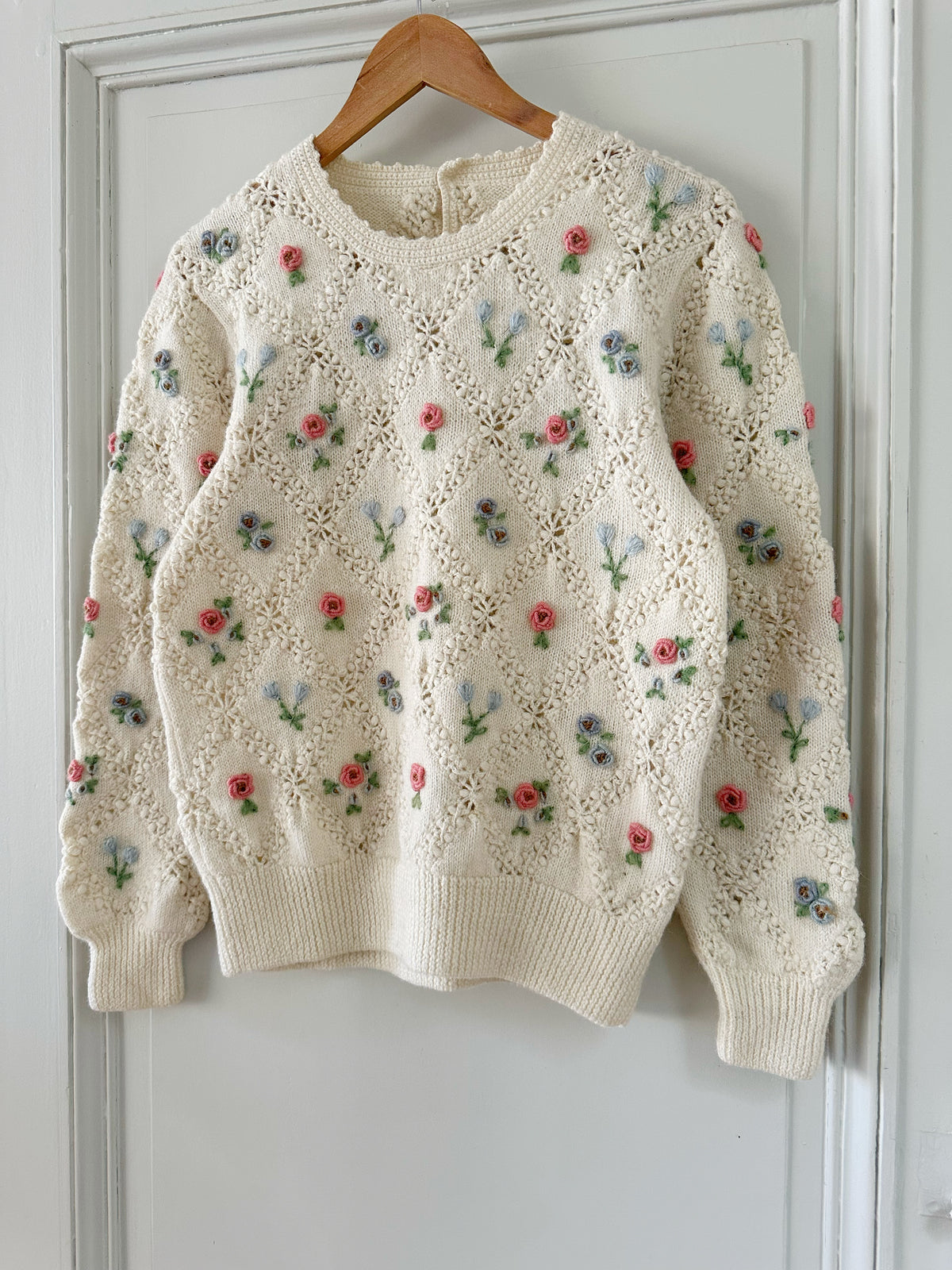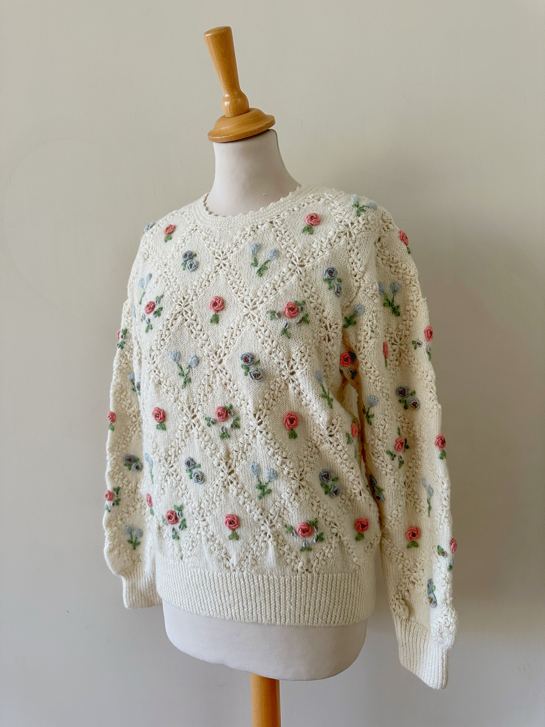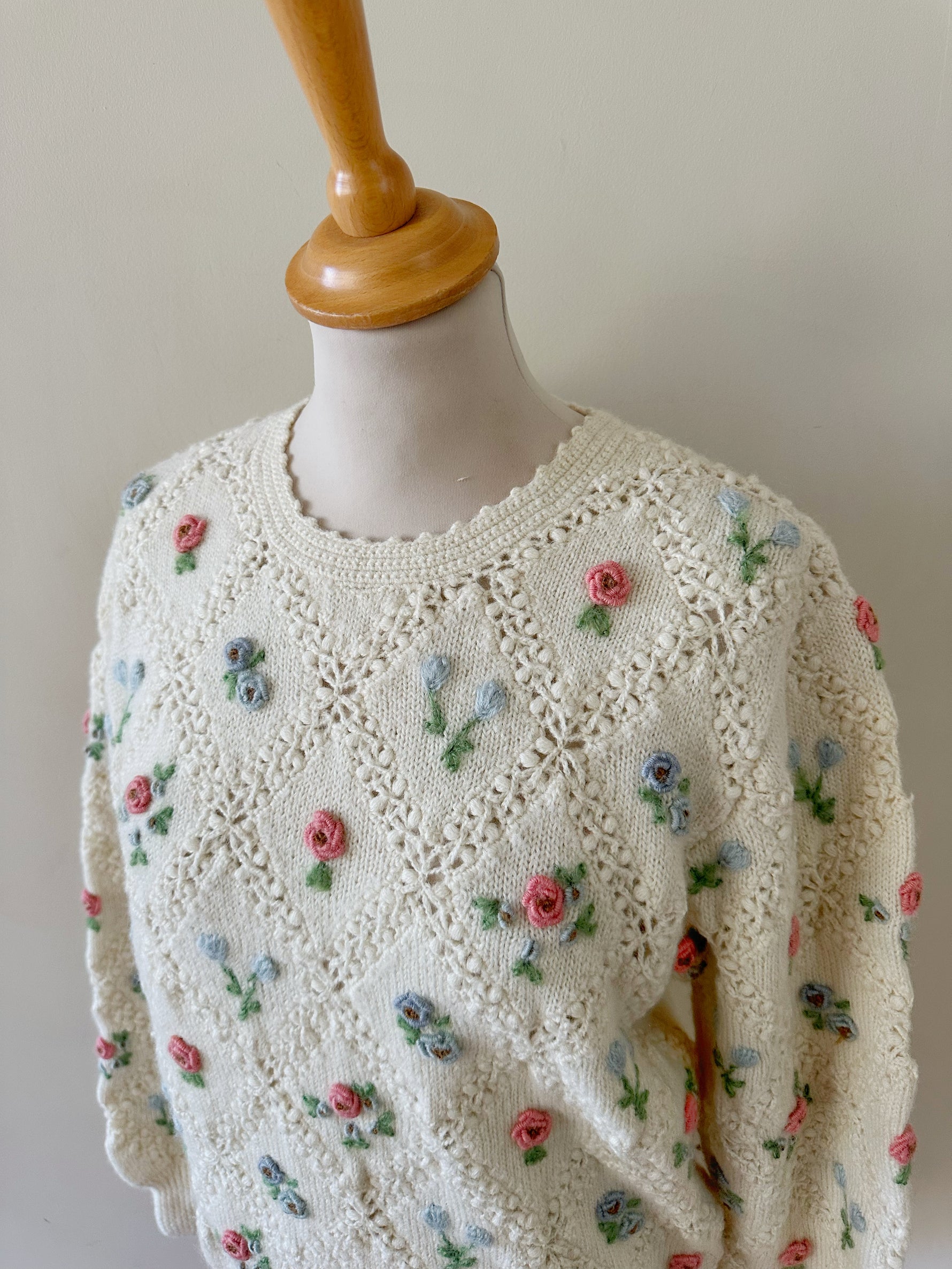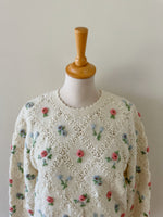 Prix unitaire parPull en pure laine écrue, maille ajourée facçon crochet, et brodé de fleurs multicolores pastels roses, bleues, vertes. Années 90s.Taille 36 portée ici sur un mannequin T36. Longueur 55cm. AMA135