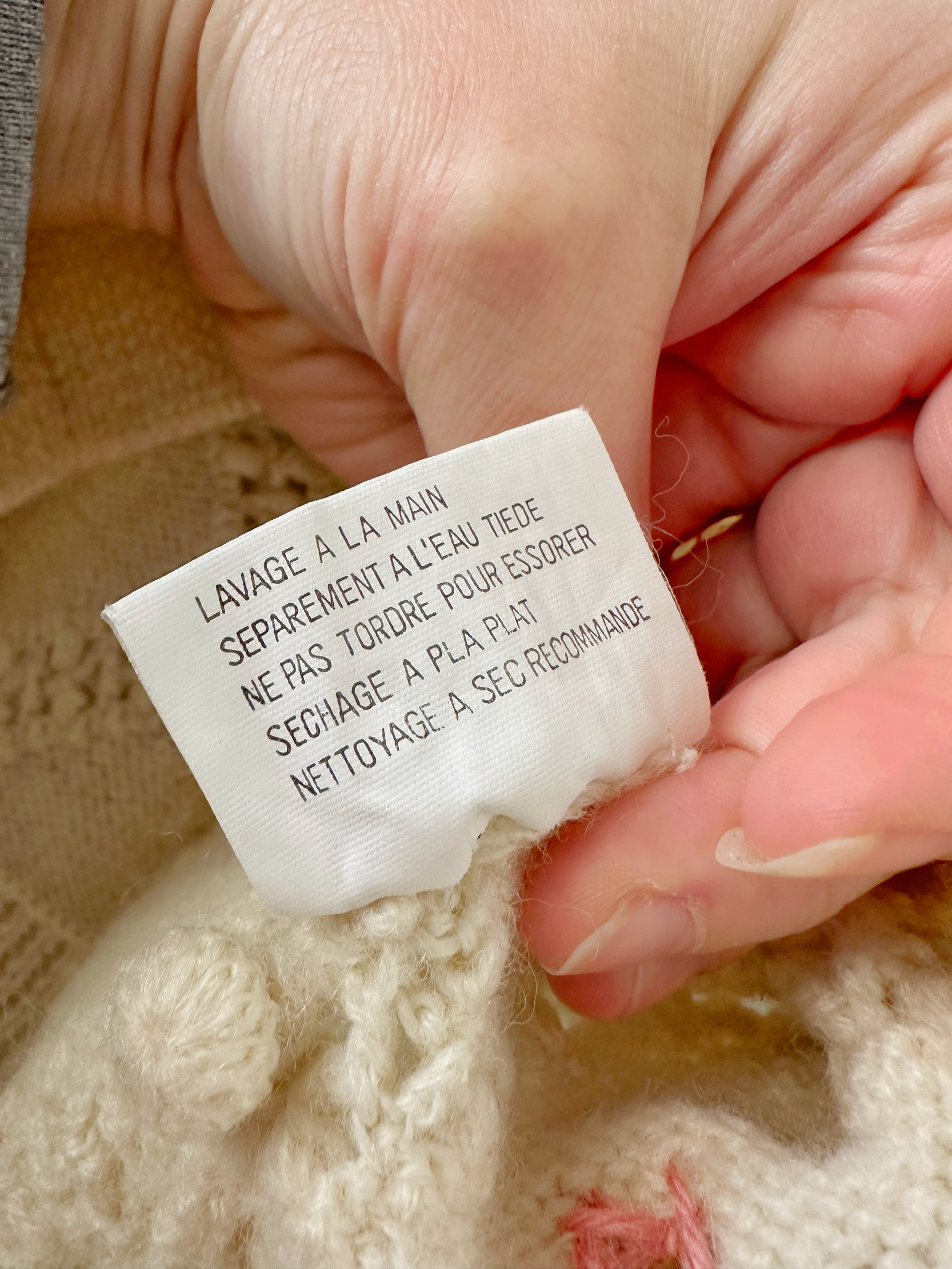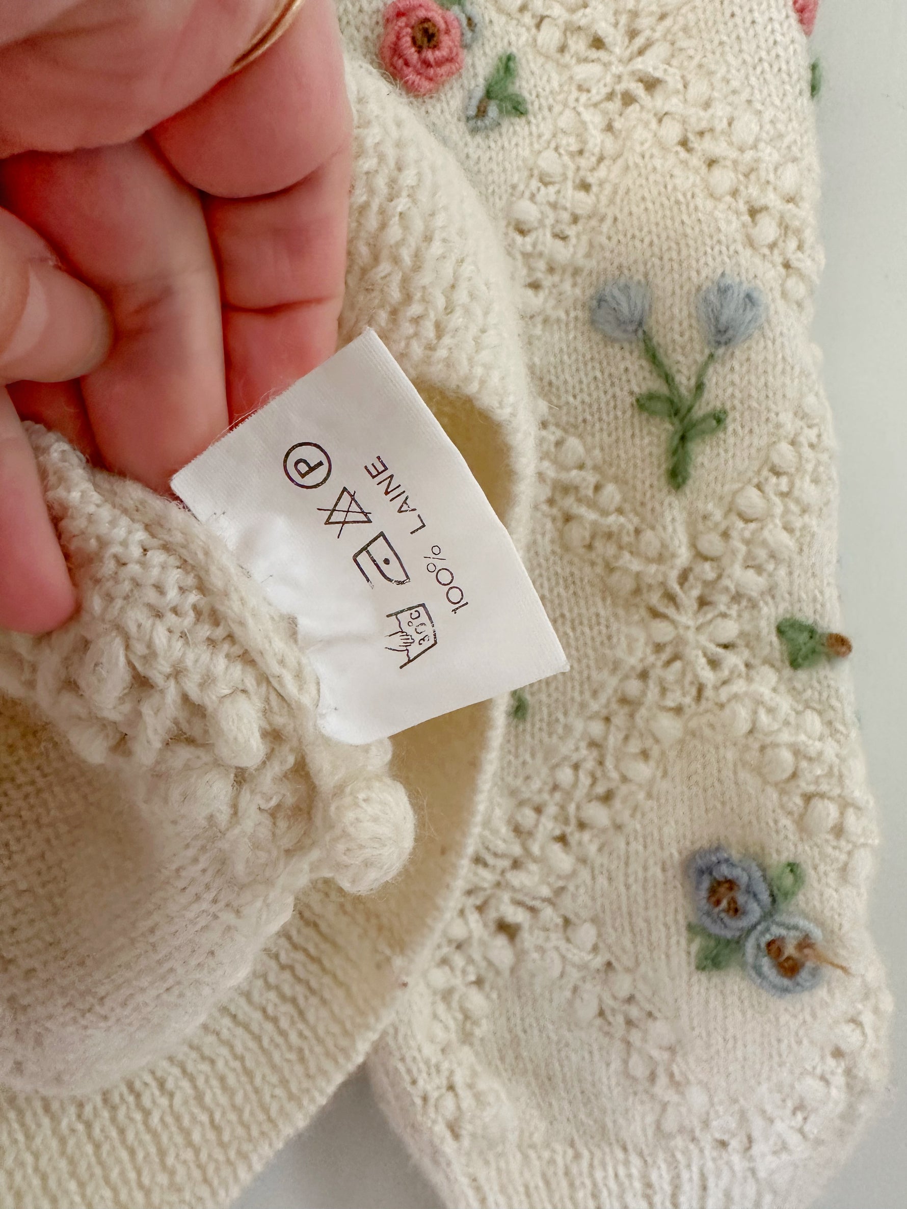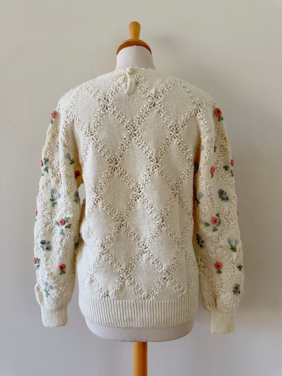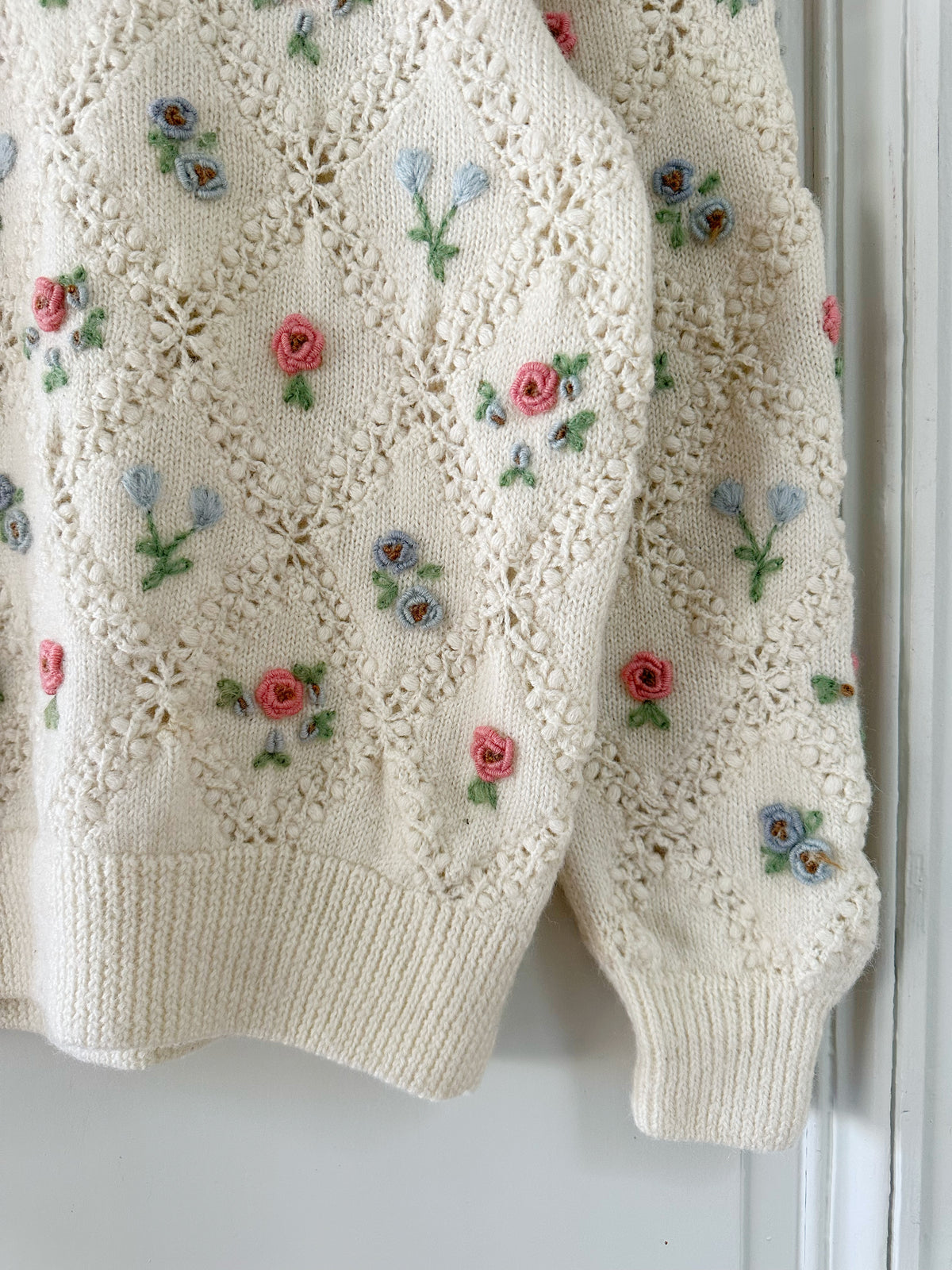 Prix unitaire parPull en pure laine écrue, maille ajourée facçon crochet, et brodé de fleurs multicolores pastels roses, bleues, vertes. Années 90s.Taille 36 portée ici sur un mannequin T36. Longueur 55cm. AMA135