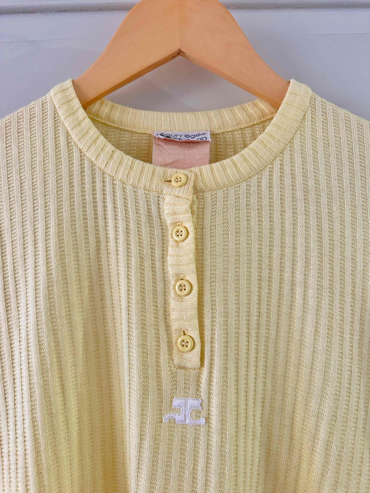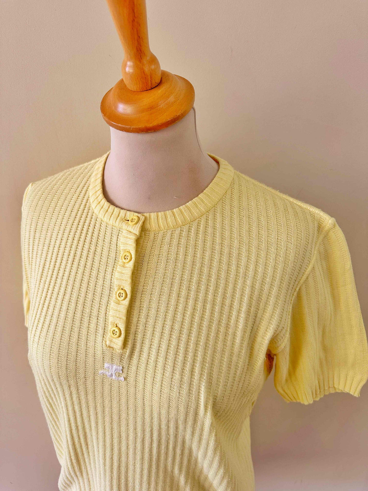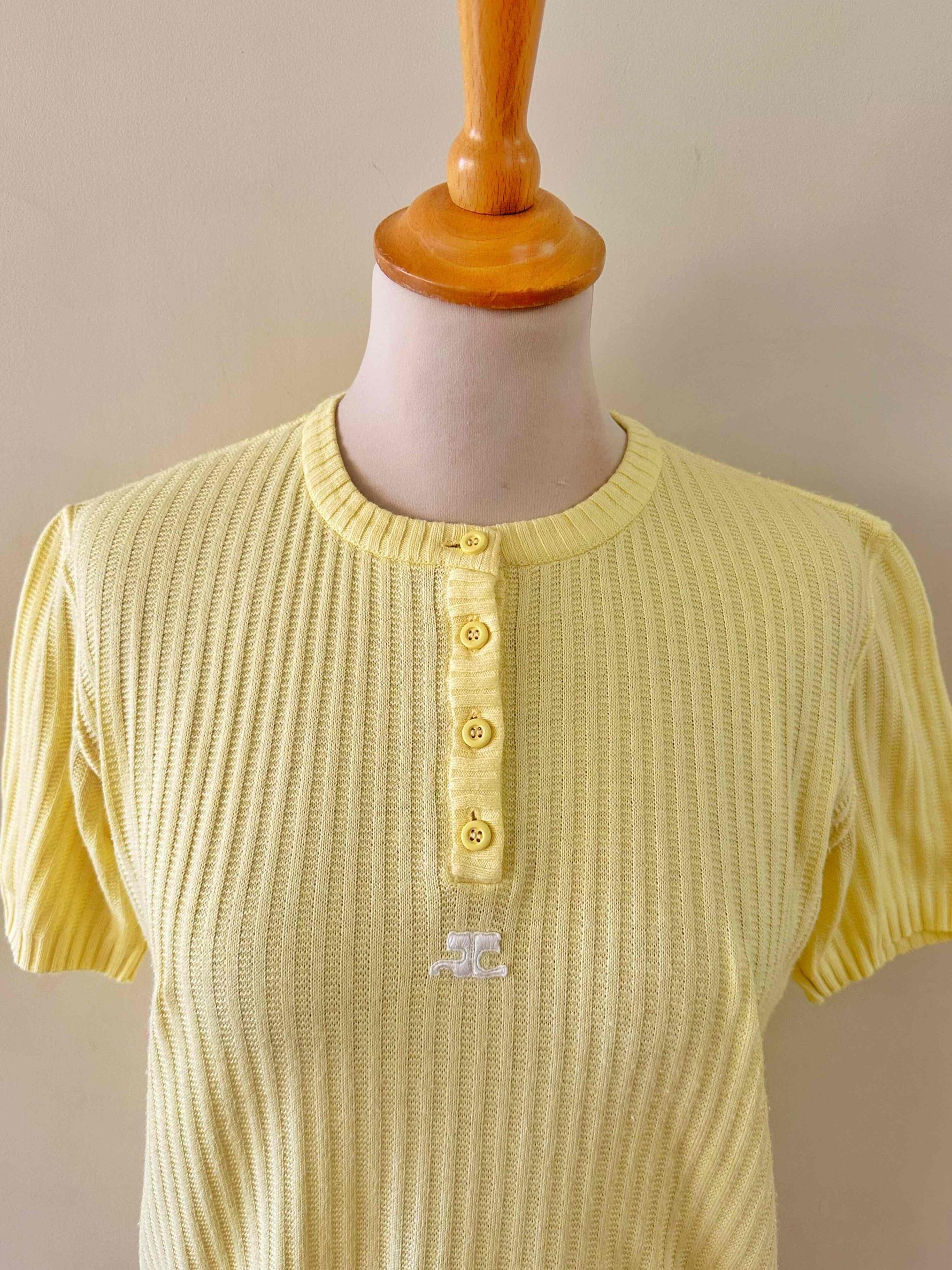 Pull Courrèges manches courtes butter yellow, en maille côtelée laine mélangée, col tunisien boutonné, logo brodé col, fabriqué en France, taille 36 porté ici sur un mannequin T36.