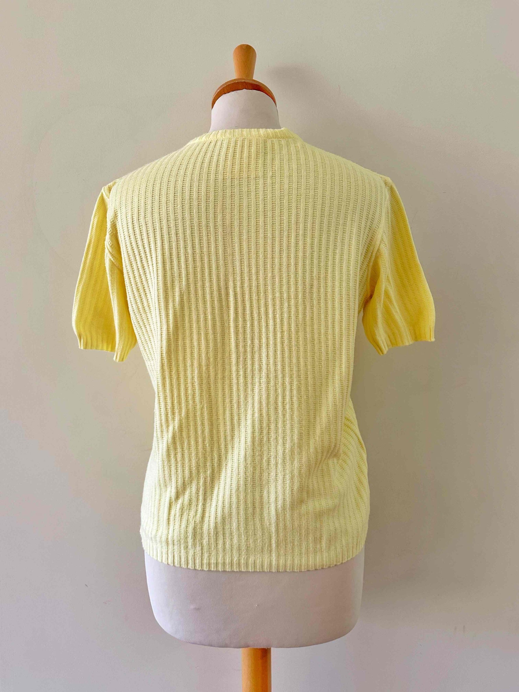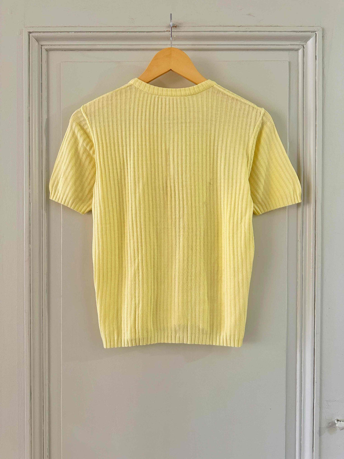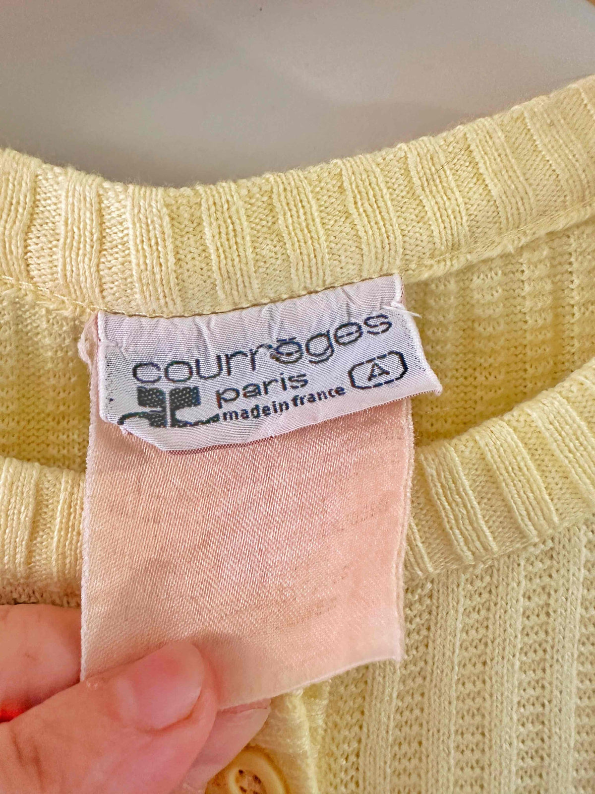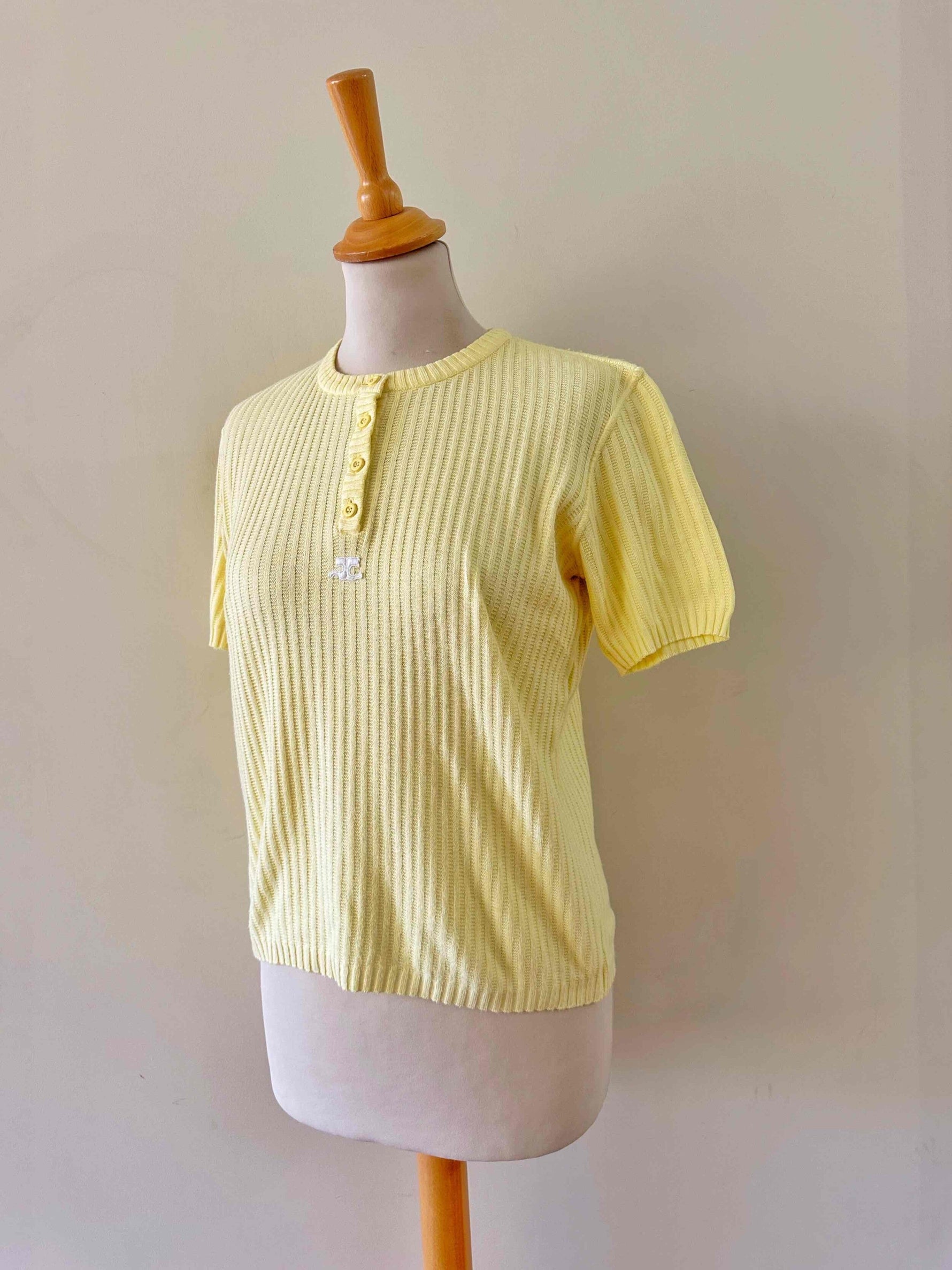 Pull Courrèges manches courtes butter yellow, en maille côtelée laine mélangée, col tunisien boutonné, logo brodé col, fabriqué en France, taille 36 porté ici sur un mannequin T36.