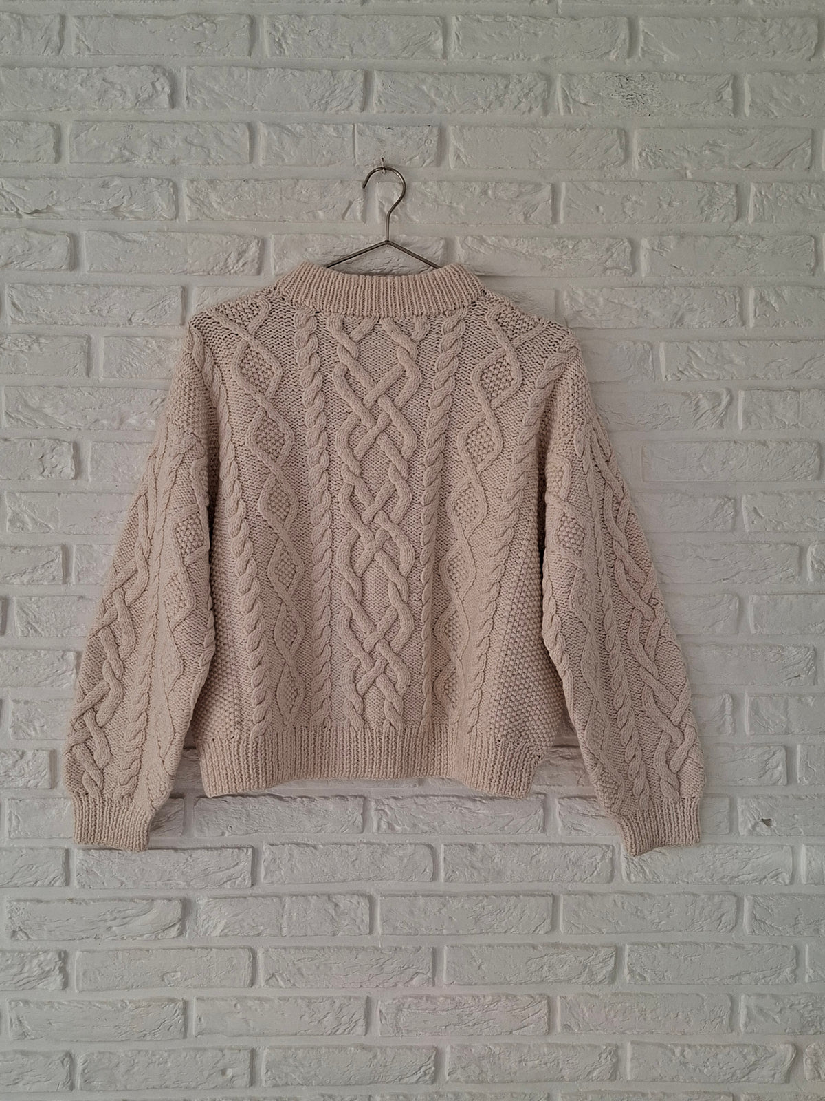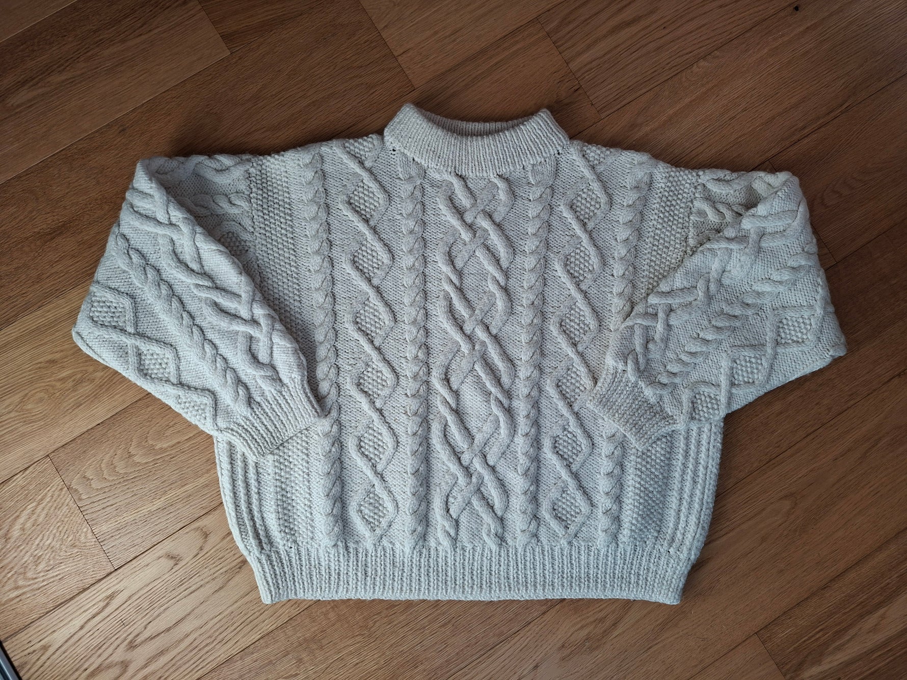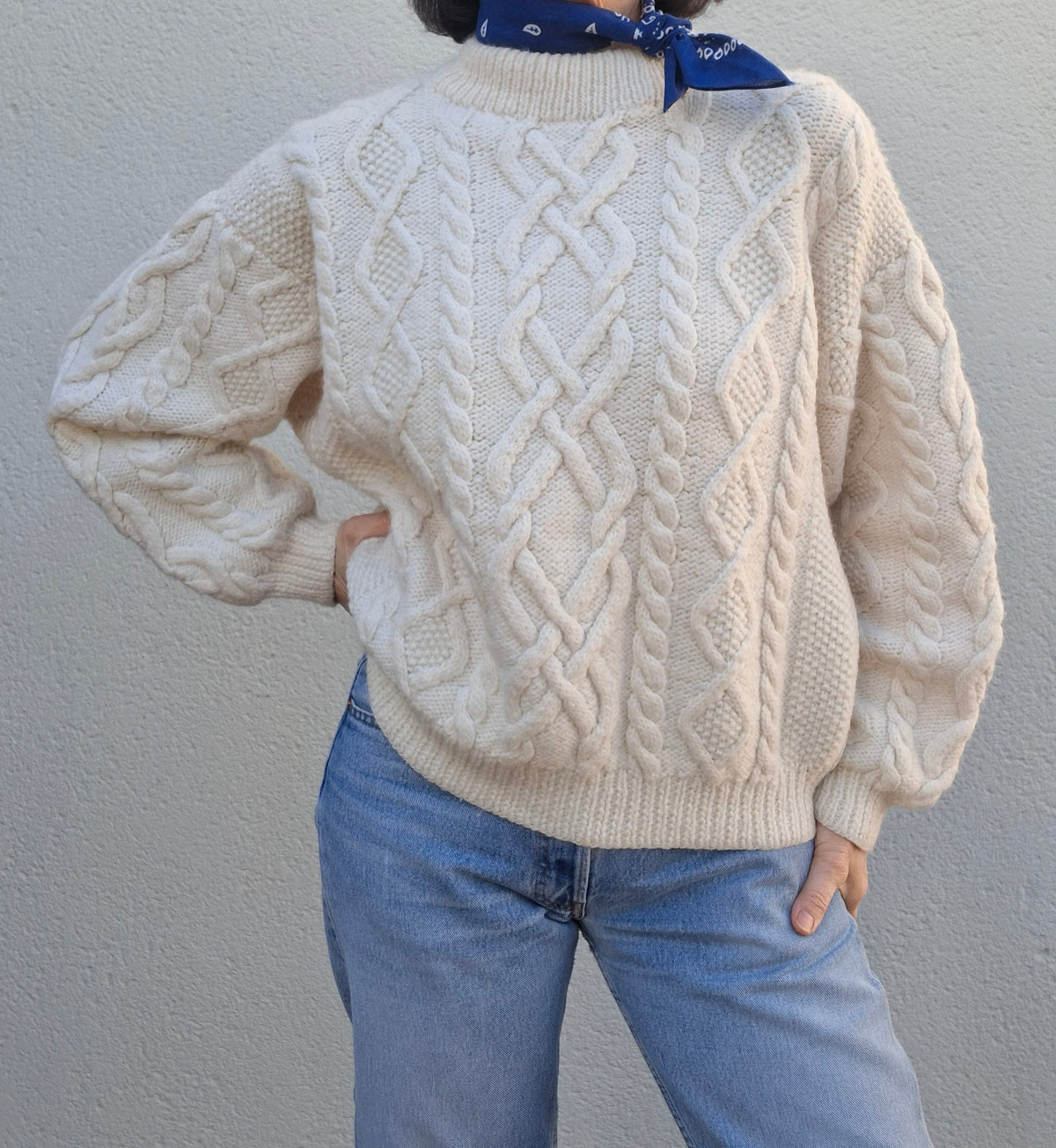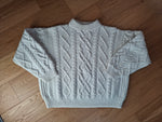 Pull-over irlandais en pure laine écrue. Fait main. En maille torsadée et autres points fantaisie. Col montant. Forme ample et courte. Poitrine 60cm.Longueur 55cm.Taille 40/42