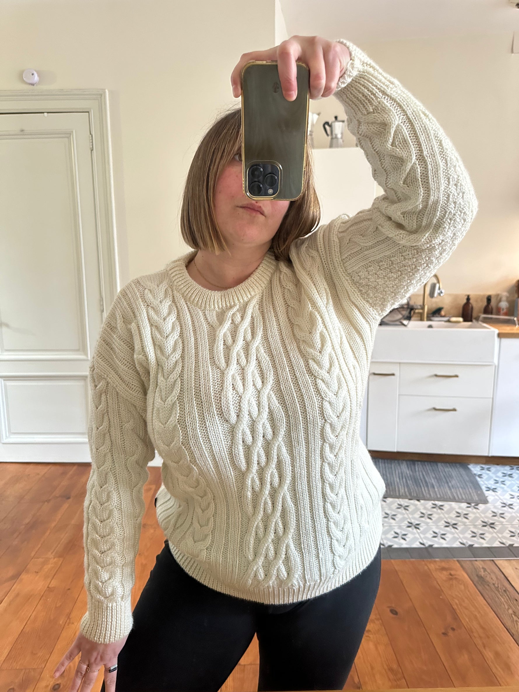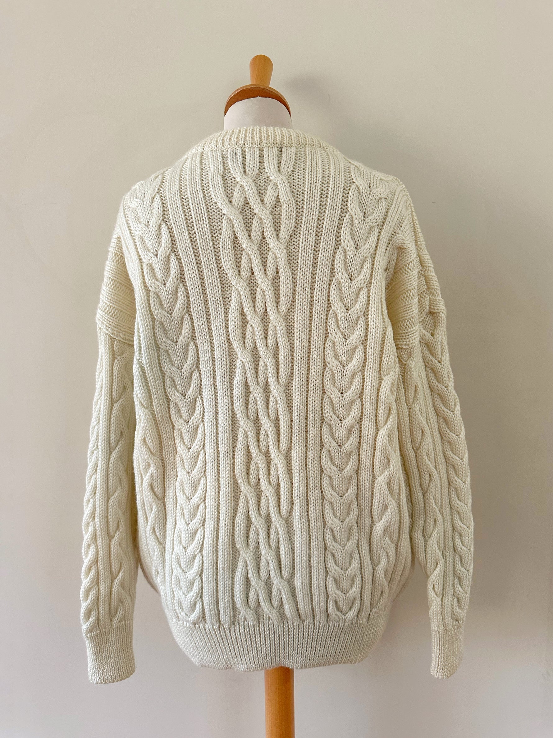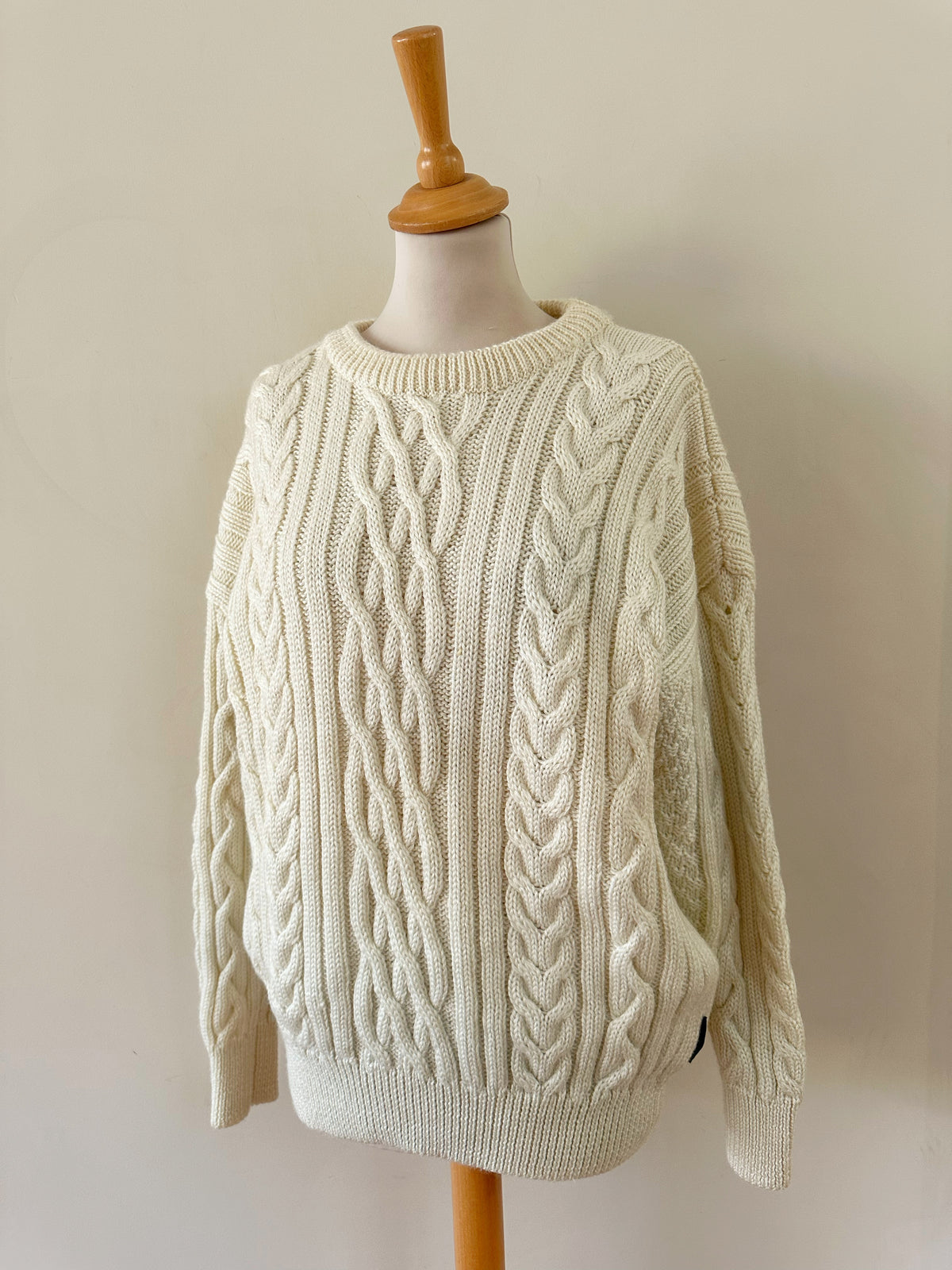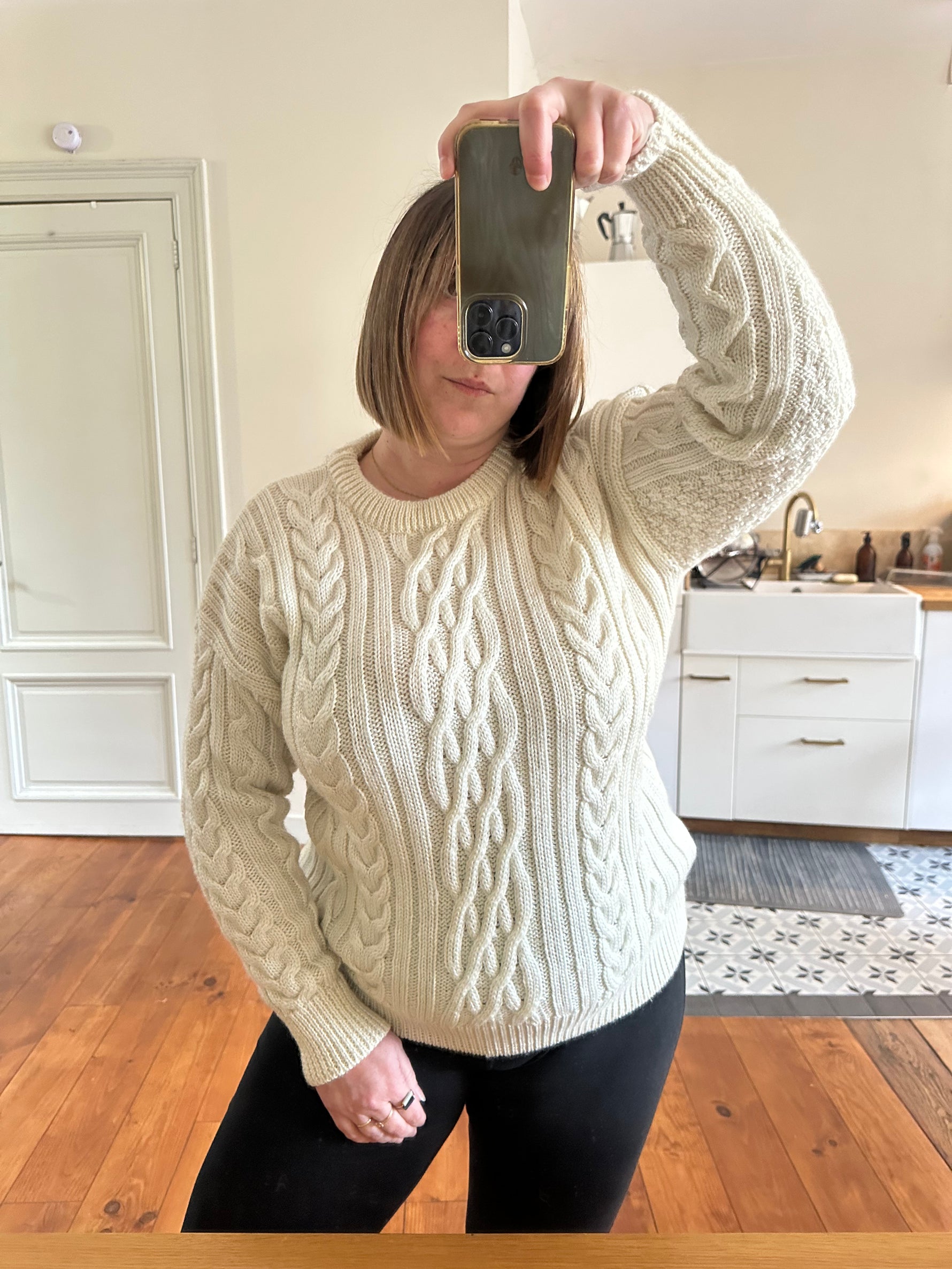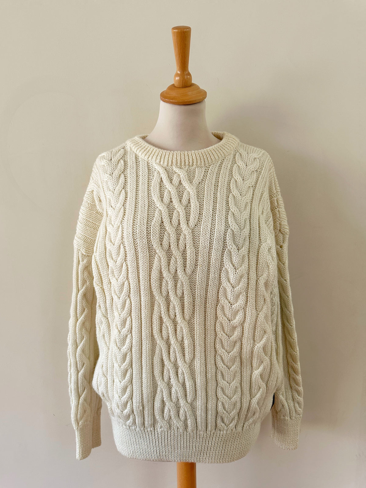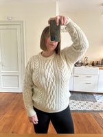 Prix unitaire parPull Irlandais en pure laine anglaise blanc écru, maille torsadée, fabriqué en Angleterre. Convient aux tailles 38 et 40 porté ici sur un mannequin T36 et sur une personne T40. Aisselles 50cm Longueur 65cm.