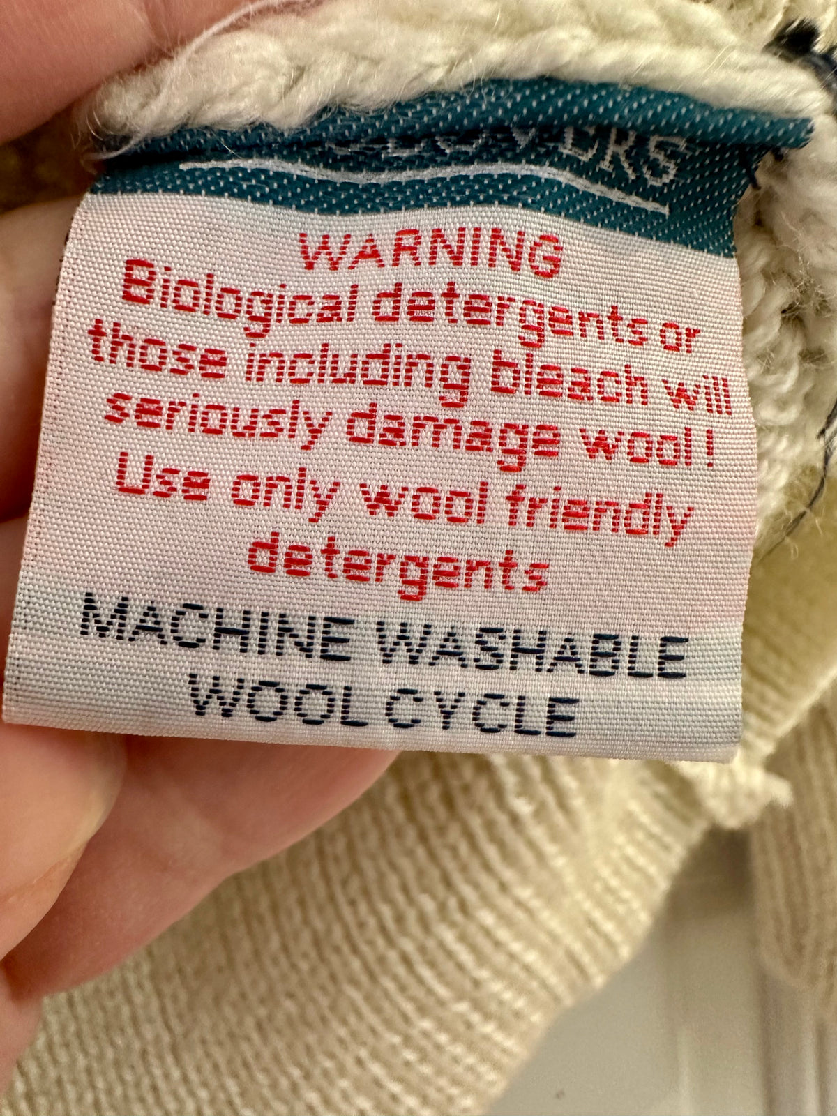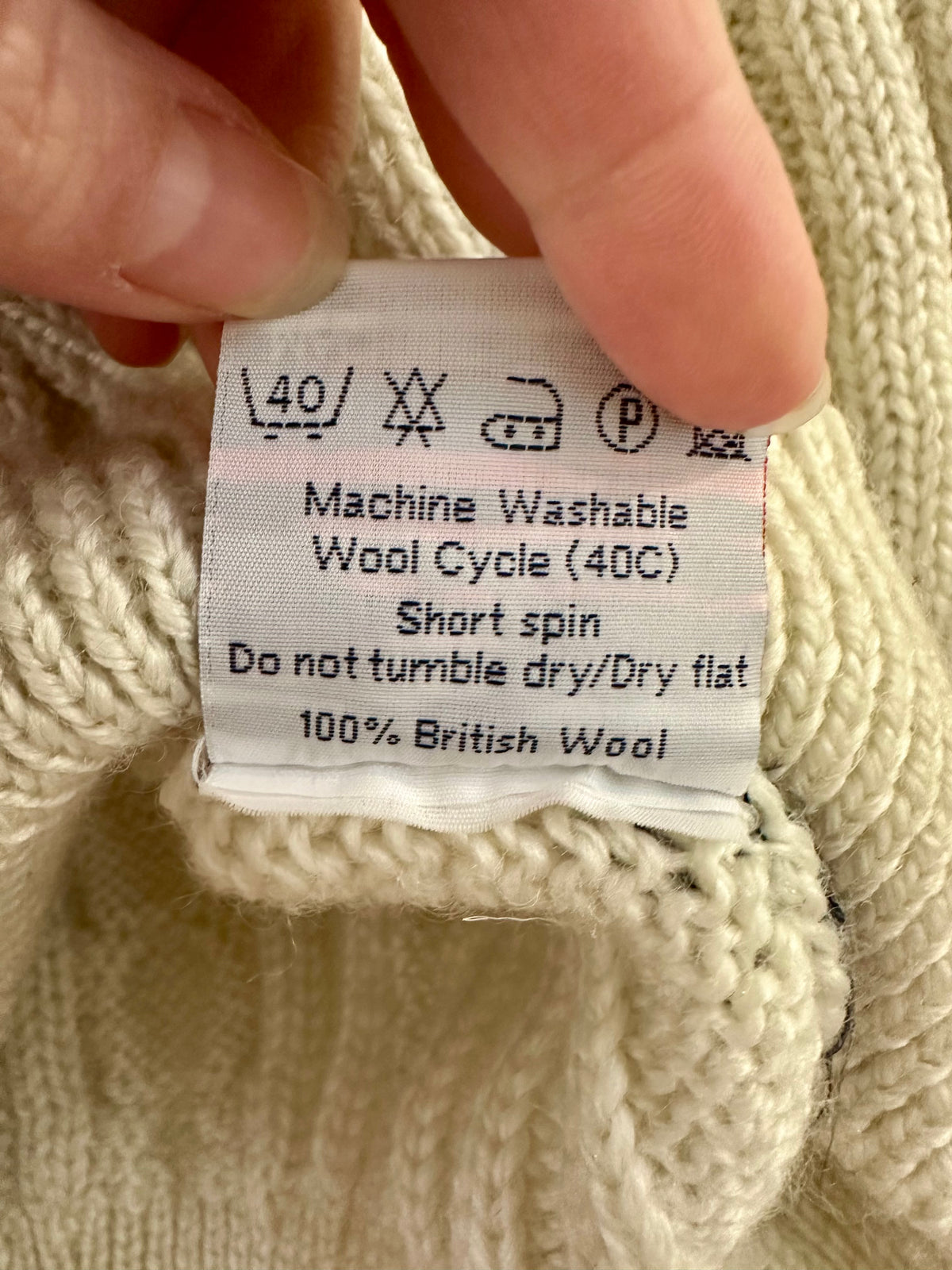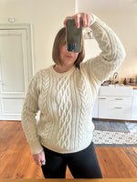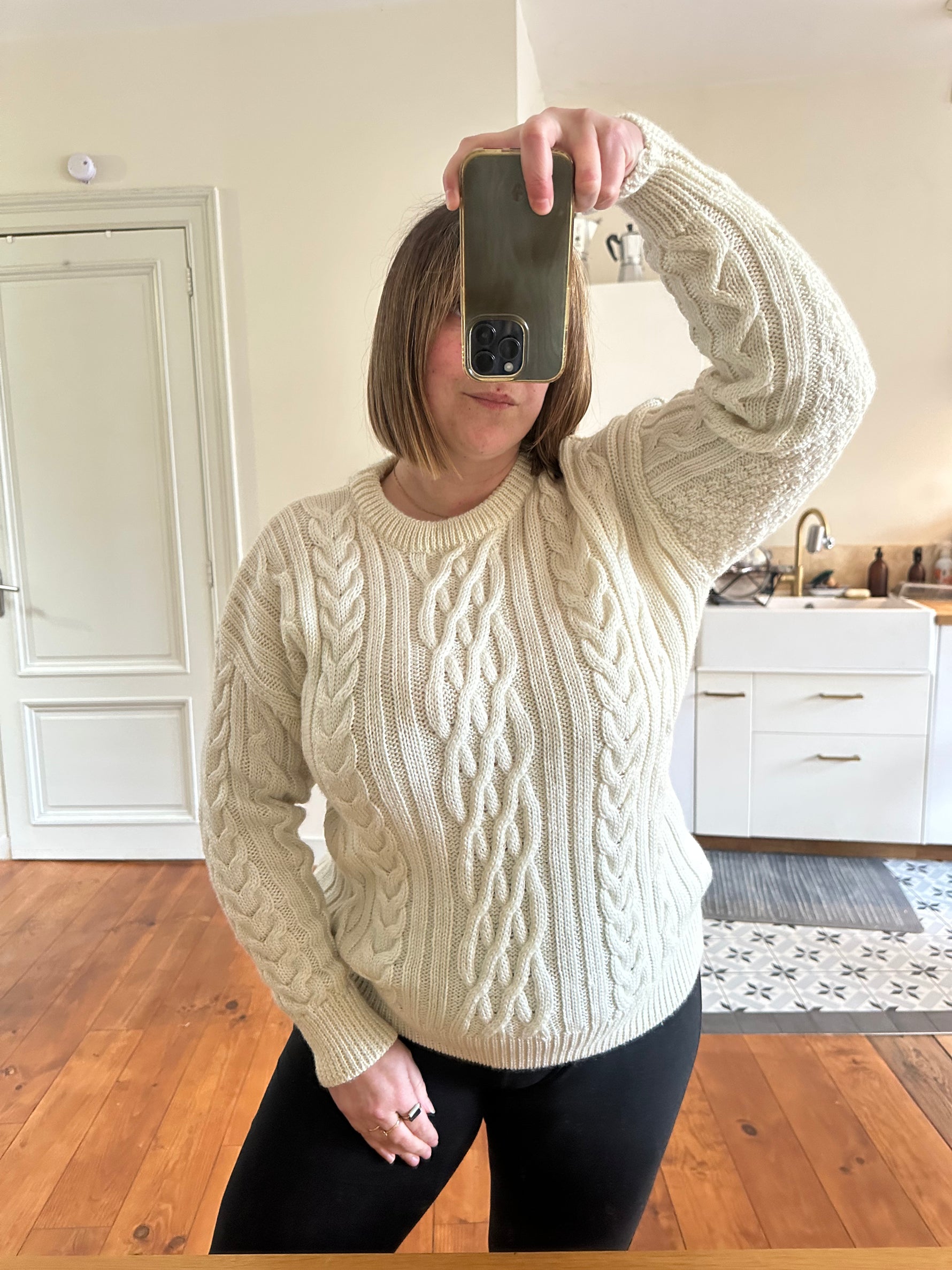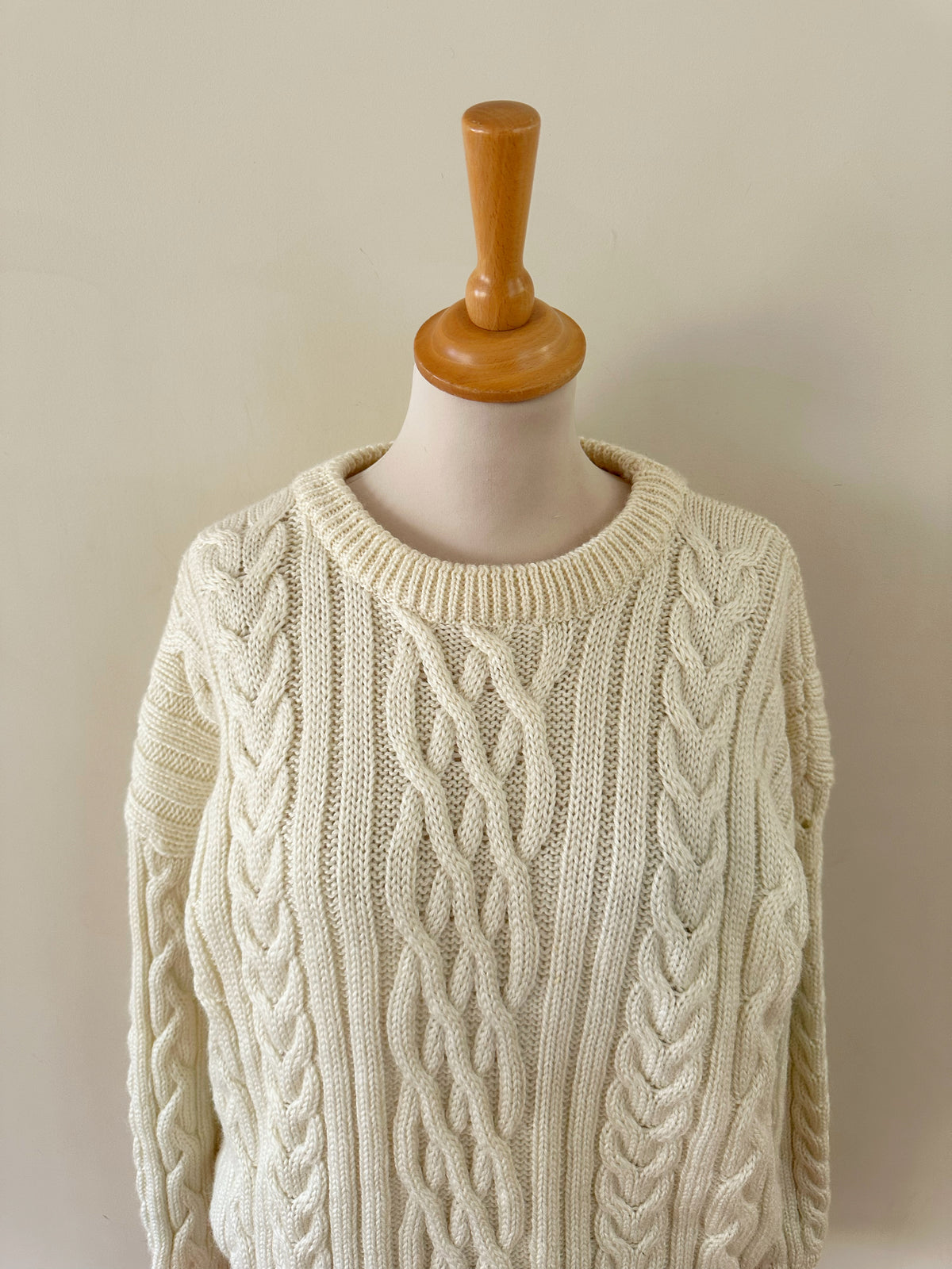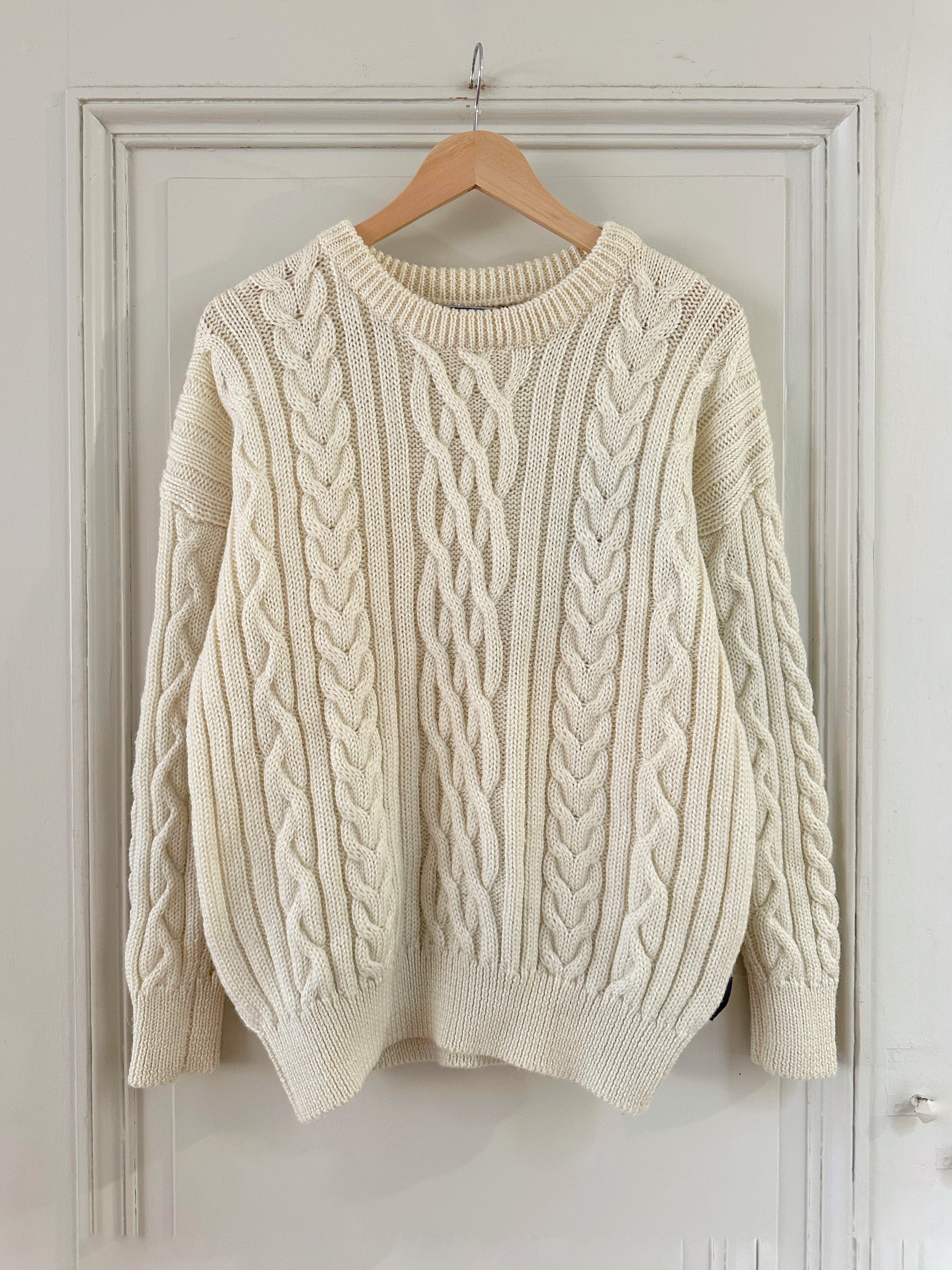 Prix unitaire parPull Irlandais en pure laine anglaise blanc écru, maille torsadée, fabriqué en Angleterre. Convient aux tailles 38 et 40 porté ici sur un mannequin T36 et sur une personne T40. Aisselles 50cm Longueur 65cm.