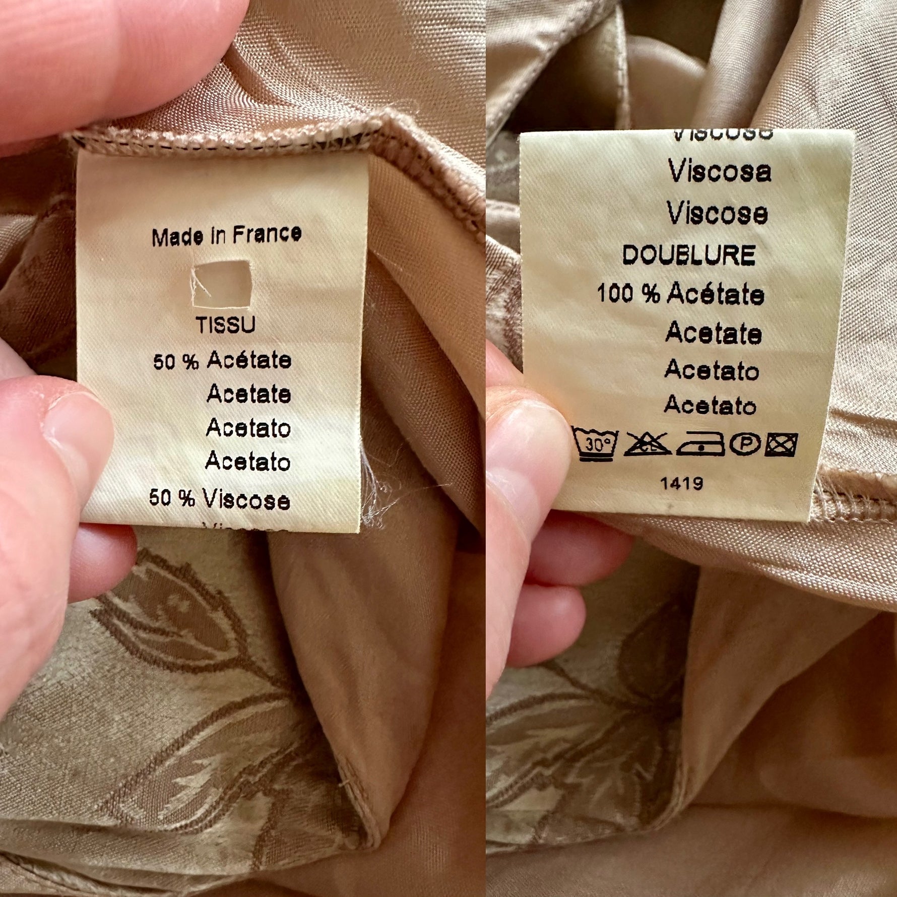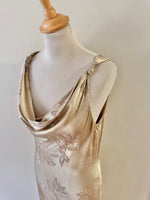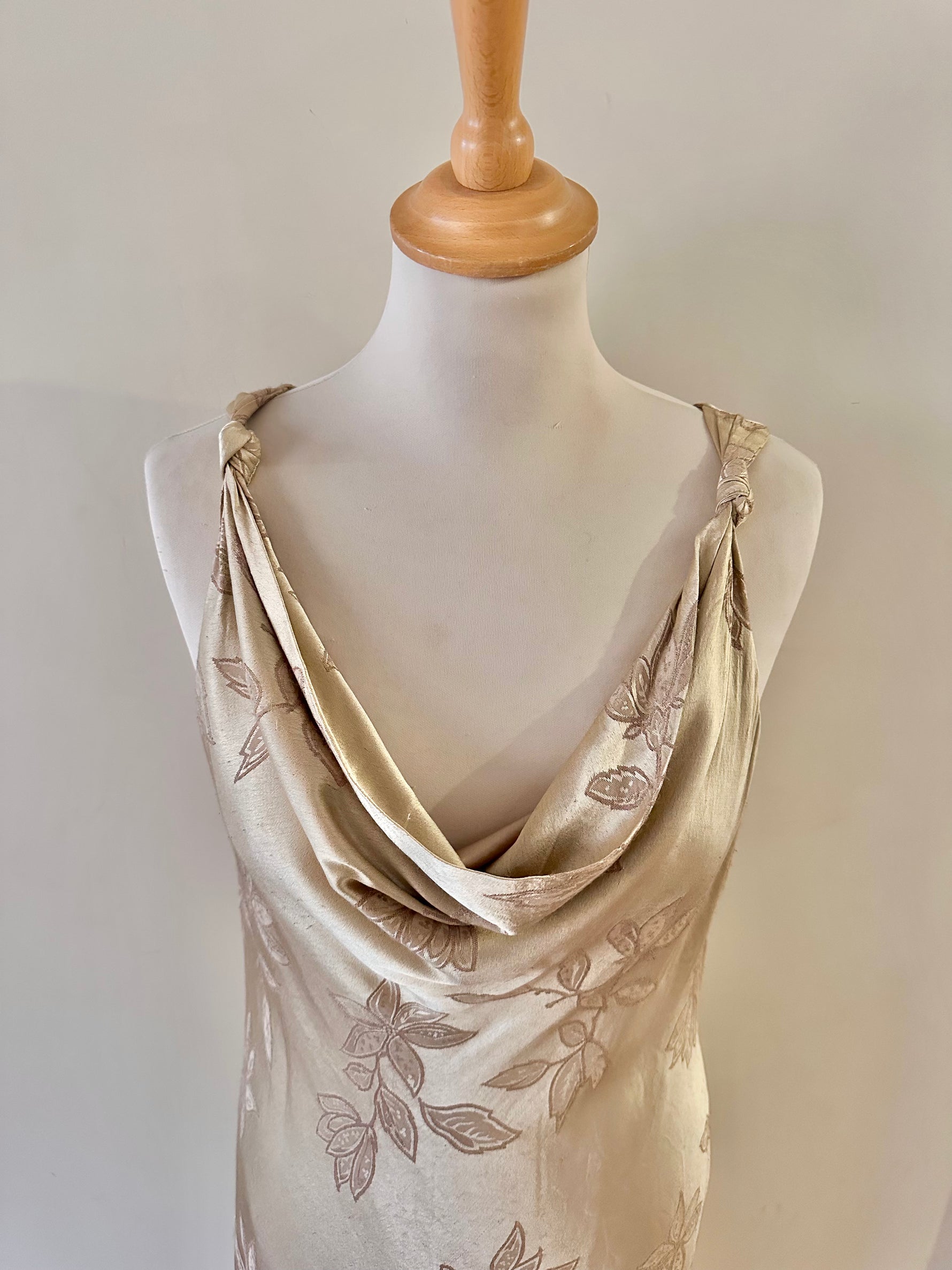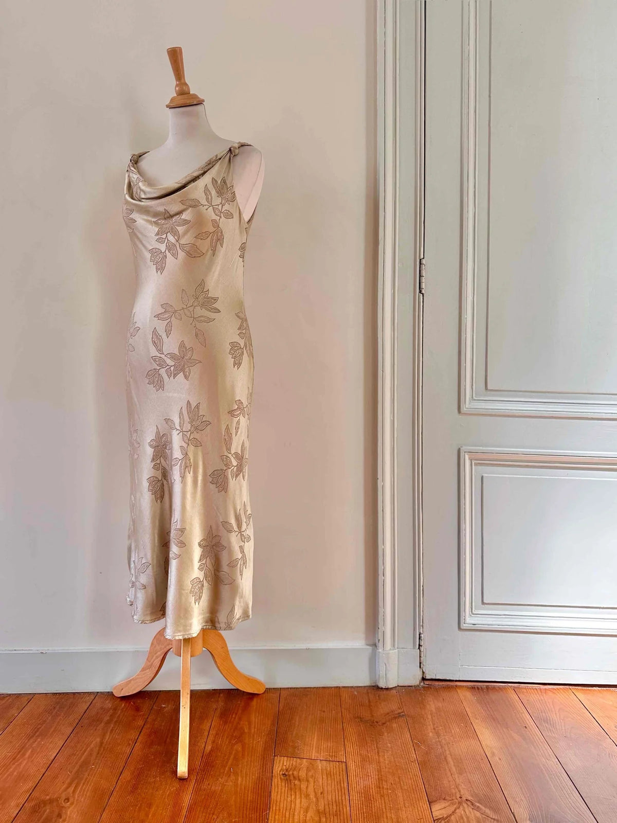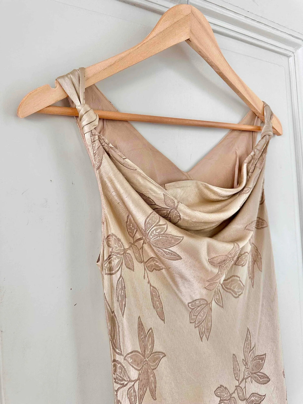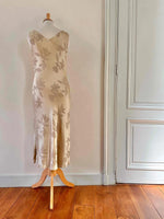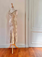 Robe midi damassée à fleurs, en satin beige doré jacquard fleuri, encolure benitier drappée, épaules nouée, forme fit and flare en biais, fabriquée en France, convient aux tailles 36 et 38 portée ici sur un mannequin T36. Aisselles 45cm Longueur 118cm.