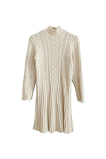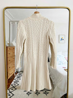 Robe en laine écrue, torsadée, jupe légèrement évasée, manches longues, col montant, portée ici sur une T36 pour 1m64