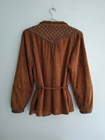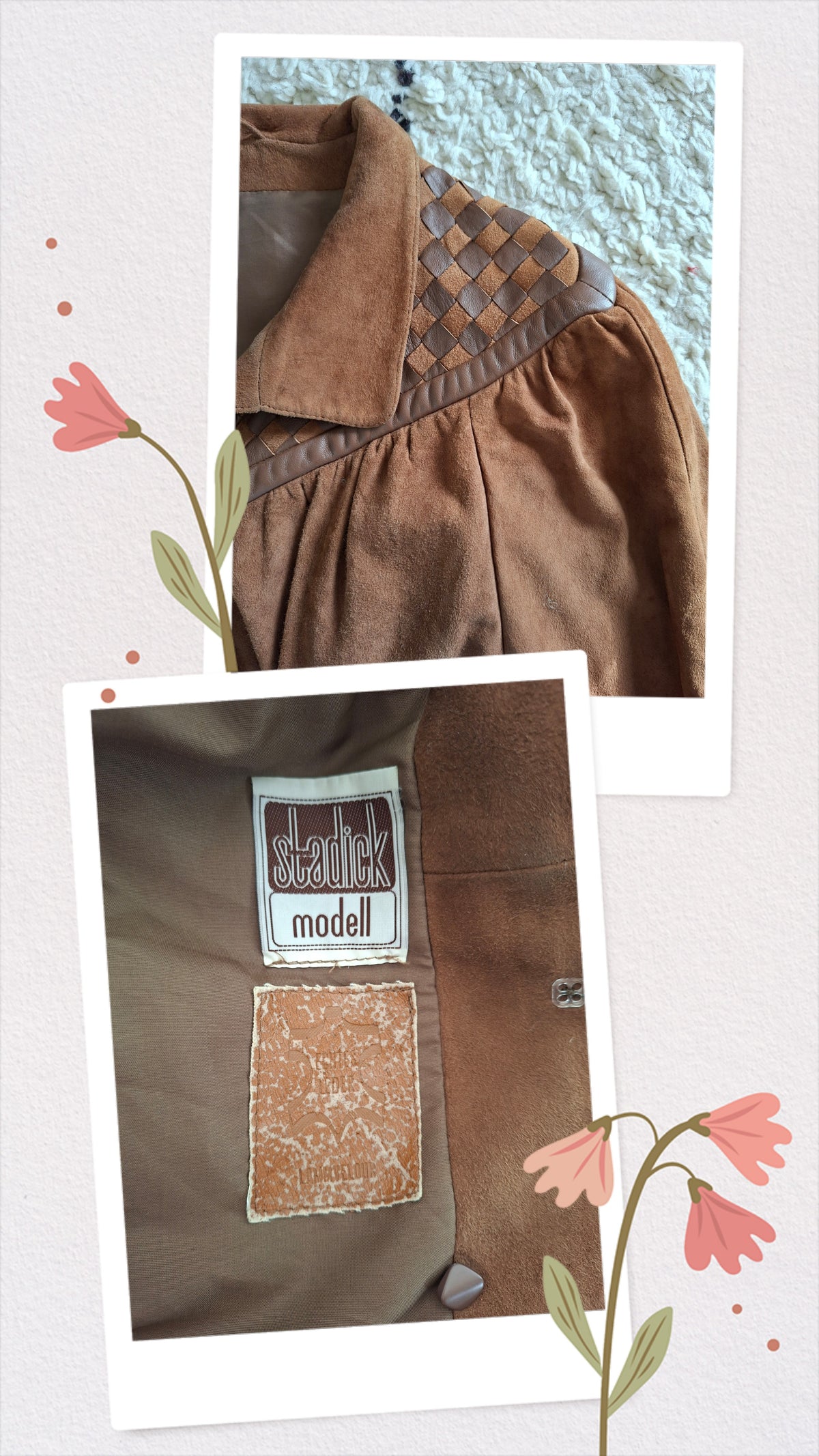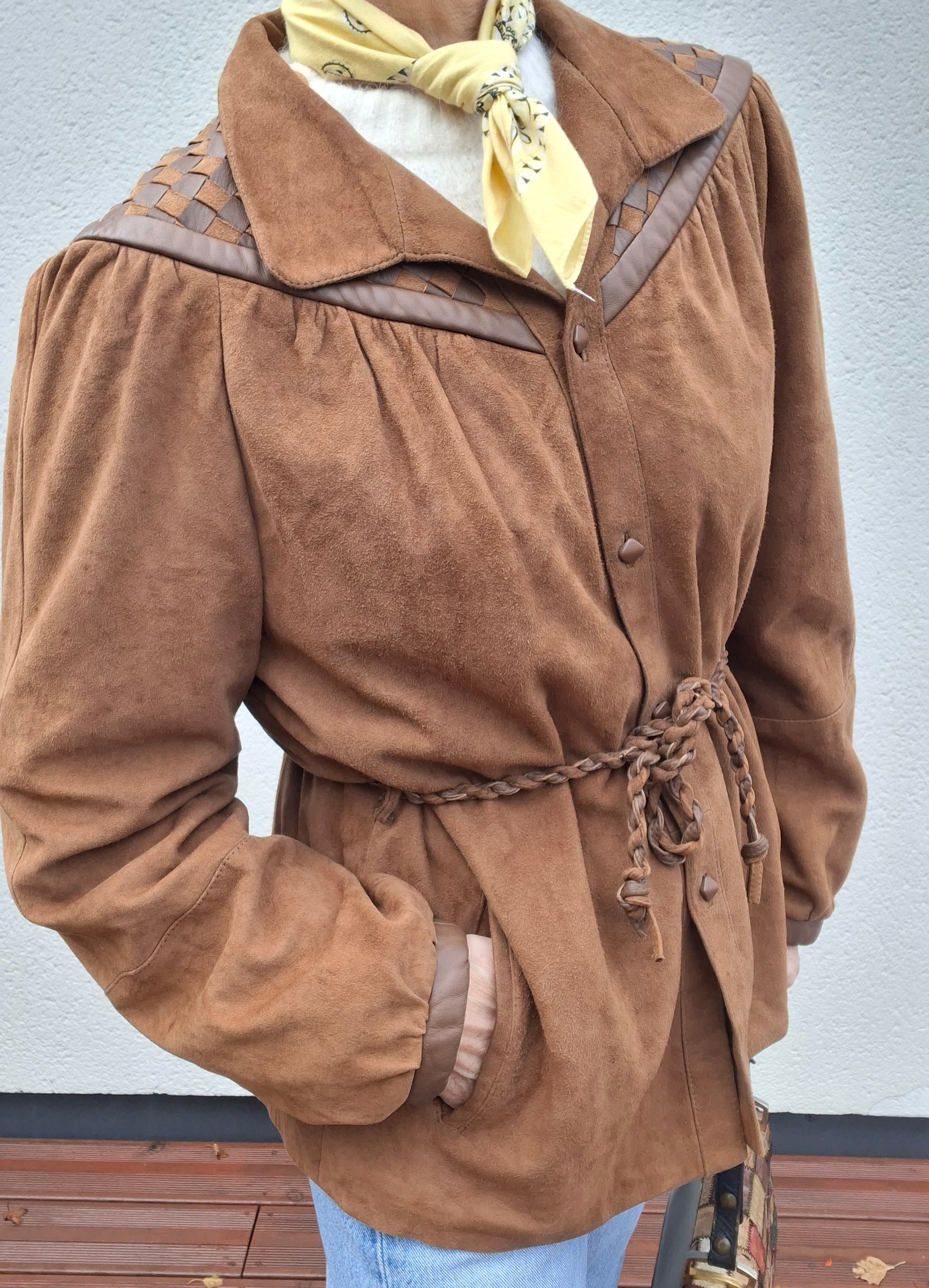 Saharienne en daim et cuir tressé vintage 80's. Carrure tressé avec emmanchures et fronces. Manches ballons avec cuir sur les poignets. 2 poches. Doublée. Fermeture boutonnée et ceinture assortie à nouer devant. Épaules 45cm.Longueur 70cm. Taille 40