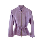 Saharienne en cuir d’agneau lilas, col montant, forme légèrement ceintrée à ceinturer par un cordon en cuir, fabriquée en Italie, taille 36 portée ici sur un mannequin T36 et ouverte sur une personne T40.