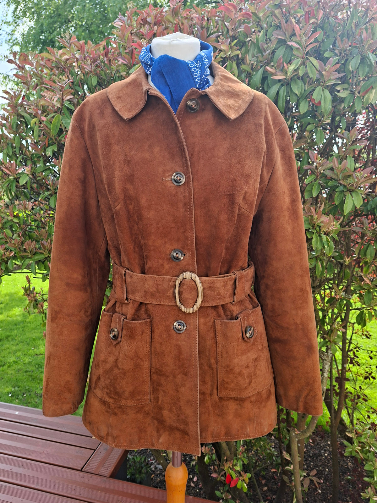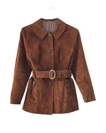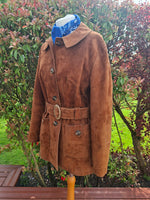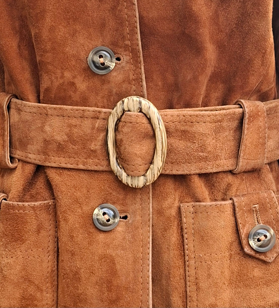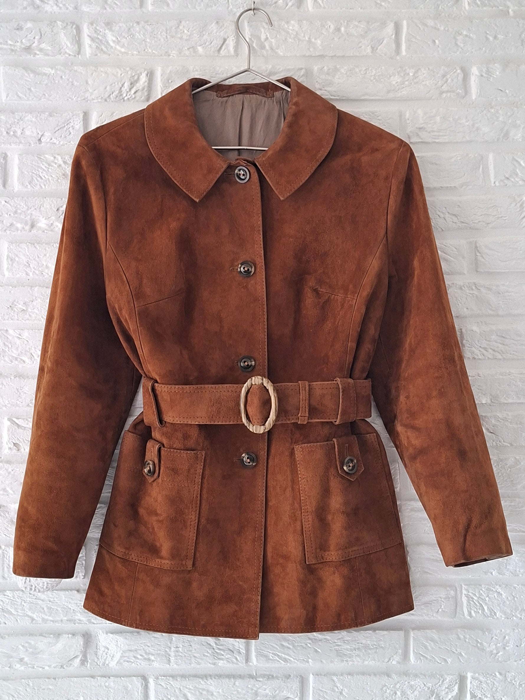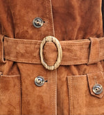 Prix unitaire parSaharienne en daim couleur caramel des années 70 2 poches plaquées et boutonnées Ceinture assortie avec une jolie boucle ovale striée Doublée Portée par Patricia et le mannequin qui font une taille 40 Les mesures à plat Epaules 44 cm Aisselles 50 cm Longueur 72 cm (pat17)