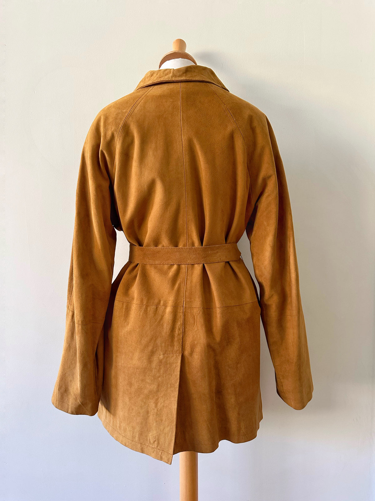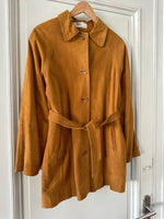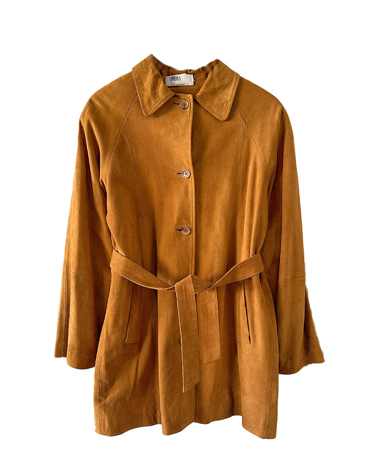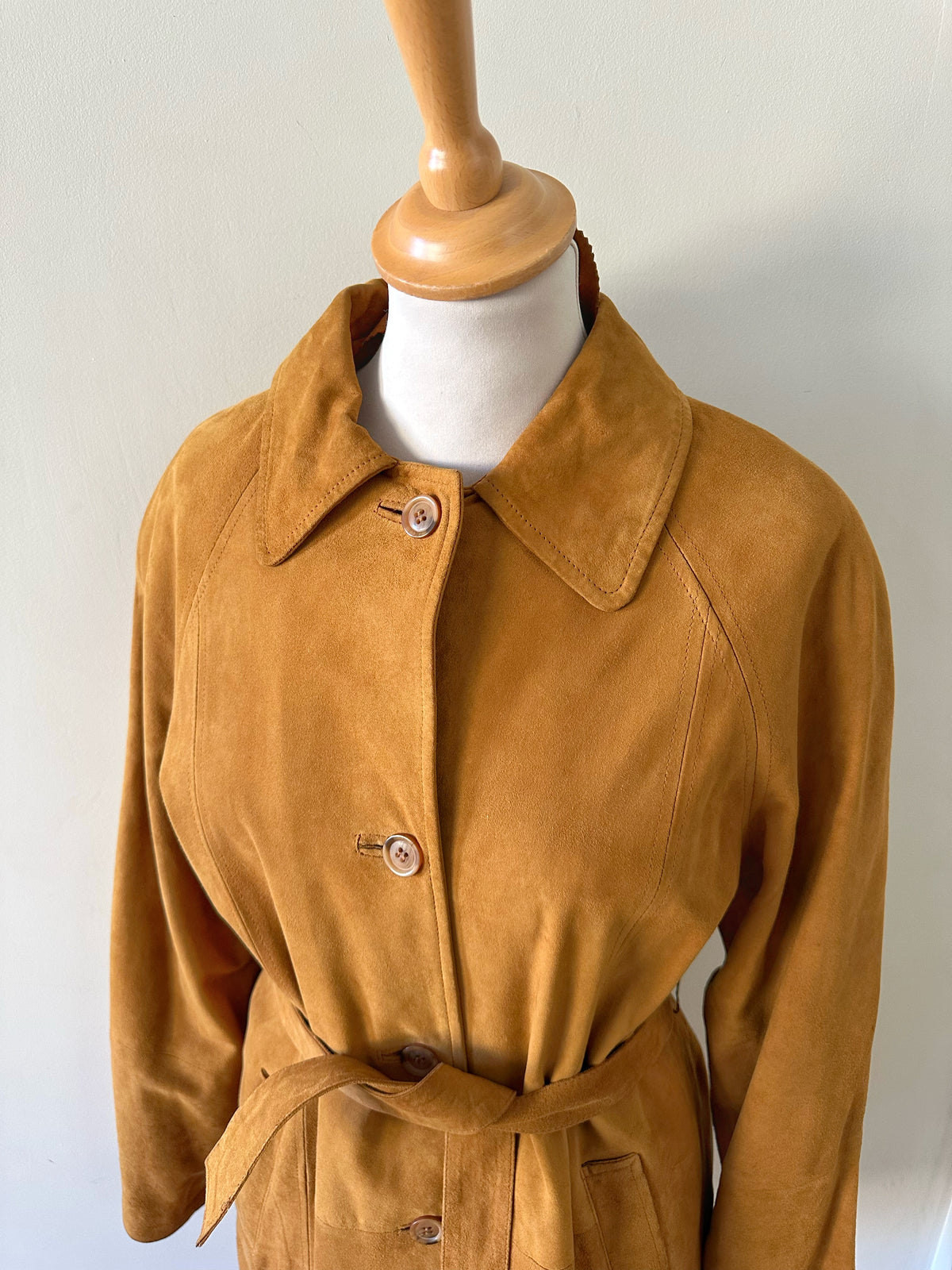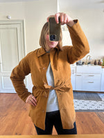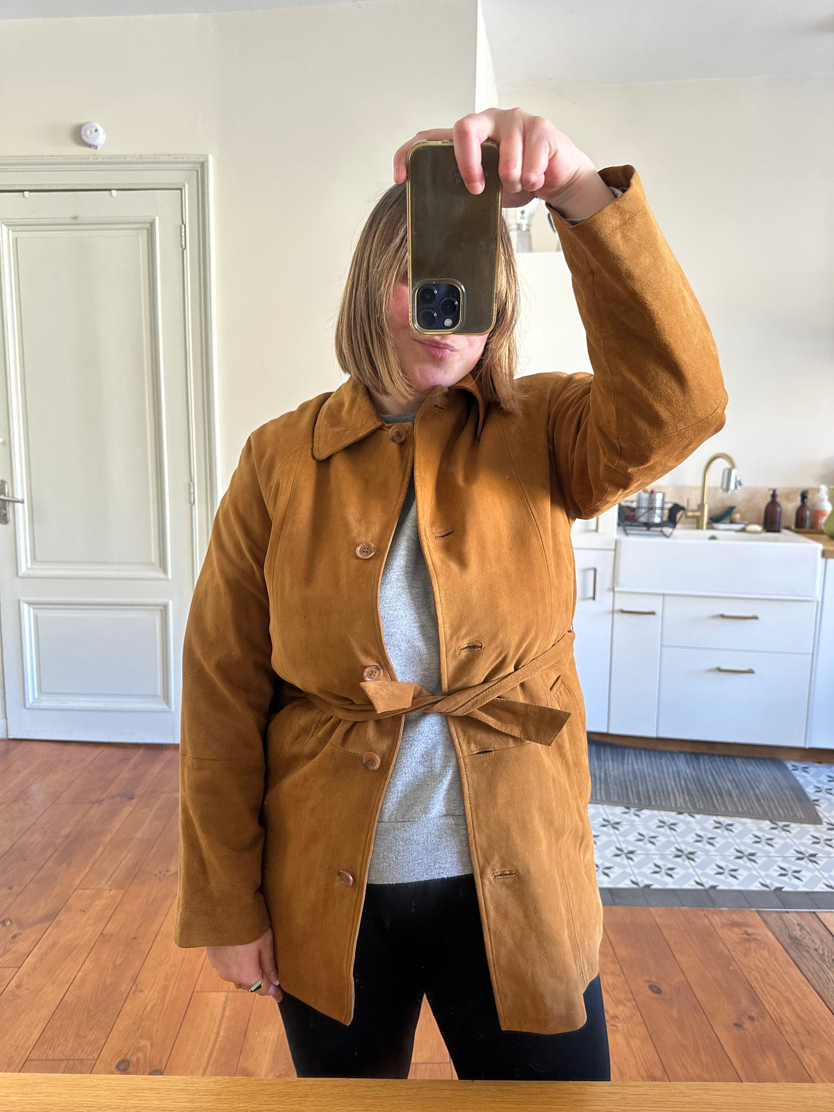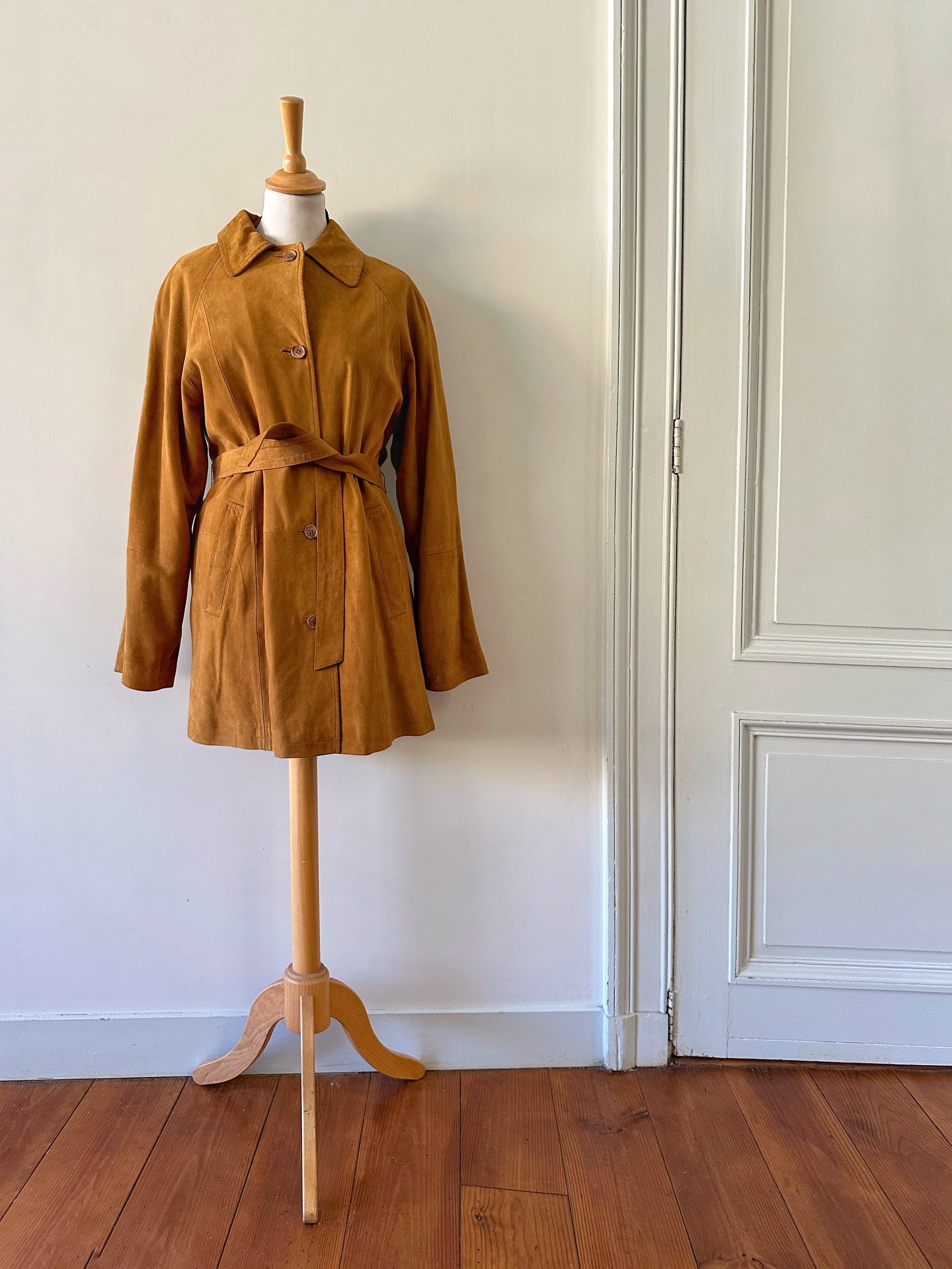 Saharienne en daim chèvre velours caramel, ceinture taille à nouer, boutonnée, fabriqué en Italie. Taille 36 porté ici sur un mannequin T36 et ouverte sur une personne T40. Aisselles 46cm Longueur 78cm