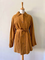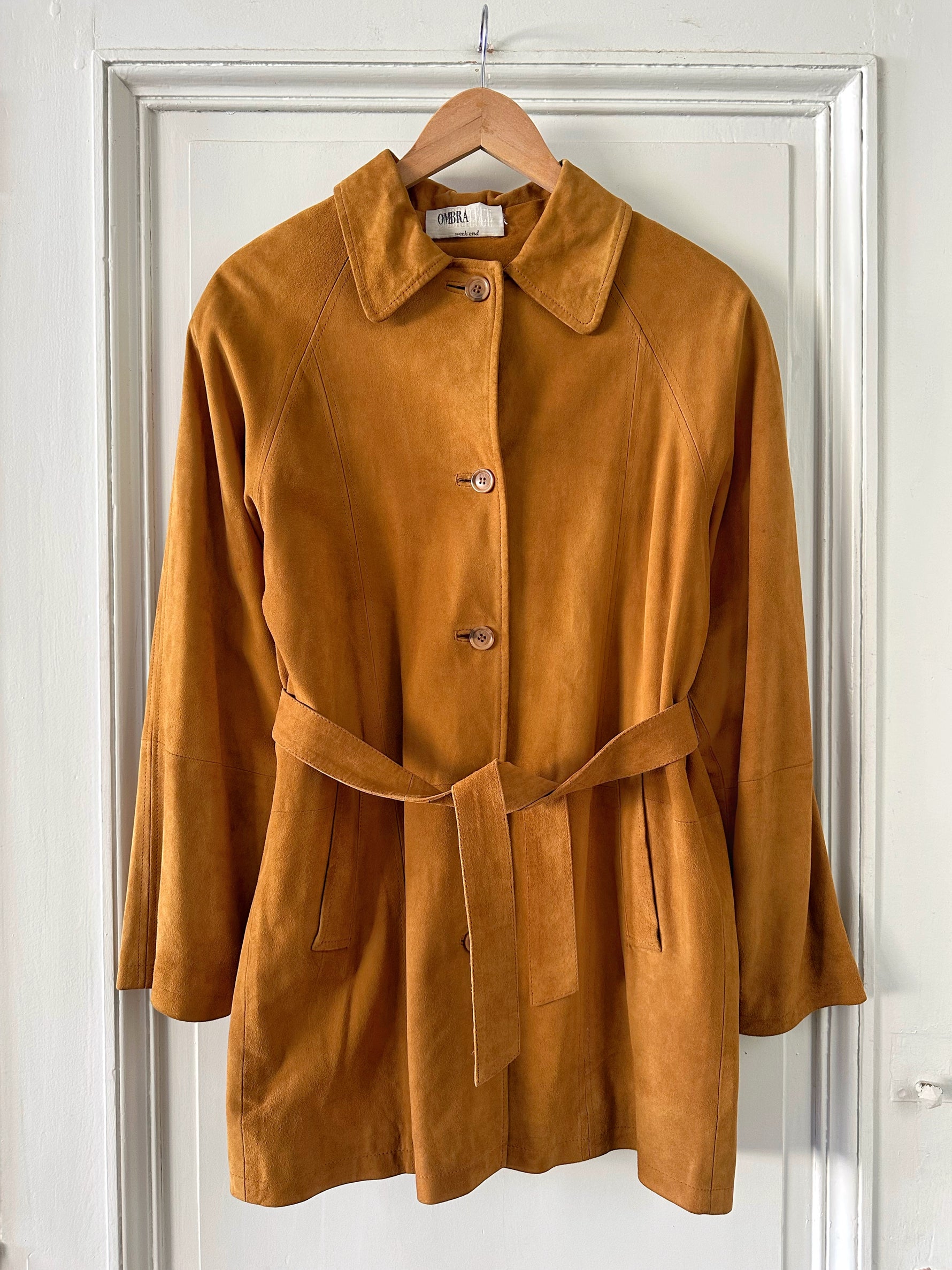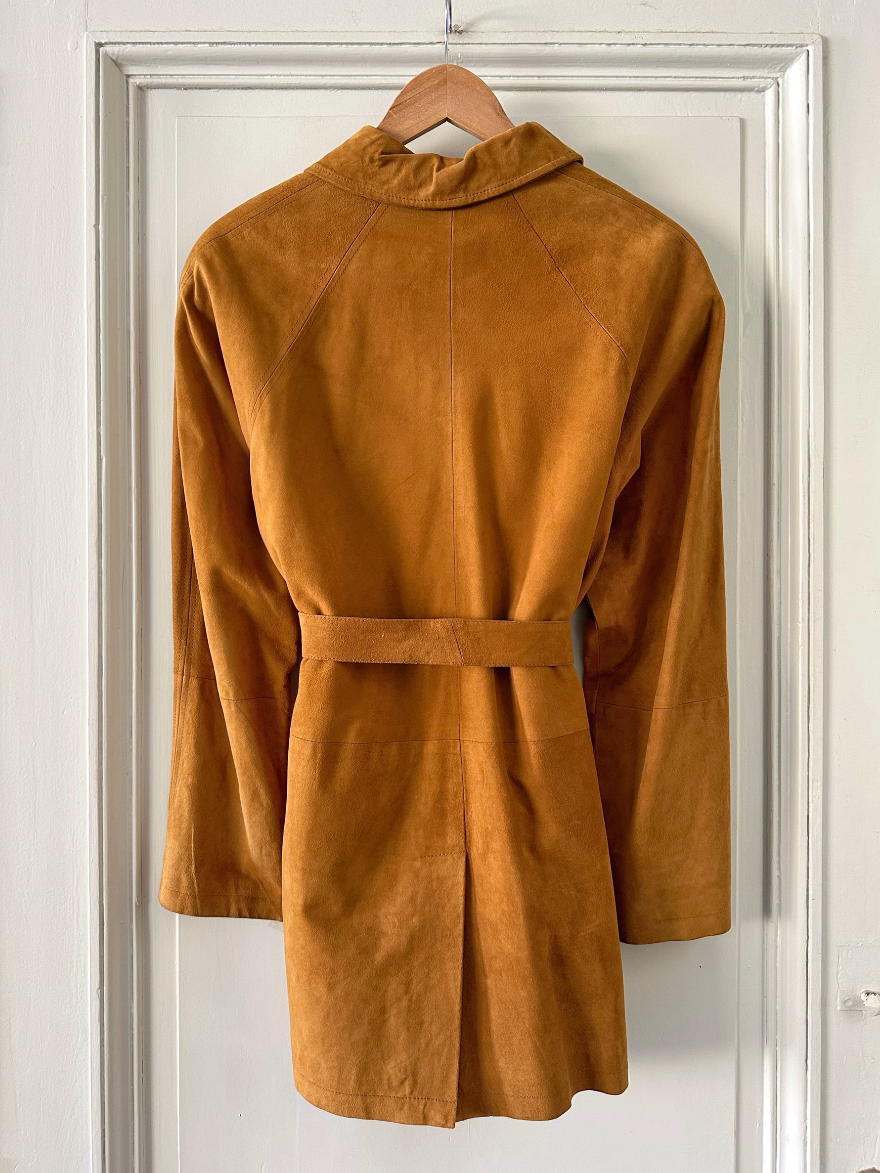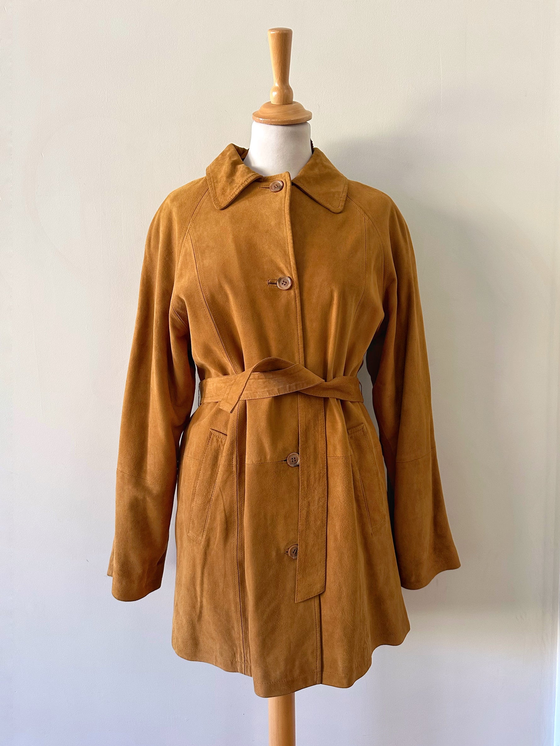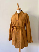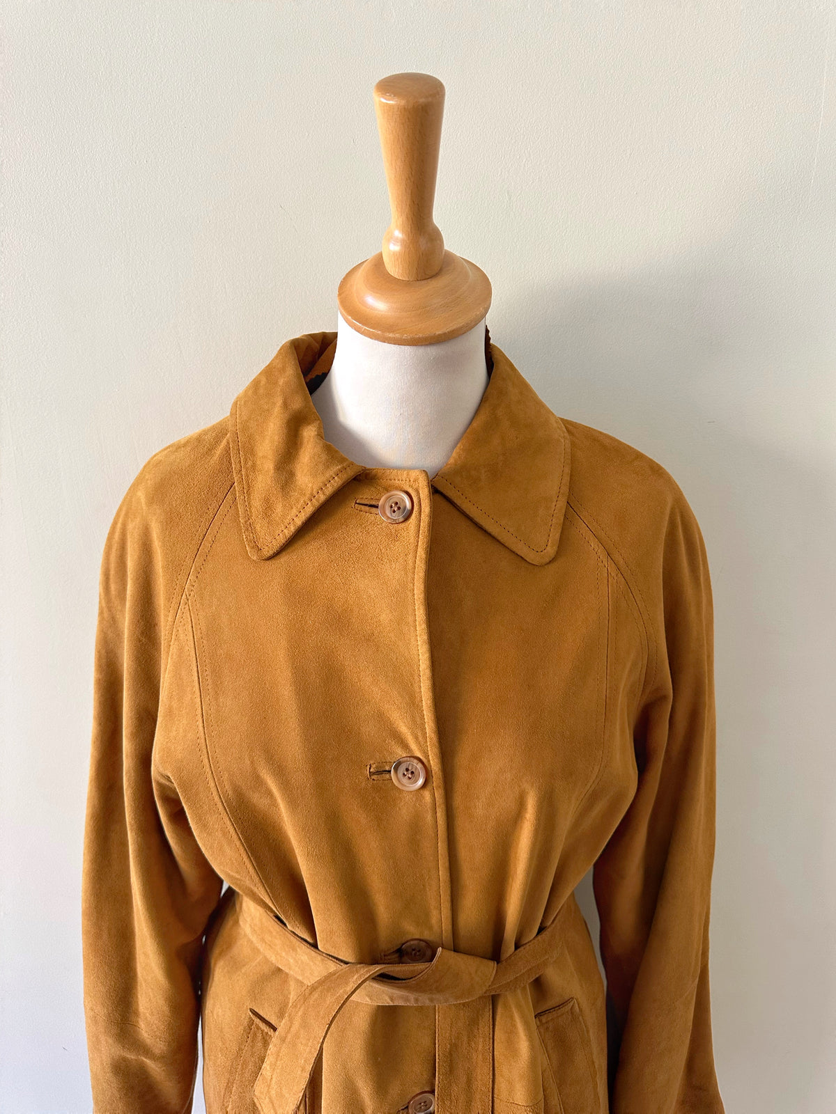 Saharienne en daim chèvre velours caramel, ceinture taille à nouer, boutonnée, fabriqué en Italie. Taille 36 porté ici sur un mannequin T36 et ouverte sur une personne T40. Aisselles 46cm Longueur 78cm