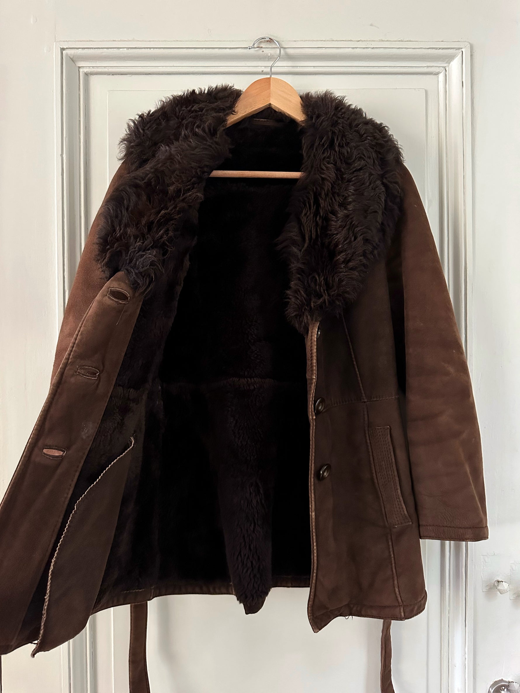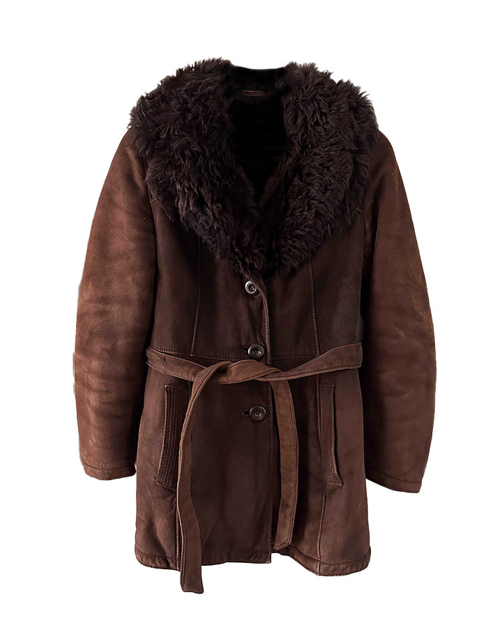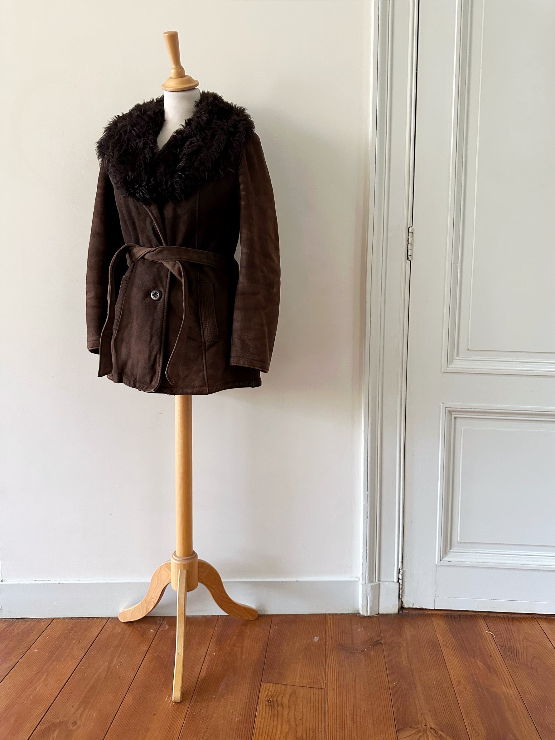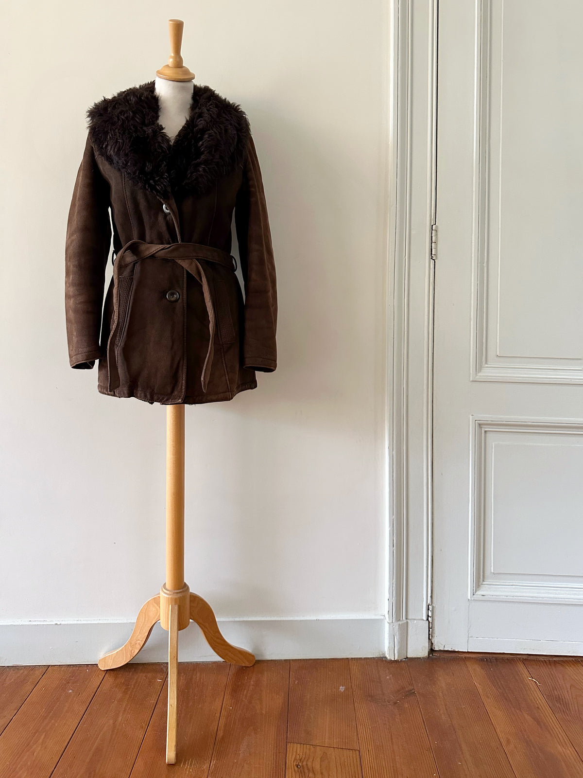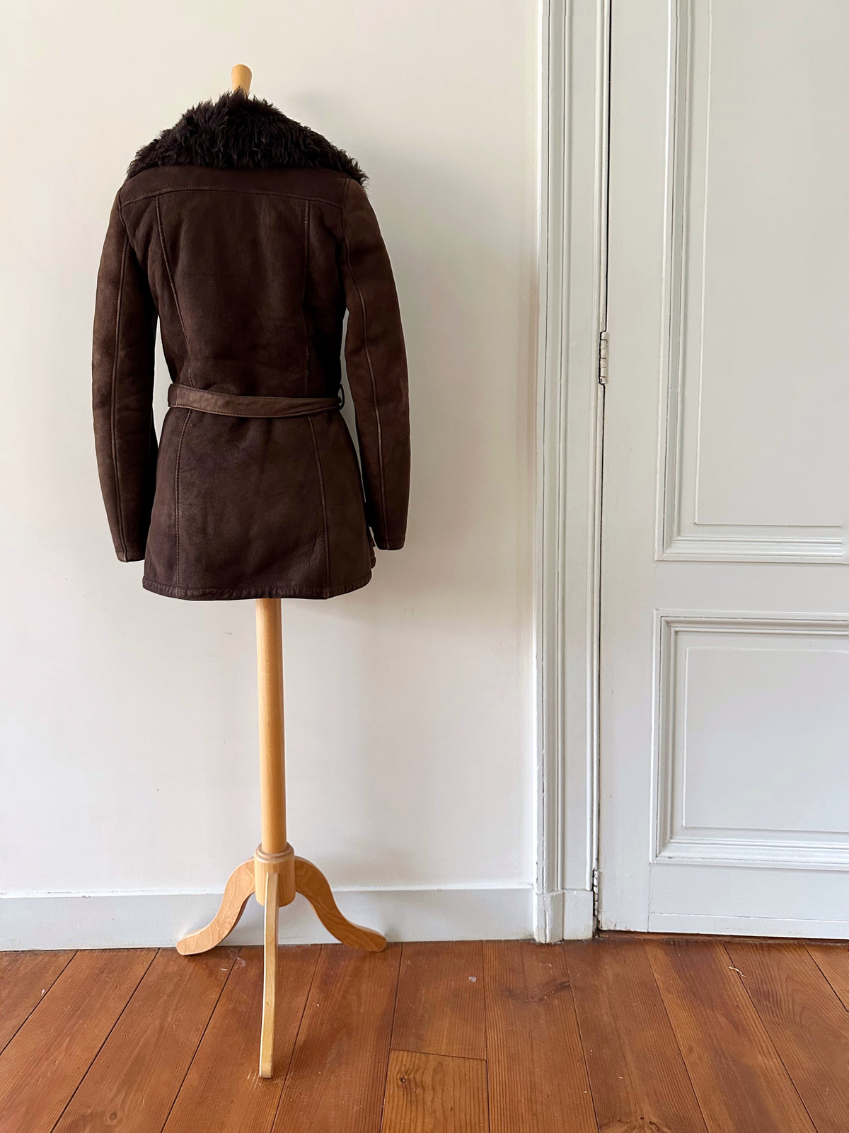 Prix unitaire parSaharienne en peau lainée, mouton retourné exterieur daim chocolat, interieur laine de mouton chocolat, col fourrure de mouton choco, ceinture taille à nouer, années 70s.Taille 34 et 36 portée ici sur un mannequin T36. Aisselles 45cm Longueur 72cm.