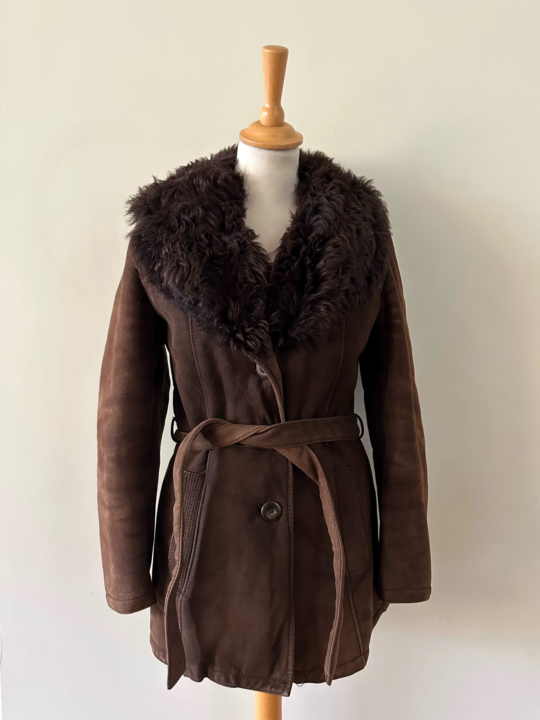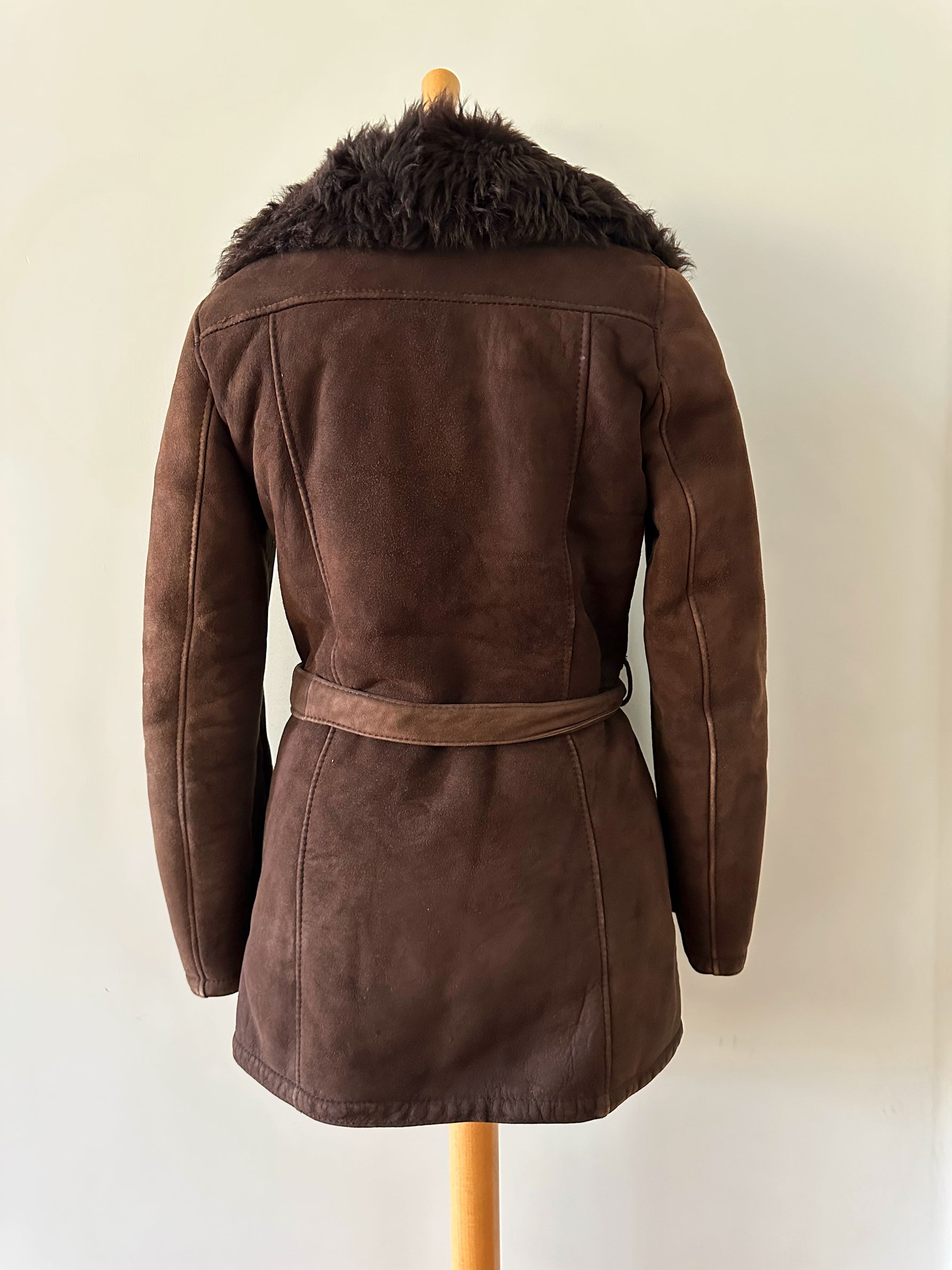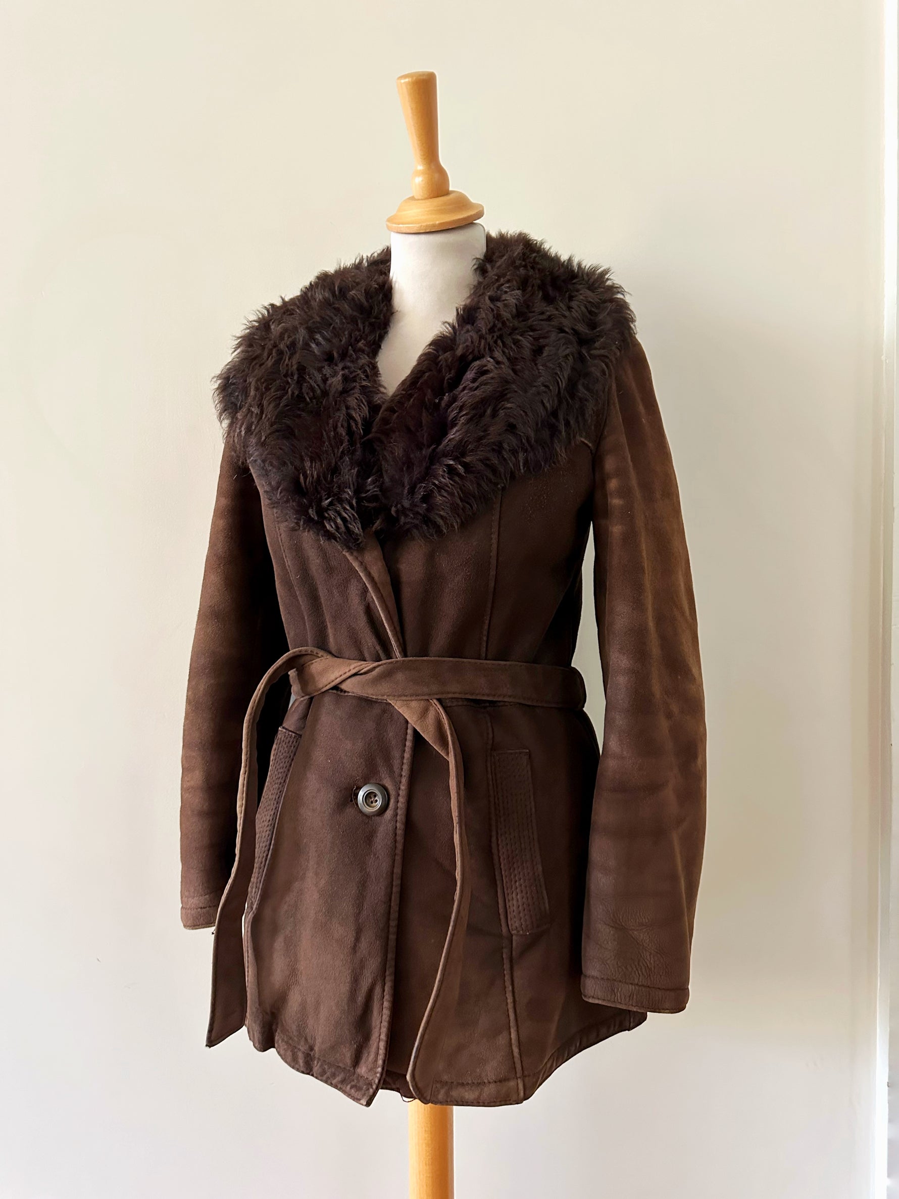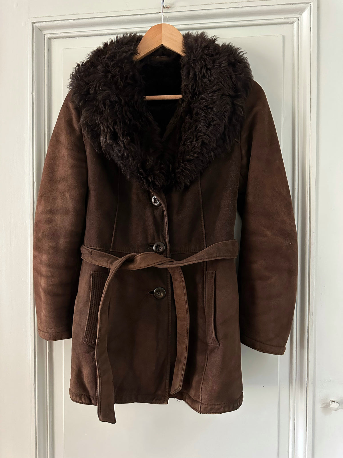 Prix unitaire parSaharienne en peau lainée, mouton retourné exterieur daim chocolat, interieur laine de mouton chocolat, col fourrure de mouton choco, ceinture taille à nouer, années 70s.Taille 34 et 36 portée ici sur un mannequin T36. Aisselles 45cm Longueur 72cm.