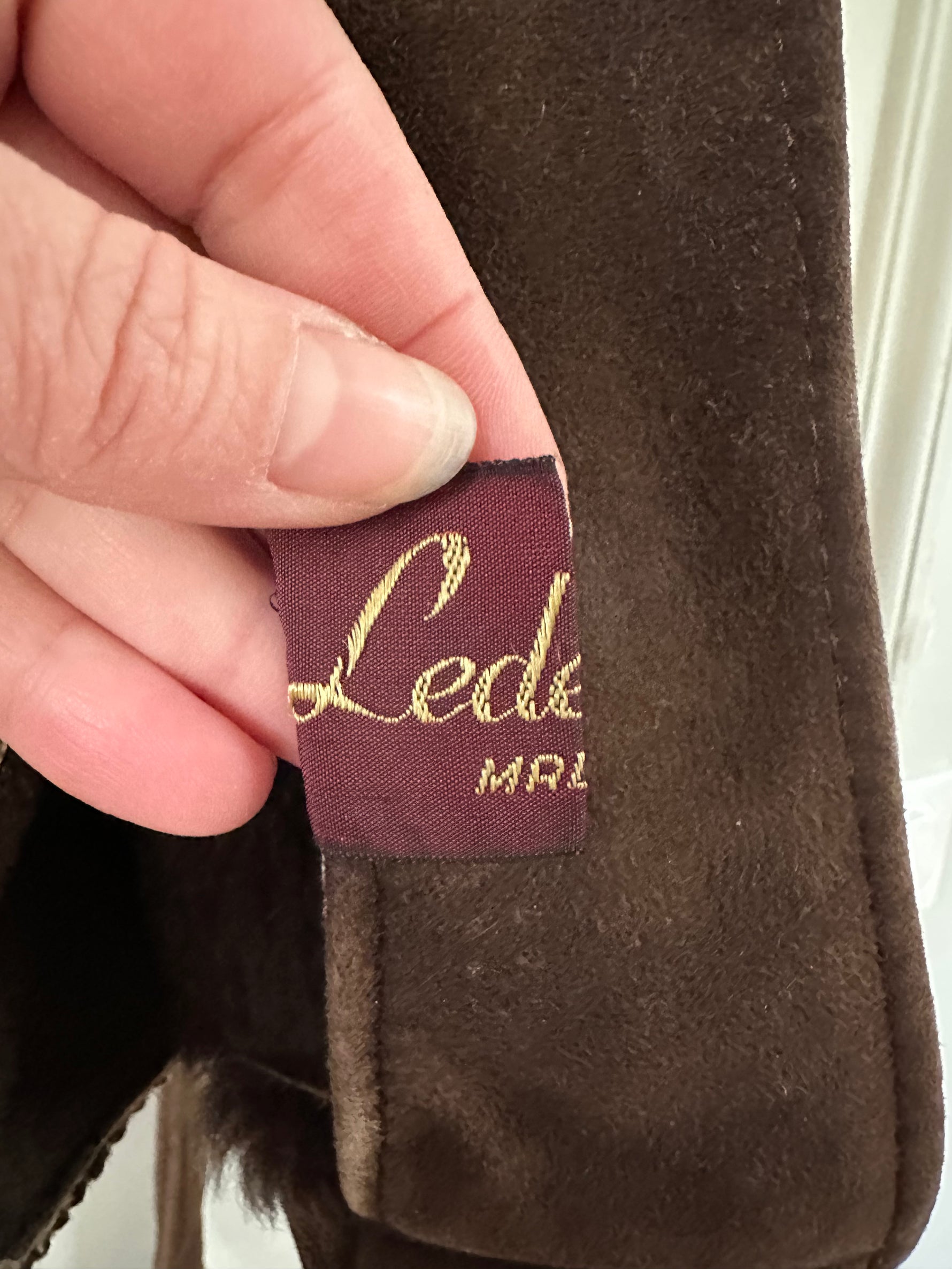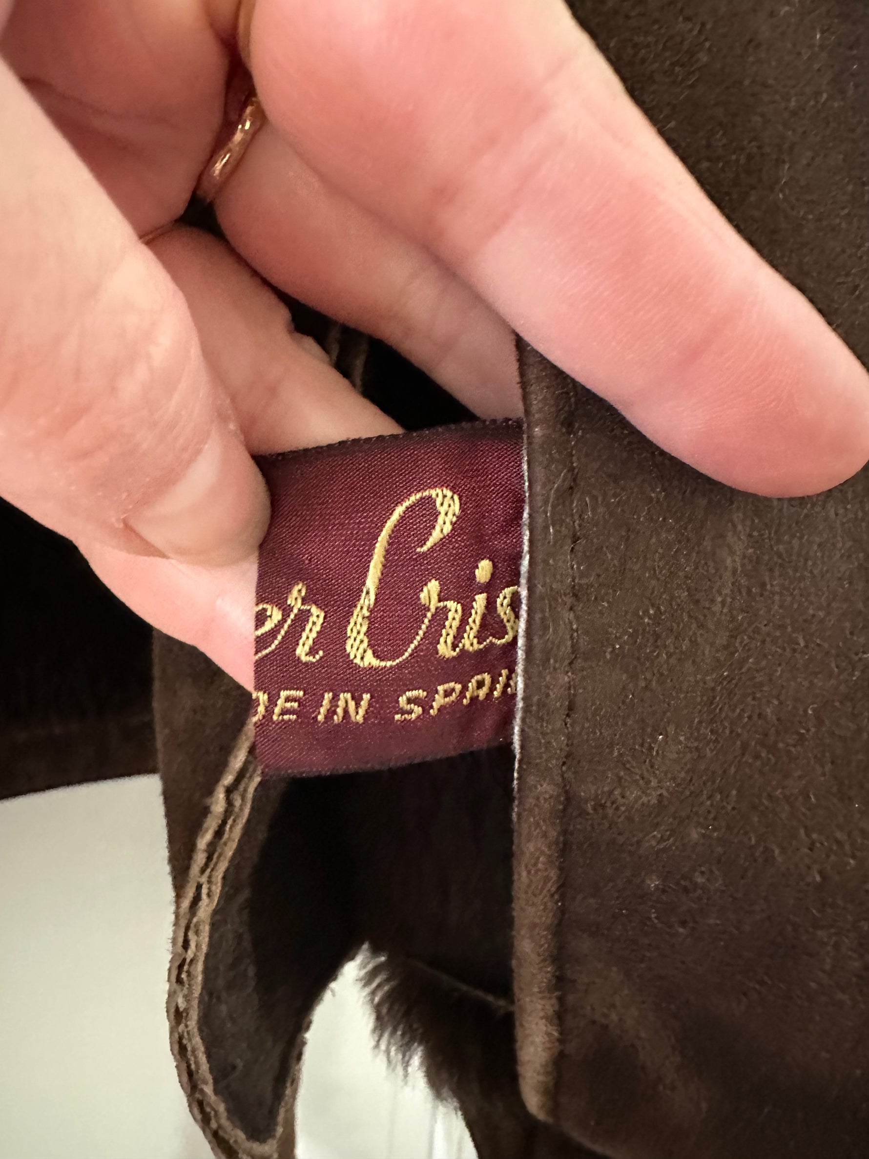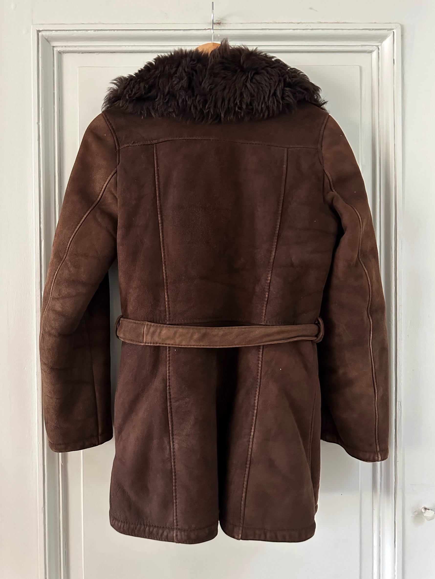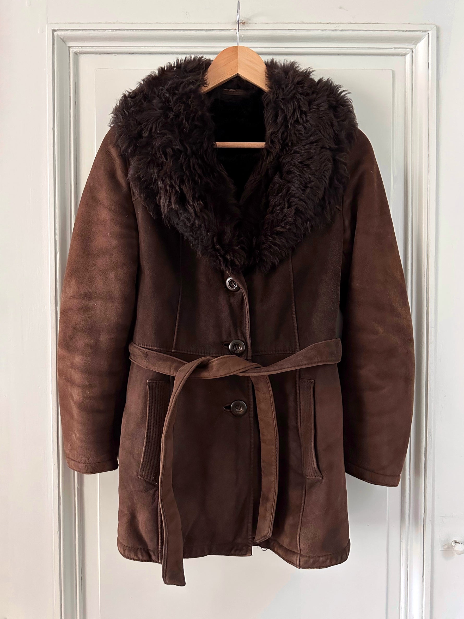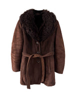 Prix unitaire parSaharienne en peau lainée, mouton retourné exterieur daim chocolat, interieur laine de mouton chocolat, col fourrure de mouton choco, ceinture taille à nouer, années 70s.Taille 34 et 36 portée ici sur un mannequin T36. Aisselles 45cm Longueur 72cm.