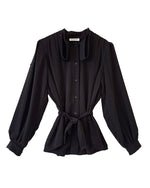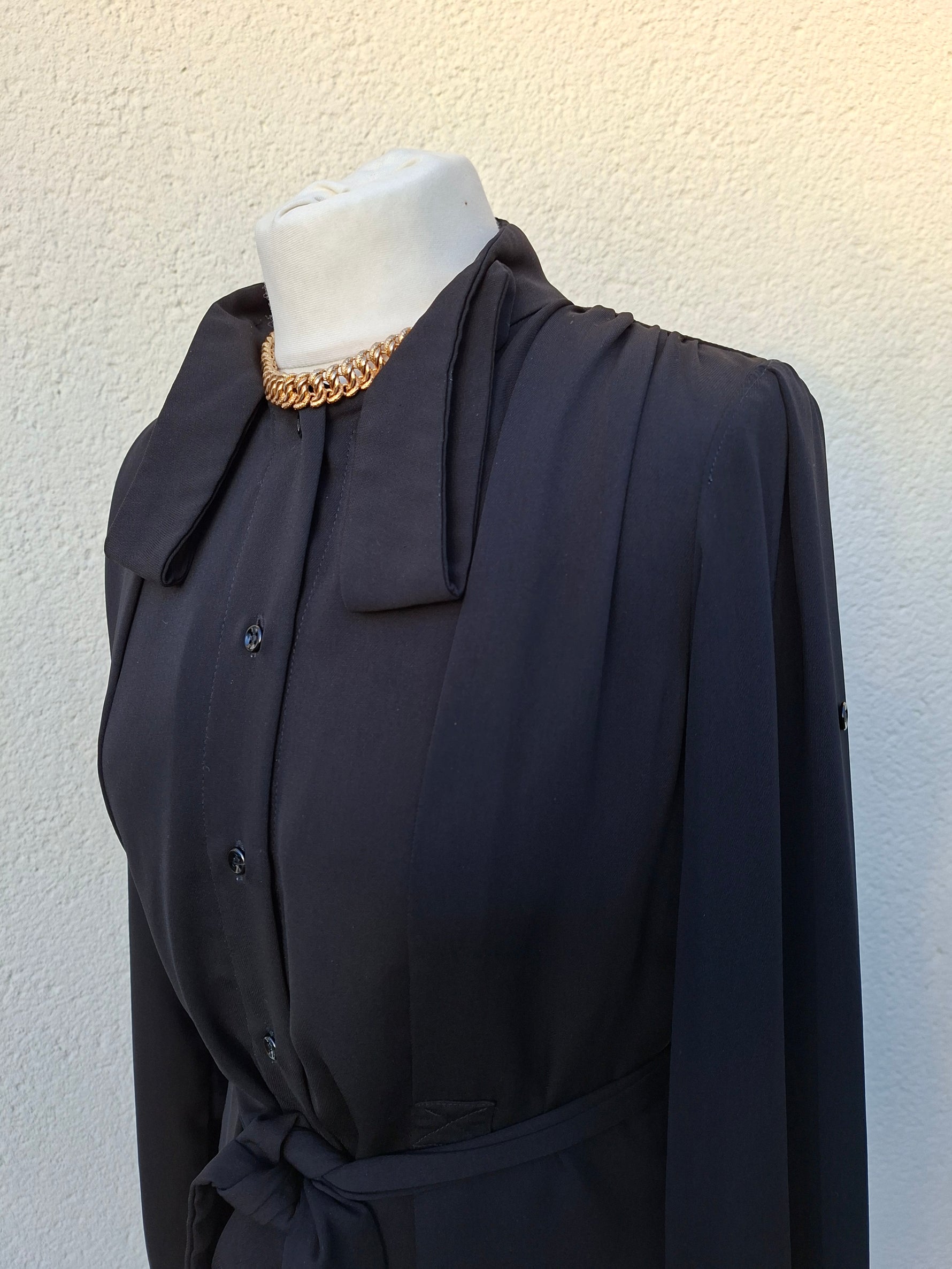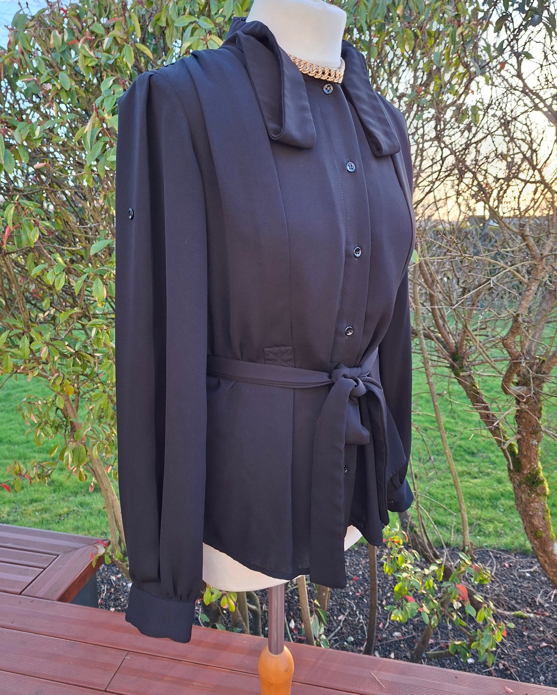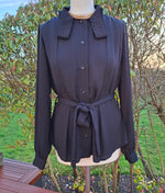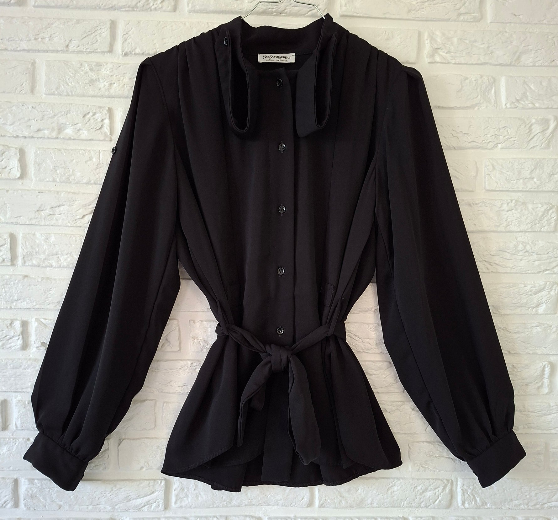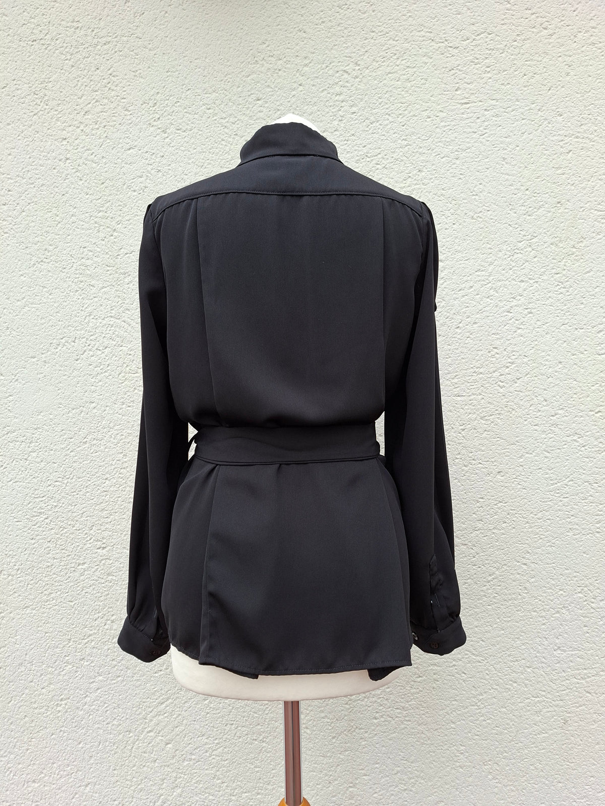Prix unitaire parSaharienne Yves Saint Laurent Made in Italy. Fronces sur les épaules avec pattes fantaisie boutonnées. Manches bouffantes. Ceinture assortie à nouer devant. Les mesures à plat : Épaules 37cm Aisselles 50cm Longueur 62cm. Portée par Patricia et le mannequin qui font une taille 40.(PAT9)