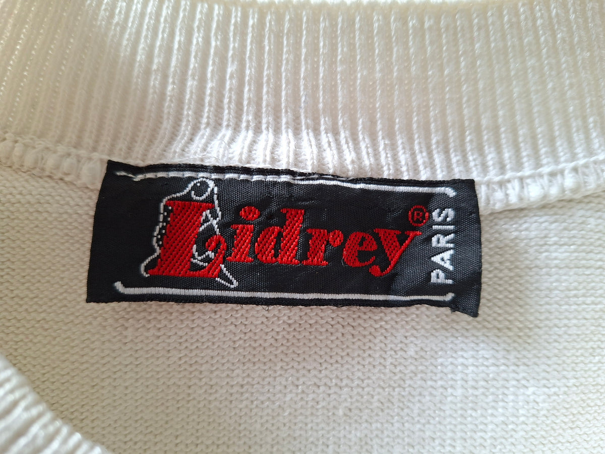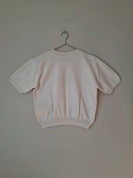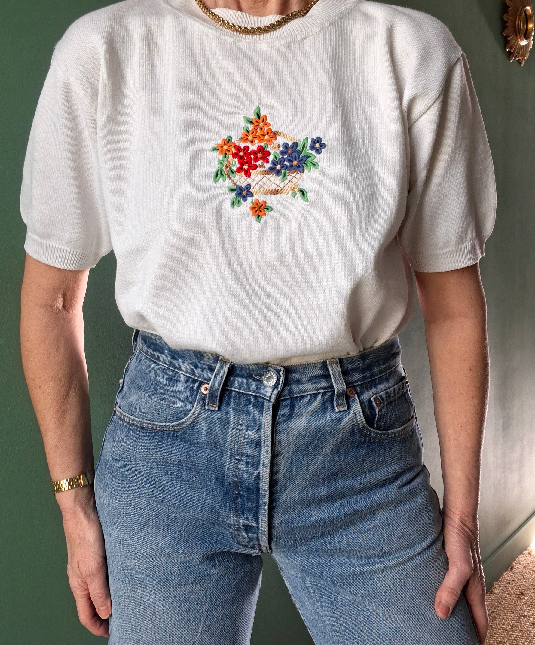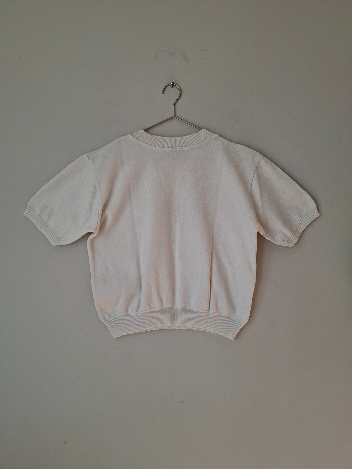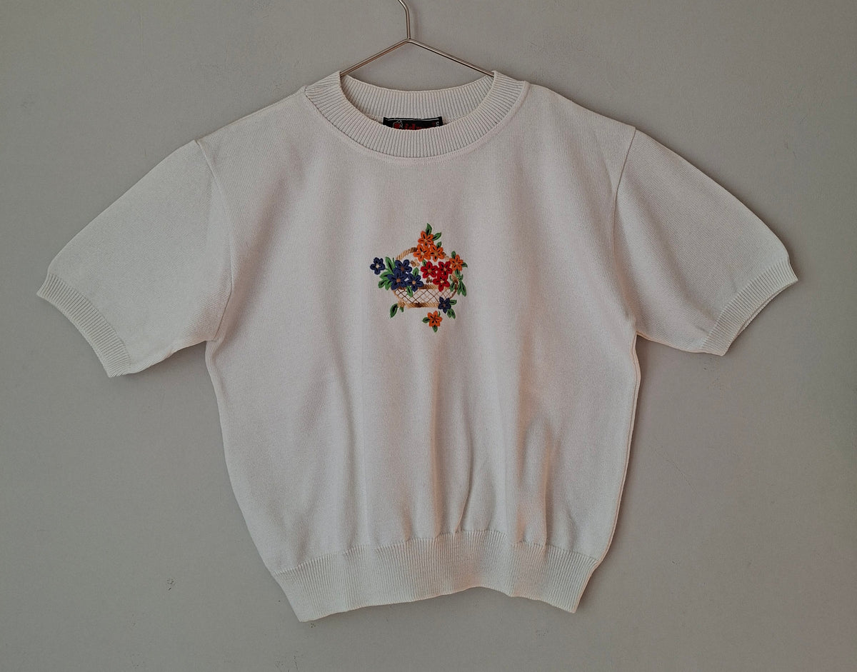 Prix unitaire parTop brodé à manches courtes Made in France. Ras de cou.Forme ample et courte. En coton et acrylique blanc. Porté par Patricia qui fait une taille 40 Les mesures à plat Épaules 47cm Aisselles 52cm Longueur 52cm