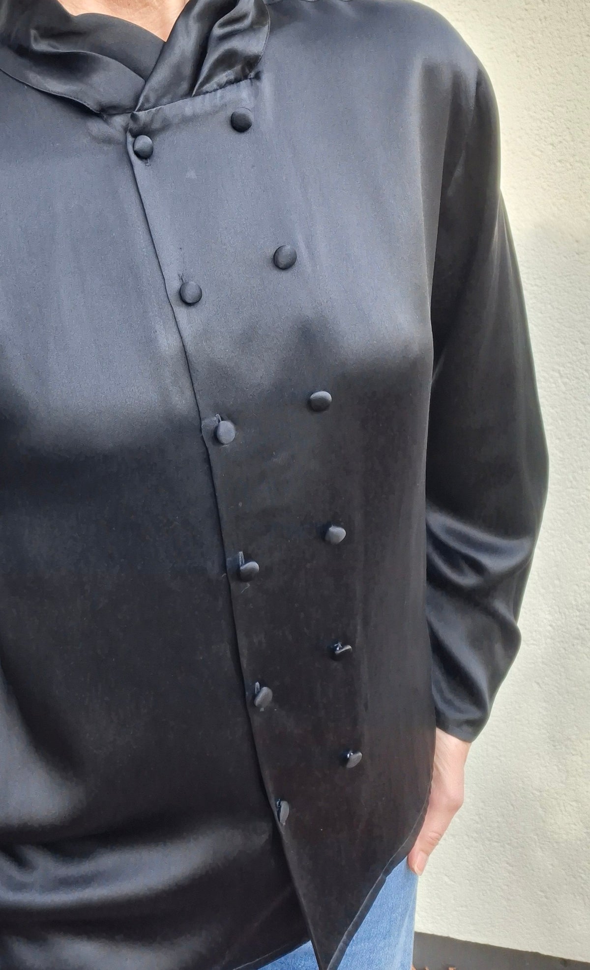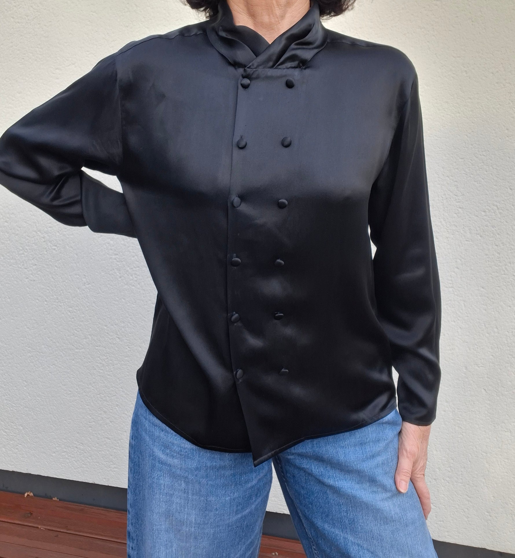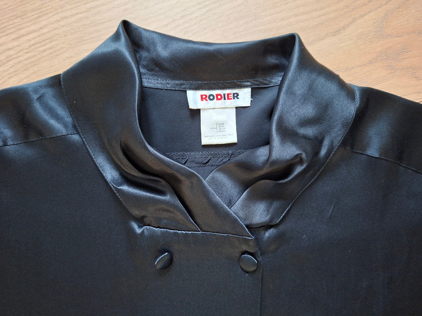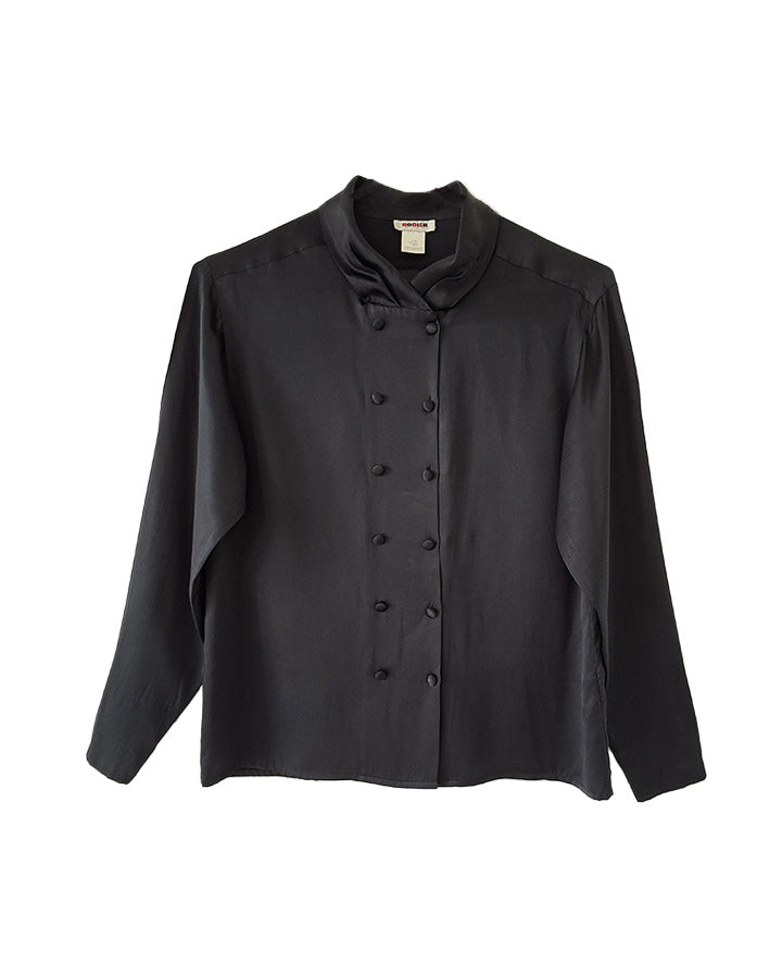 Top en soie noir Rodier.Double Boutonnage Finition fantaisie sur les poignets. Col drapée Épaules 44cm.Poitrine 50 cm.Longueur 56 cm.Taille38/40