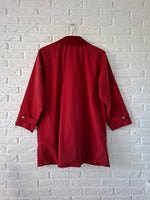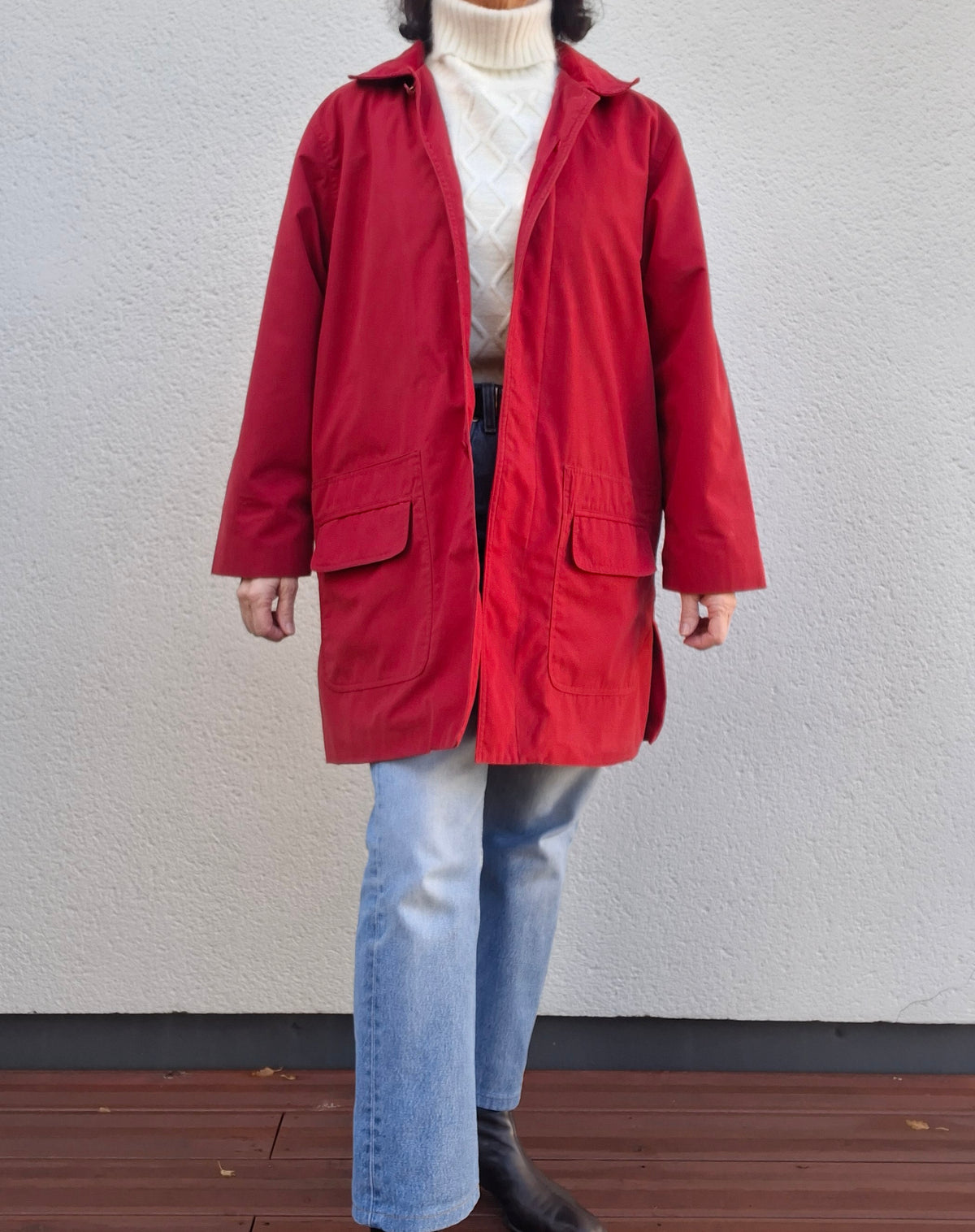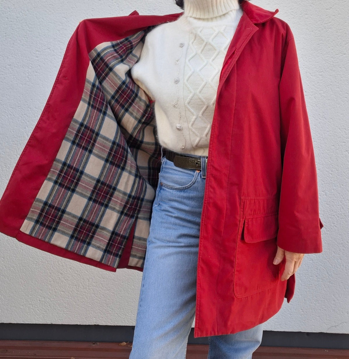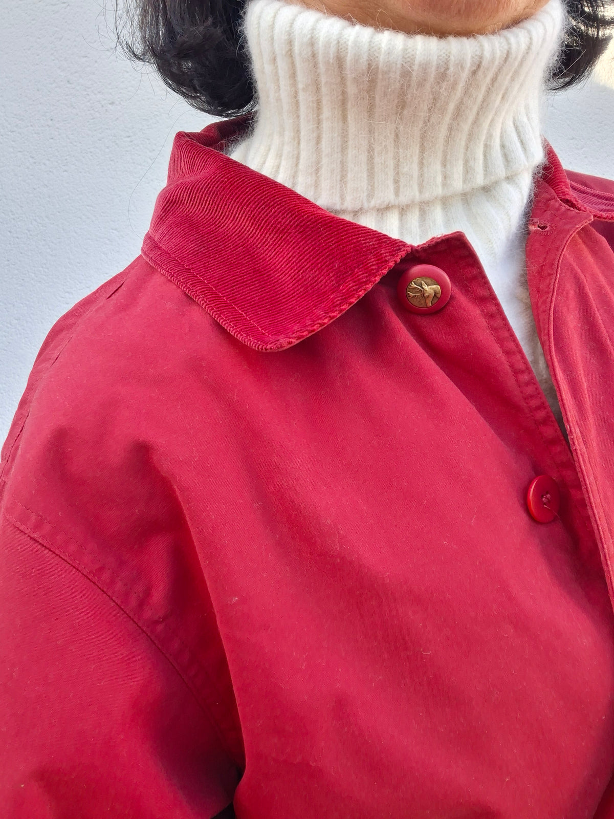 Trench col velours style Barbour. En toile de coton rouge.Col en velours côtelé. Doublure tartan en laine mélangée. 2 poches plaquées à rabats devant. Fentes sur les côtés. Fermeture avec boutons sous patte. Épaules 44cm.Poitrine 57cm.Longueur 84cm. Taille 40