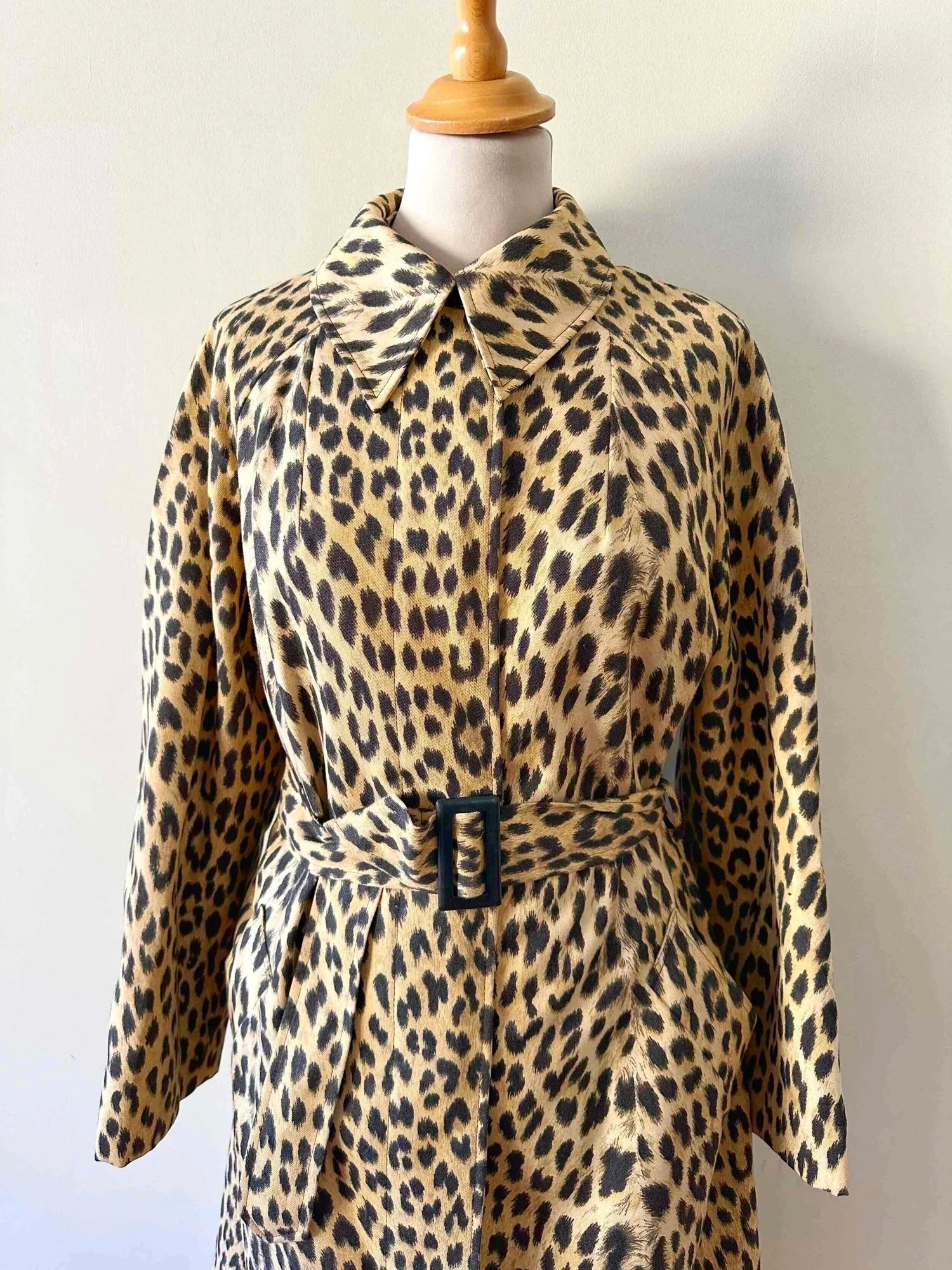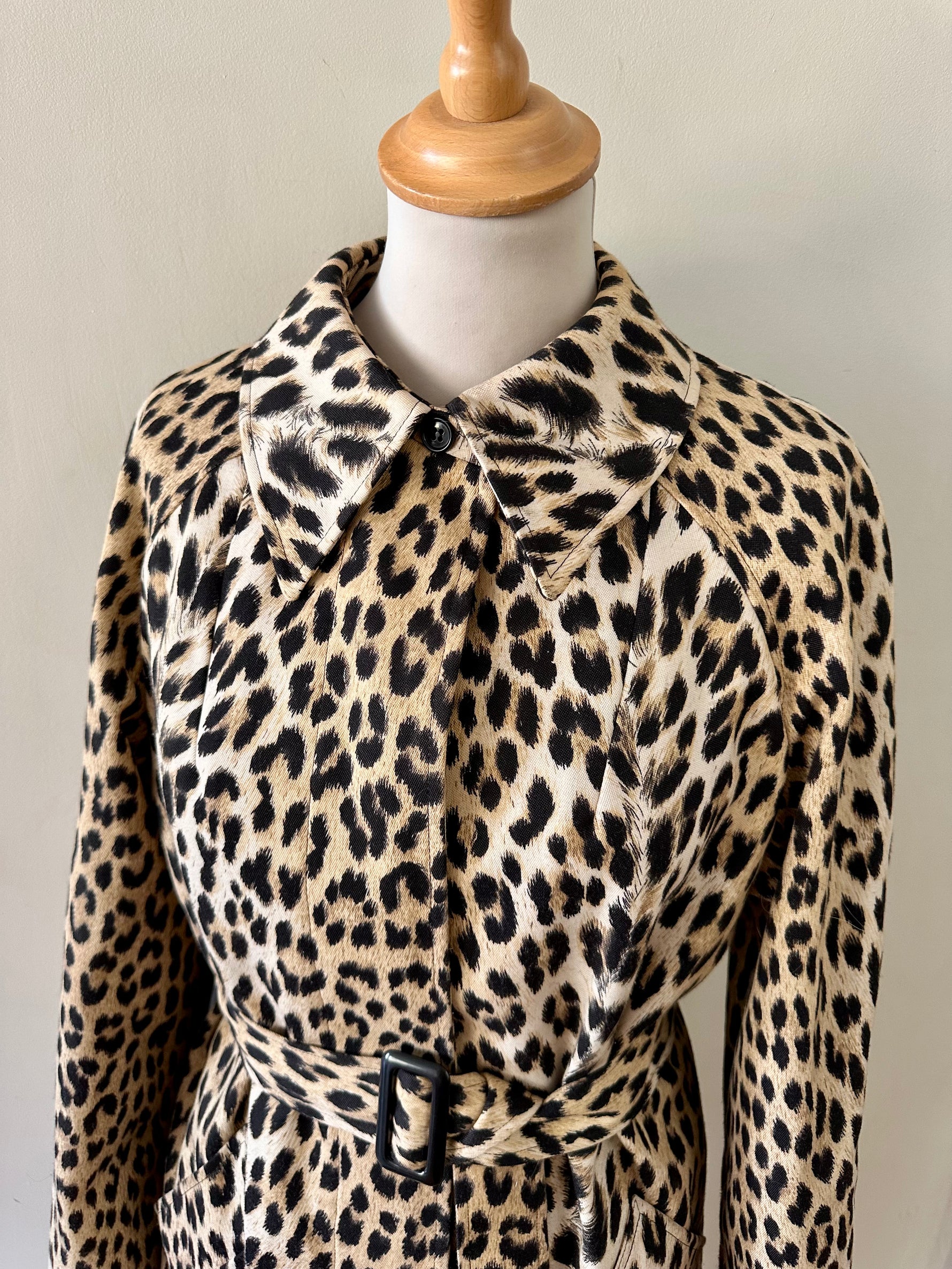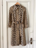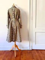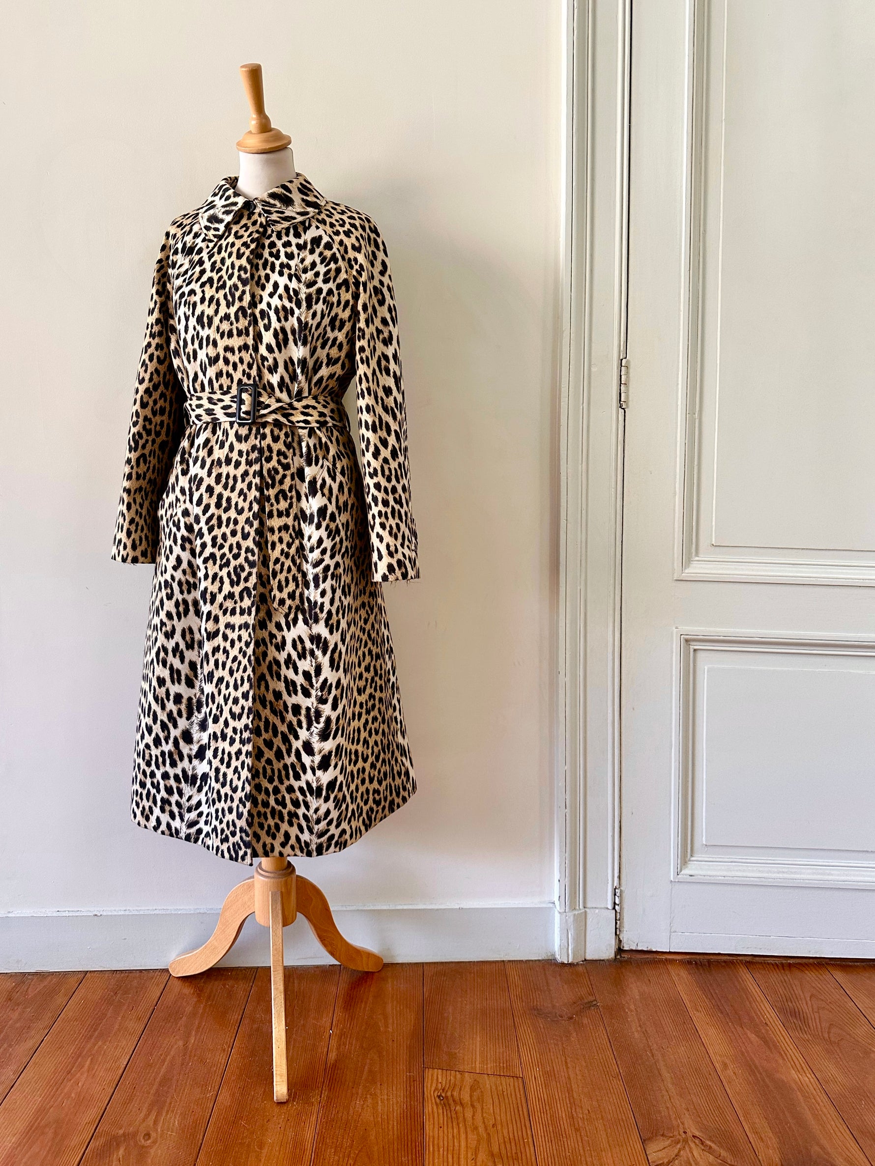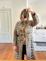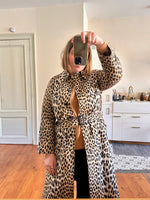 Prix unitaire parTrench léopard, en tergal, imprimé léopard beige, camel et noir, boutonnage droit, ceinture à boucle carrée noire, fabriqué en France, convient aux tailles 36 et 38, porté ici sur un mannequin T36 et ouvert sur une personne T40. Aisselles 47cm, Longueur 110cm.