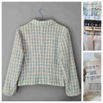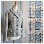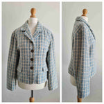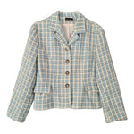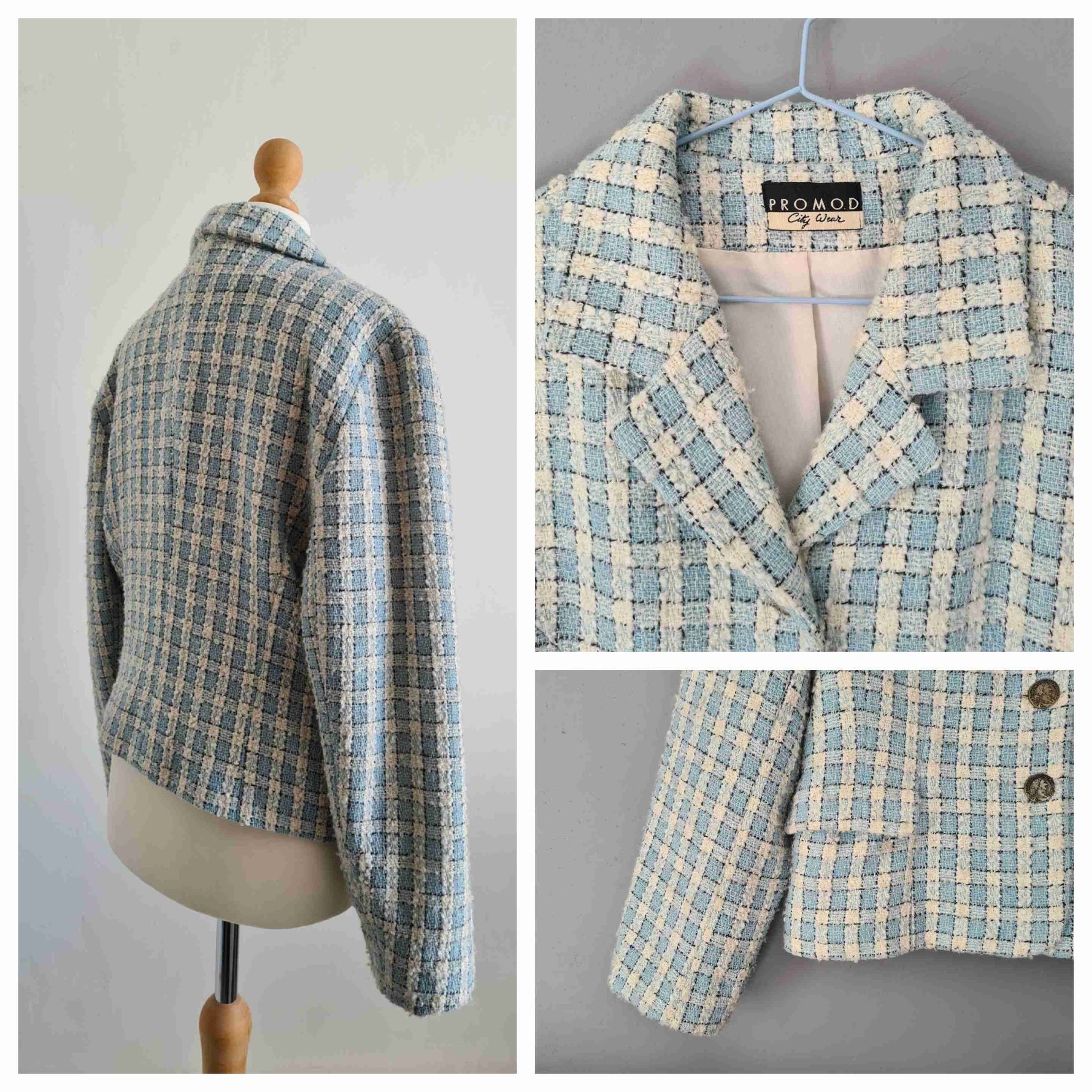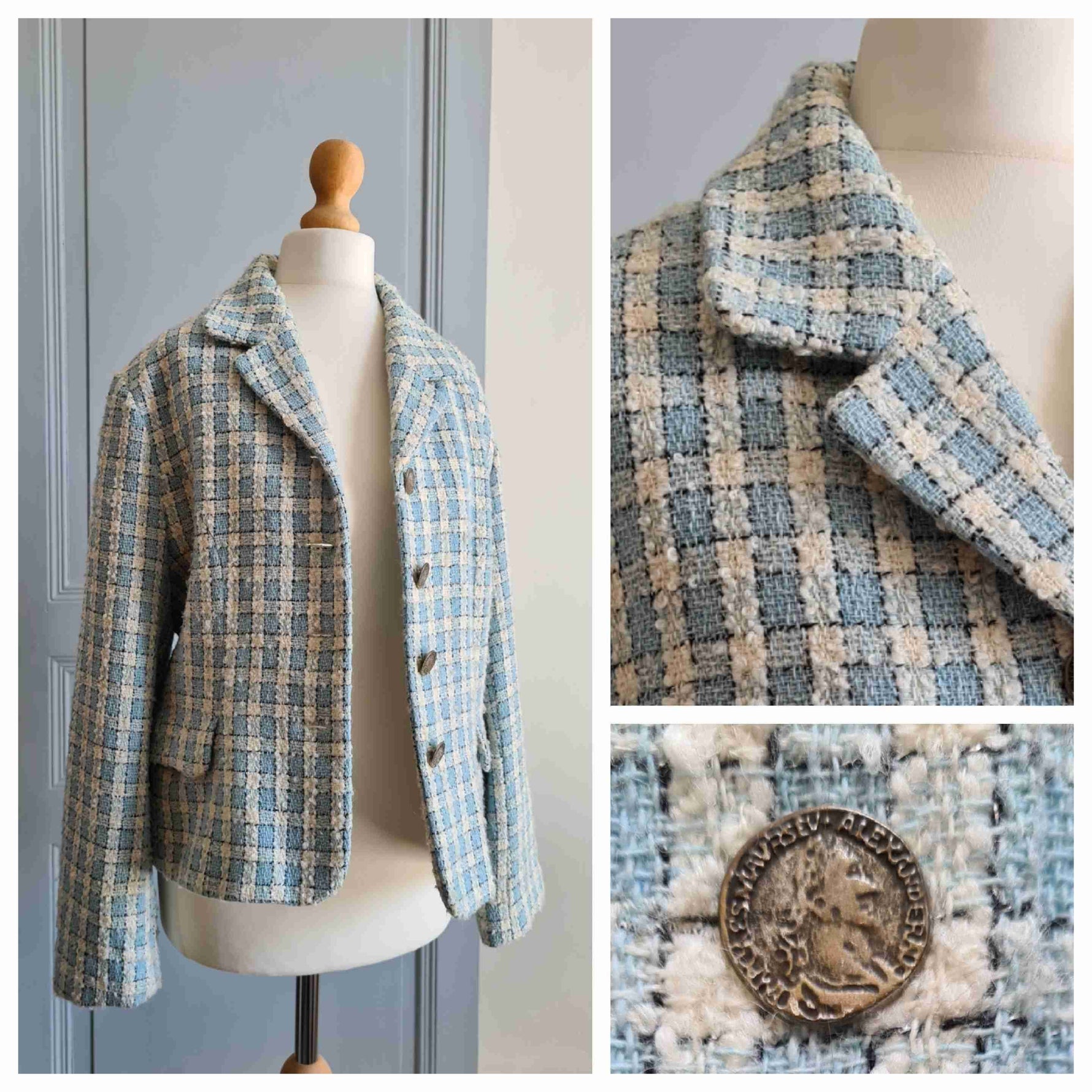 Prix unitaire parVeste courte à carreaux, bleu clair et écrue, en laine mélangée, deux petites poches à revers, boutons pièces en métal argenté vieilli. Doublée.